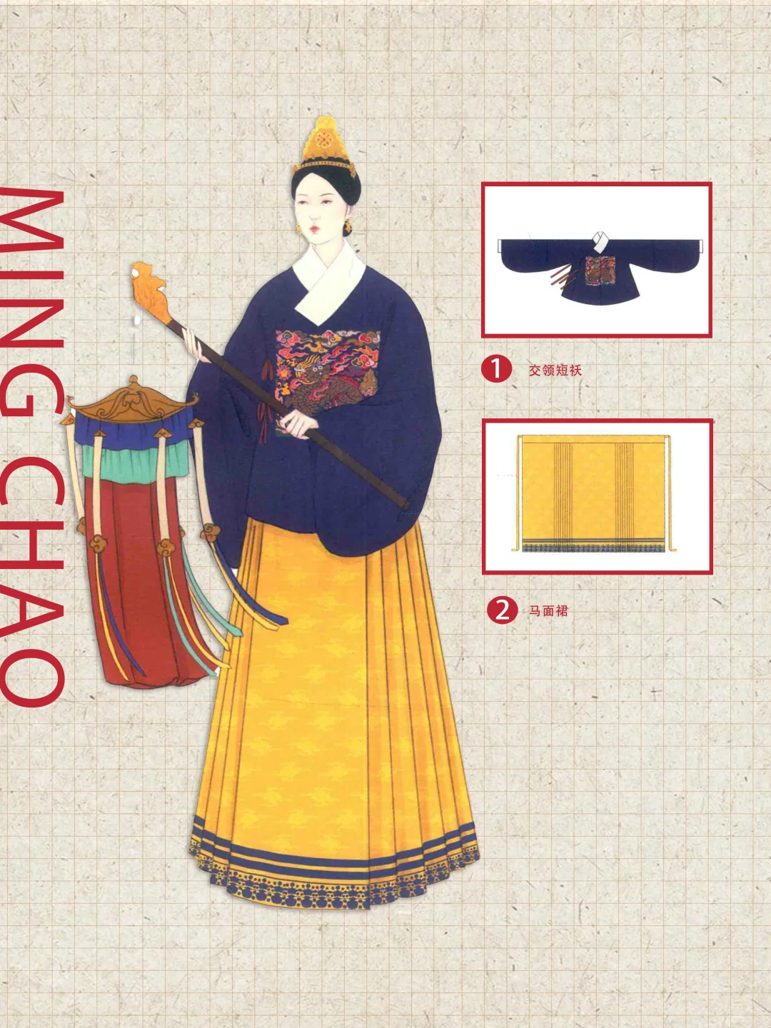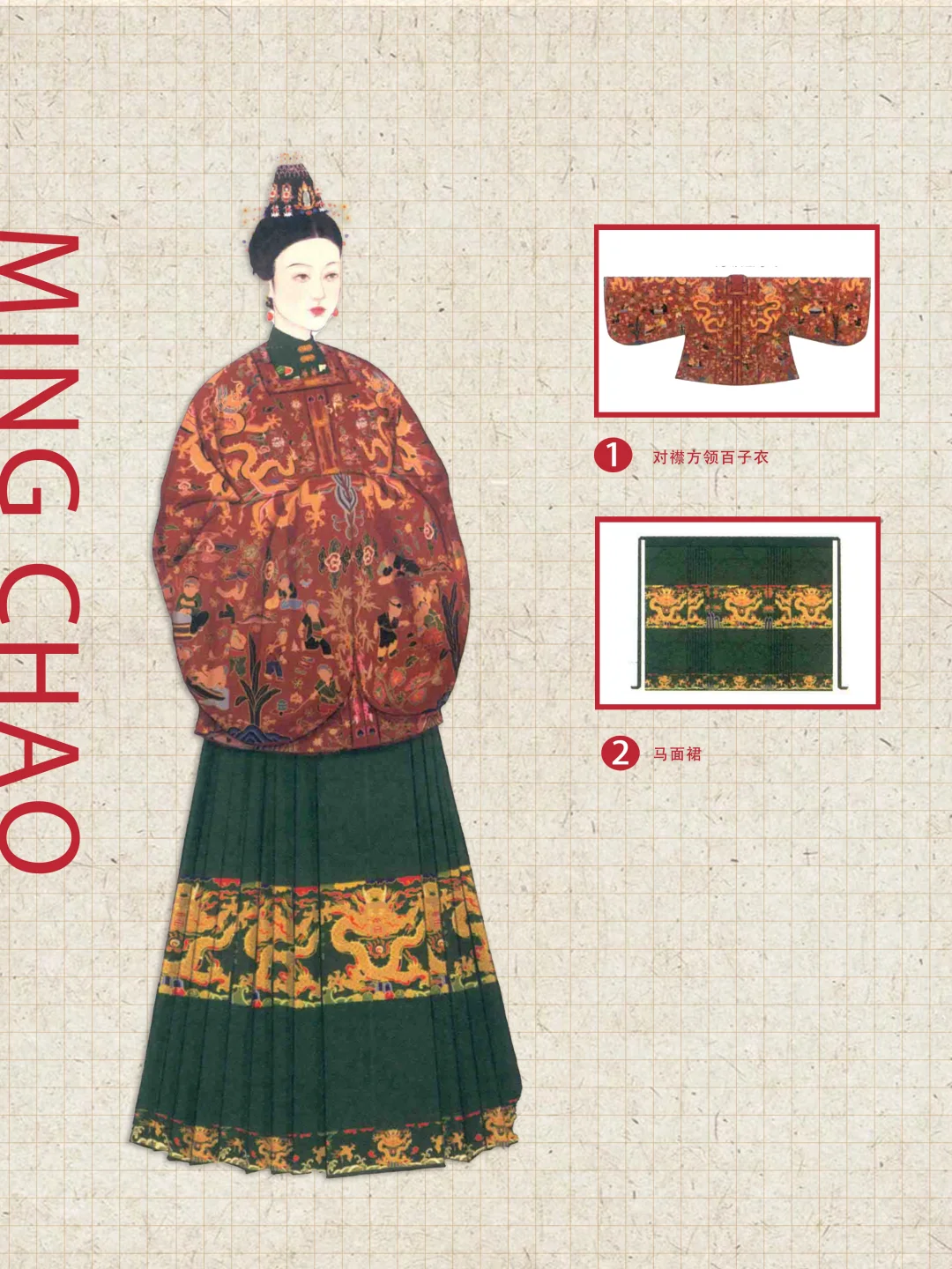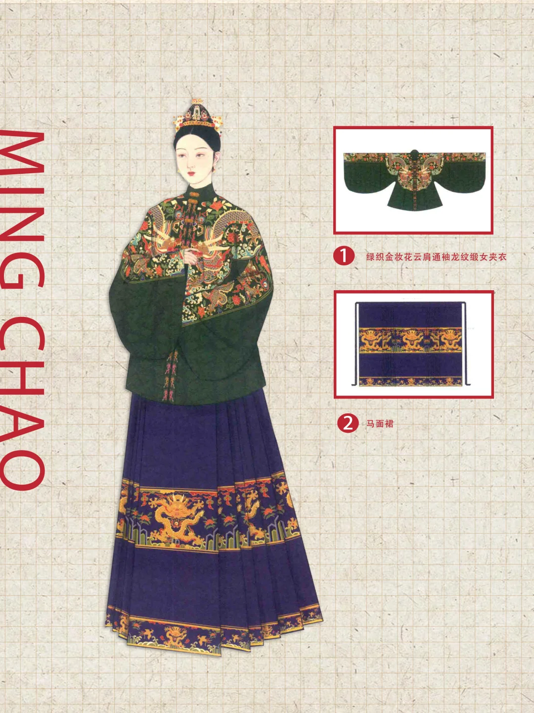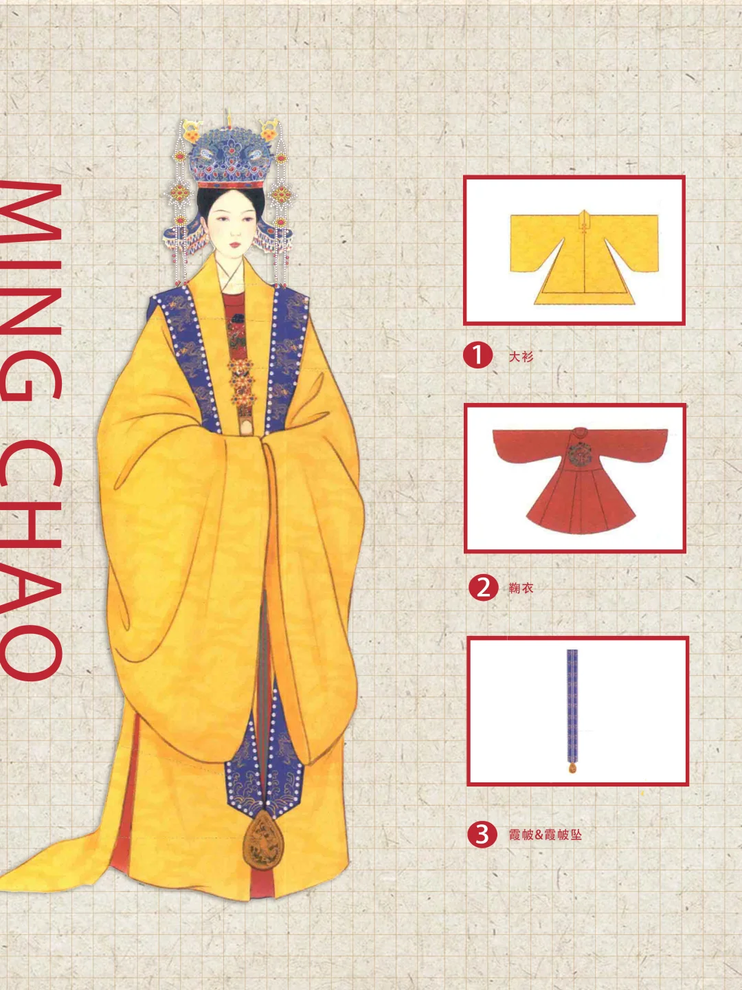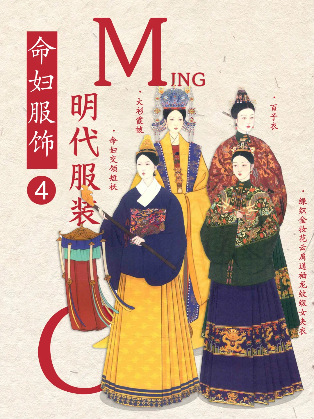 \n宝子们~\n\n【大明衣冠五部曲】第四期来啦!🎉\n本期聚焦明代女性的命妇服饰\nPS:内容来自《华夏衣橱》、《中国古代服饰史》\n——————————\n▪️ 【系列进度:4/5】\n1️⃣ 本期:命妇服饰\n2️⃣ 下期:女子日常\n3️⃣ 第一期:皇帝冠服\n4️⃣ 第二期:官员服饰\n5️⃣ 第三期:男子日常\n——————————\n→关注我,关关~关注我\n——————————\n✅ 皇后礼服\n- - 使用场景:受册、谒庙、朝会等国家级典礼\n1. 洪武三年定\n- 凤冠:冠用圆框+外冒翡翠+上饰九龙四凤+12花枝+双博鬓+12花钿\n- 服饰细节:祎衣(深青色+赤色五彩翟纹12)+内衬素纱中单+同色蔽膝\n- 配饰:同色大带+革带+青袜金舄\n2. 永乐三年\n- 凤冠:冠用漆竹丝圆框+外冒翡翠,用翠龙九,金凤四(中龙衔大珠 其他衔珠滴)+冠加翠云40片+大珠花12枝+小花12枝+三对博鬓等\n- 服饰细节:祎衣(深青色+赤色五彩翟纹12)+内衬素纱中单+同色蔽膝\n- 配饰:玉革带+大带+副带+绶+玉佩+青袜+描金云龙舄 (舄首加珠五颗)\n-\n✅ 皇后常服\n1、洪武三年定,双凤翊龙冠\n2、洪武四年更定龙凤珠翠冠,真红大袖衣,衣上加霞帔。红罗长裙,红褙子。首服特髻上加龙凤饰,衣用织金龙凤纹加绣\n3、永乐三年修改,\n皂为冠,附以翠博山,冠上饰金龙一,翊以珠翠凤二,都口衔珠滴,前后珠牡丹花2朵,花蕊8,翠叶36,珠翠镶花鬓二,珠翠云21片,翠口圈一副,金宝钿花九,上饰珠九颗,金风一对,口衔珠结。三博鬓(左右共六扇)等等\n-\n褙子—深青金绣团龙纹。\n鞠衣— 红色,前后织金云龙纹,或绣、或铺翠圈金,饰以珠。皇太子妃则用青色鞠衣。\n大带—红线罗为之,有缘。\n缘襁袄子—黄色、红领及袖端等皆织金采云龙纹。\n缘裙—红色,绿缘,织金采色云龙纹。\n玉带—青绮革带,描金云龙文,玉事件十,金事件三\n绶—玉花采结绶,白玉云样玎珰二如佩制,青袜,舄同翟衣,\n✅ 皇太子妃,用九翚四凤冠,服深青翟衣。如亲王妃、公主等冠服依次而递减。\n✅ 品官命妇\n洪武五年定,二十四年修改\n- - 使用场景:正式典礼\n1、一品二品霞帔,褙子,用云霞翟文\n2、三品、四品霞帔,褙子用云霞孔雀文\n3、五品霞帔,褙子,用云霞鸳鸯纹;\n4、六品用云霞练鹊文。\n5、七品霞帔,褙子,与六品同;八品、九品霞帔用缠枝花,褙子绣摘枝团花。\n#明制汉服 #传统服饰 #明代 #汉服 #君子正衣冠 #跨越千年的华夏衣冠之美 #明代服饰 #中式审美 #汉服搭配