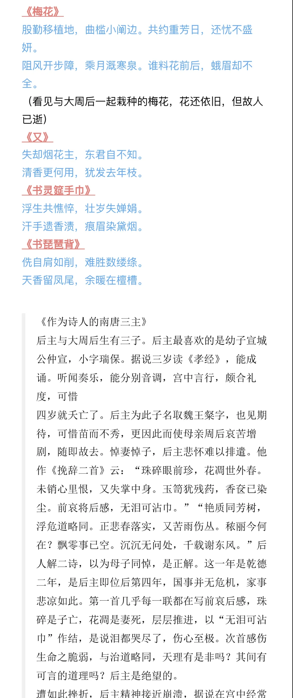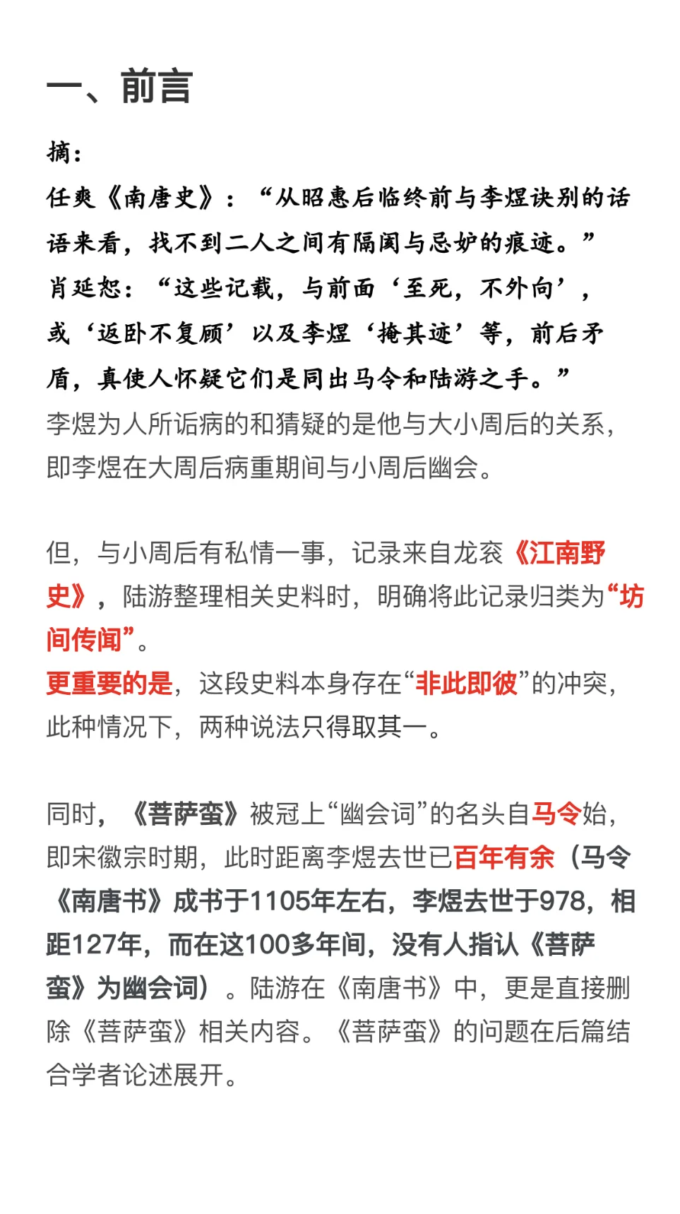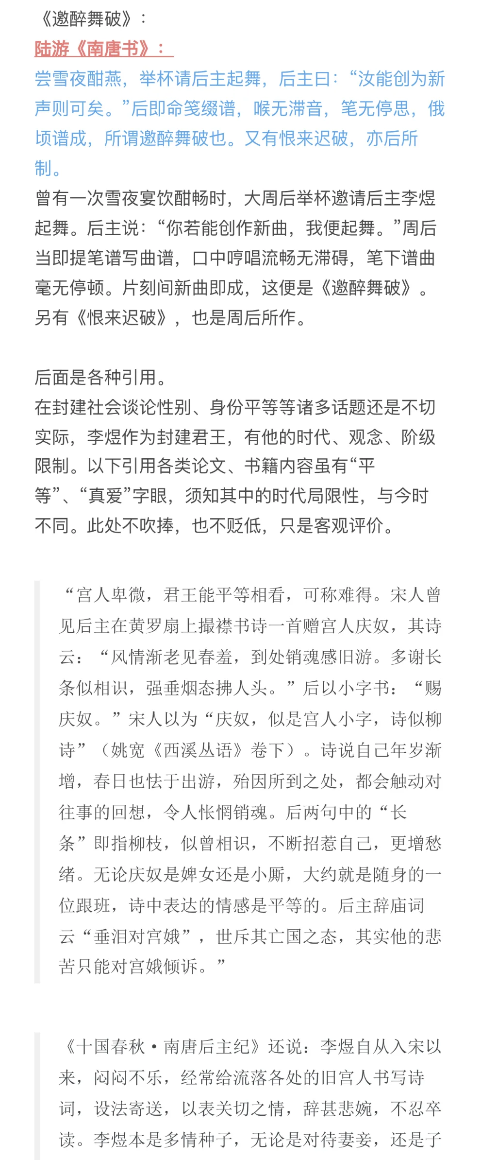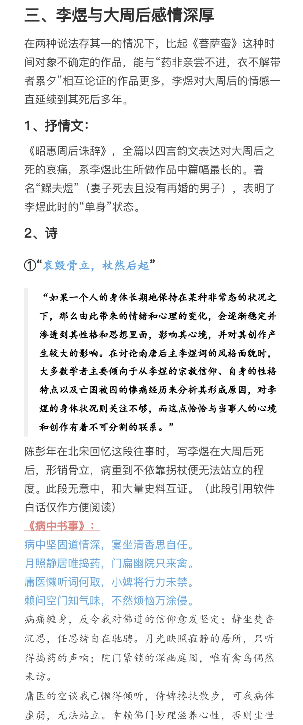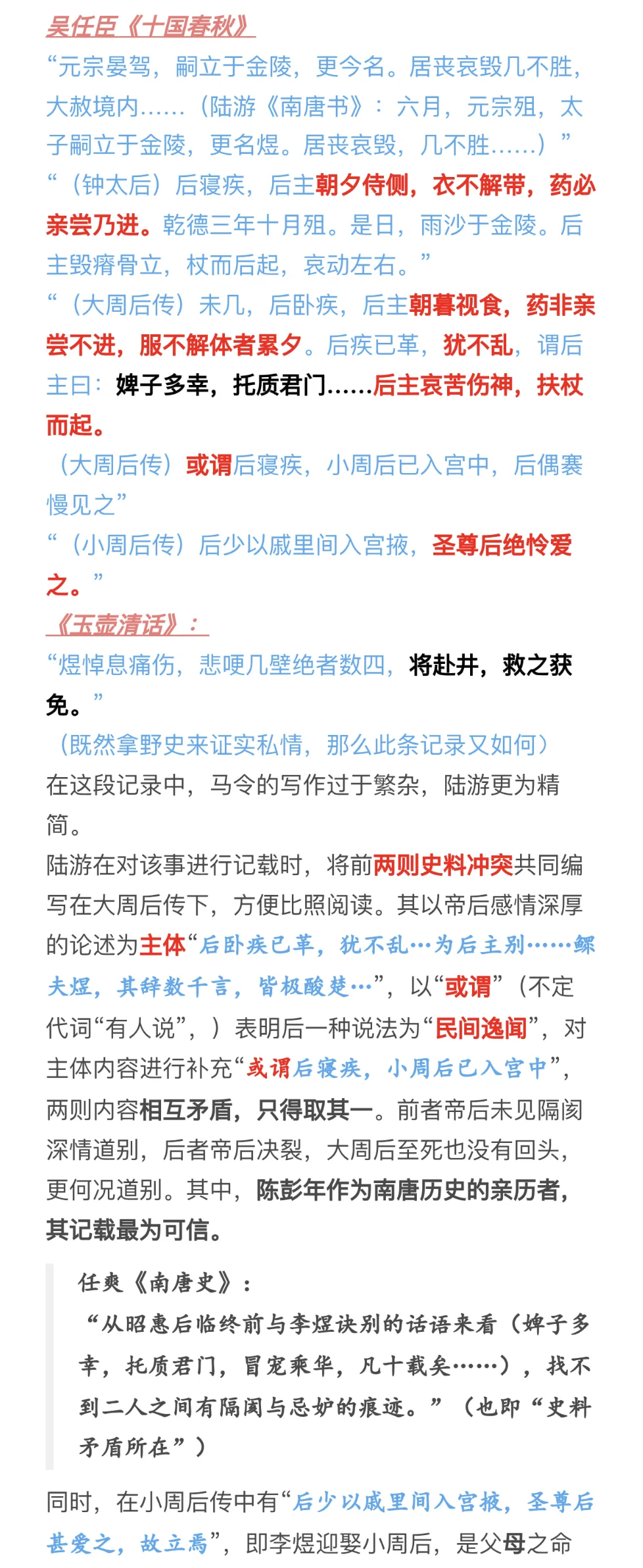因为上一个版本有疑问,且最近这方面问题蛮多的,再写一篇[抽泣R]\np3-6:史料冲突(和第一版差别不大)\np6-8:《菩萨蛮》不合理之处(有新增)\np9-12:李煜与大周后感情深厚(有新增)\np12-15:时间不合理(新增)\np15-17:其他(新增)\n \n参考:《南唐史》、《李煜<菩萨蛮>三首非为小周后所作》、《亡国之音:本事与宋人对李后主词的阐释》、《Lyric Poets of The Southern T\'ang:Feng Yen-ssu, 903-960, and Li Yu, 937-978》、《武夫当国》、《作为诗人的南唐三主》、《论李煜其人》、《风流才子,误作人主》、“汉诗大观”\n \n#李煜 #史同