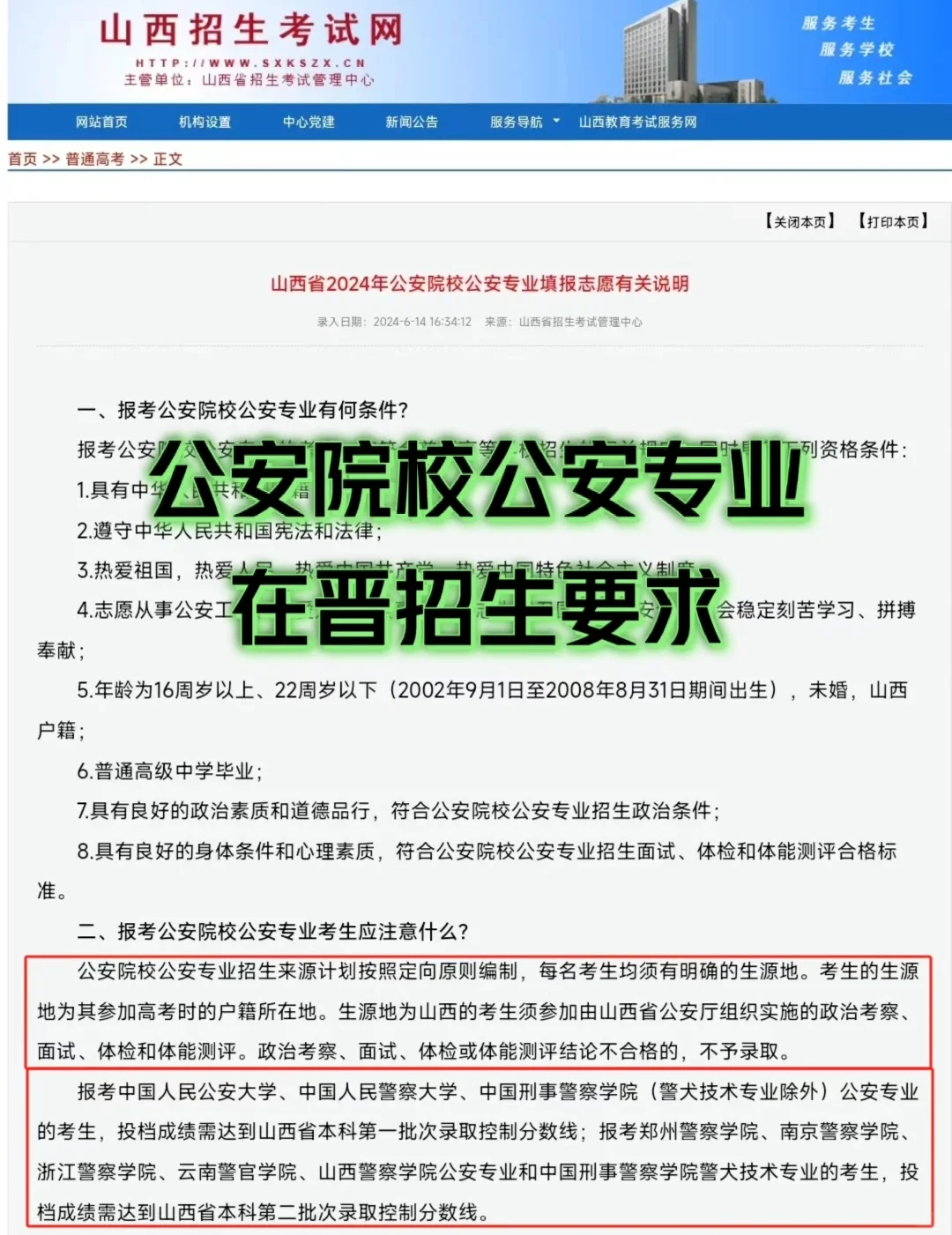 ⭕️报考中国人民公安大学、中国人民警察大学、中国刑事警察学院(警犬技术专业除外)公安专业的考生,投档成绩需达到山西省本科第一批次录取控制分数线;\n⭕️报考郑州警察学院、南京警察学院、浙江警察学院、云南警官学院、山西警察学院公安专业和中国刑事警察学院警犬技术专业的考生,投档成绩需达到山西省本科第二批次录取控制分数线。\n⭕️公安院校公安专业本科招生投档录取统一安排在提前批次单独开展。\n⭕️公安院校在公安专业学生入学后2个月内,组织开展报考资格复审、生源地复核、入警就业面向复核、政治考察复核、档案复审和体检复检等复查工作。复查合格的,予以注册学籍;不合格的,取消入学资格。#高考志愿填报 #高考志愿不懂就问 #公安院校 #公安专业 #公安院校报考 #山西高考志愿填报 #高考志愿填报指导 #高考志愿填报高考升学规划