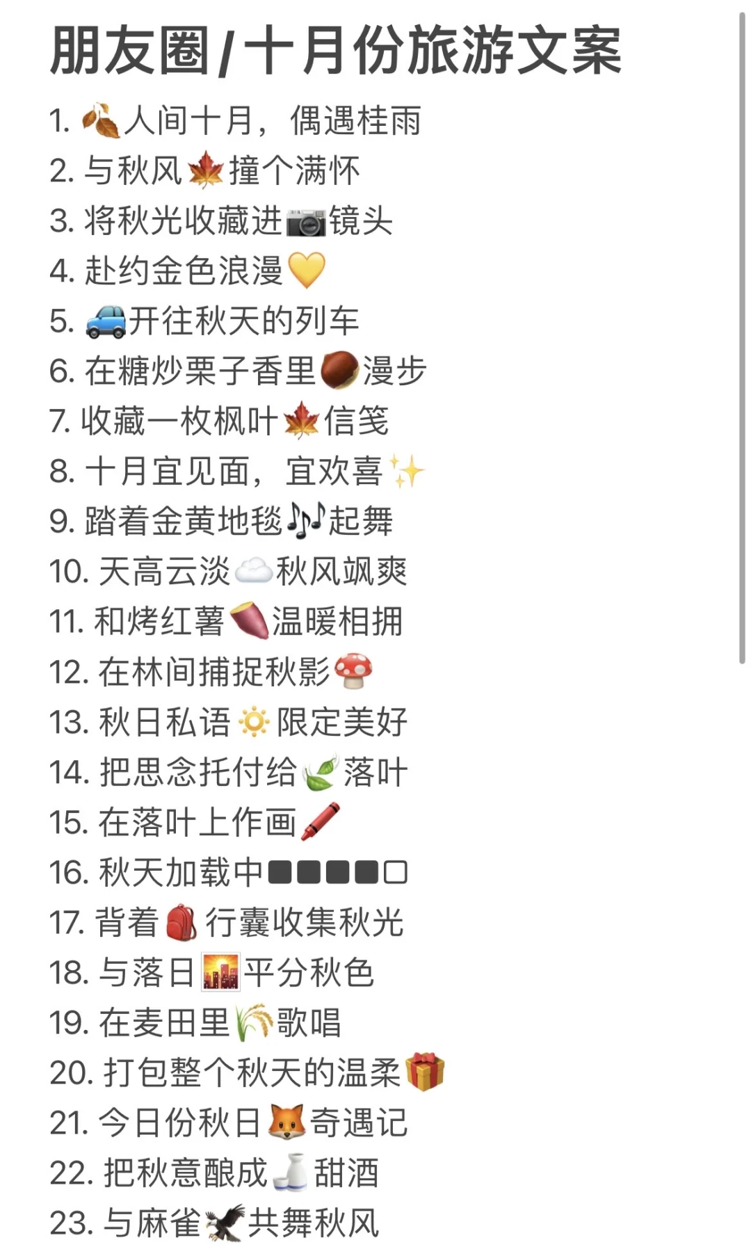 1. 🍂人间十月,偶遇桂雨\n2. 与秋风🍁撞个满怀\n3. 将秋光收藏进📷镜头\n4. 赴约金色浪漫💛\n5. 🚙开往秋天的列车\n6. 在糖炒栗子香里🌰漫步\n7. 收藏一枚枫叶🍁信笺\n8. 十月宜见面,宜欢喜✨\n9. 踏着金黄地毯🎶起舞\n10. 天高云淡☁️秋风飒爽\n11. 和烤红薯🍠温暖相拥\n12. 在林间捕捉秋影🍄\n13. 秋日私语🔅限定美好\n14. 把思念托付给🍃落叶\n15. 在落叶上作画🖍️\n16. 秋天加载中■■■■□\n17. 背着🎒行囊收集秋光\n18. 与落日🌇平分秋色\n19. 在麦田里🌾歌唱\n20. 打包整个秋天的温柔🎁\n21. 今日份秋日🦊奇遇记\n22. 把秋意酿成🍶甜酒\n23. 与麻雀🦅共舞秋风\n24. 骑着单车🚲穿过光影\n25. 十月的风藏着惊喜🎐\n26. 从长椅上跌入🍂深秋\n27. 把夕阳🌇装进画框\n28. 和秋景同框📸定格\n29. 秋风凉🎑宜相逢\n30. 在篝火旁数银河🔥\n31. 带着微凉秋意🧣回家\n32. 捉住秋日的🦋光影\n33. 十月尾声🎊收获满满\n34. 与秋日轻轻说再见🤎\n35. 在书店里📖读秋诗\n36. 踩着沙沙落叶🎵前行\n37. 把秋色披在🧣肩头\n38. 在霜露中❄️觅秋痕\n39. 秋日露营⛺️进行时\n40. 十月碎片🧩拼成诗\n#分享文案 #简约文案 #旅行的朋友圈文案 #朋友圈高级文案 #生活文案 #小众高级文案 #文案素材分享 #旅游文案 #温柔小众文案