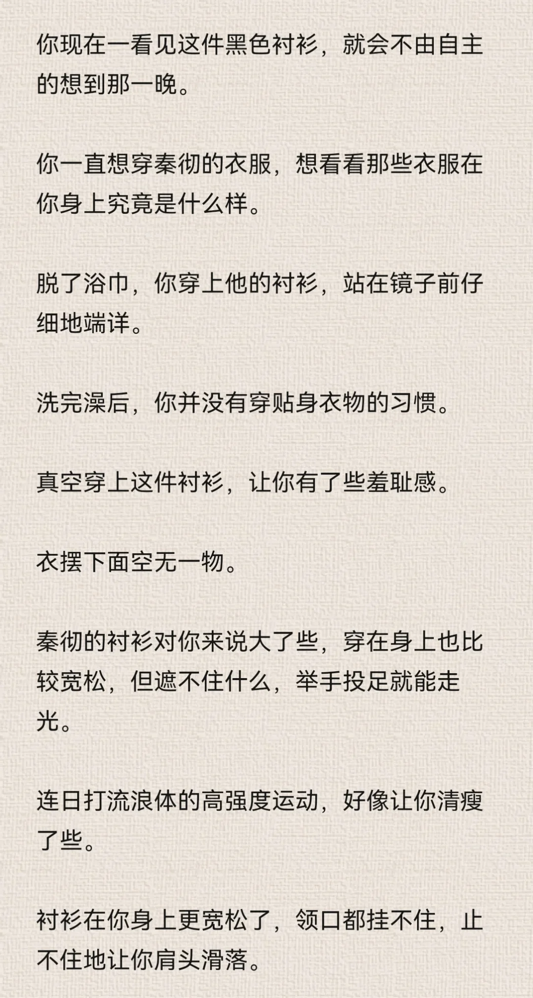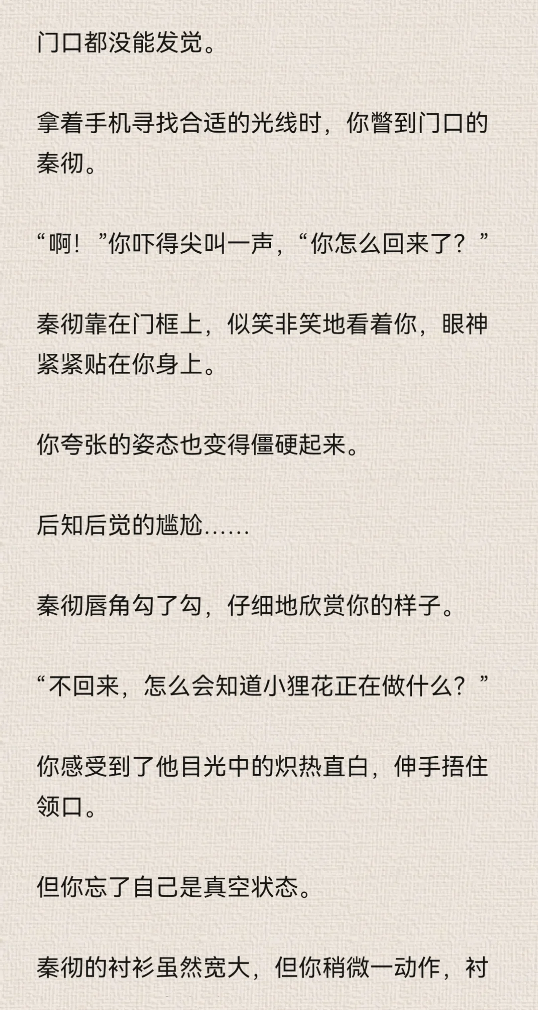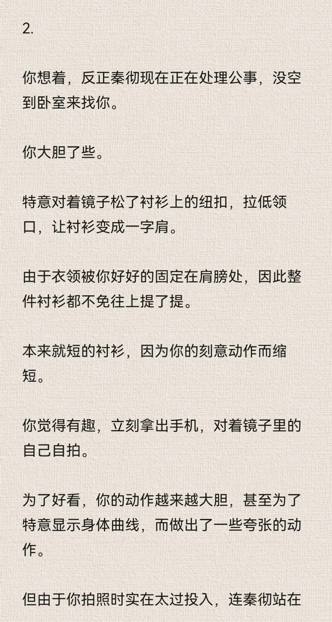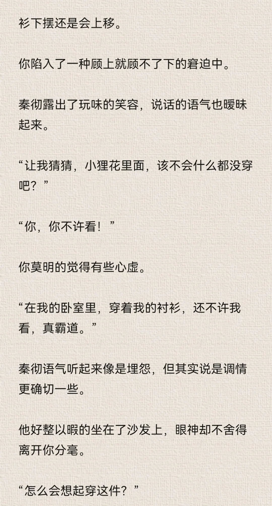 你想着,反正秦彻现在正在处理公事,没空到卧室来找你。\n你大胆了些。\n特意对着镜子松了衬衫上的纽扣,拉低领口,让衬衫变成一字肩。\n由于衣领被你好好的固定在肩膀处,因此整件衬衫都不免往上提了提。\n本来就短的衬衫,因为你的刻意动作而缩短。\n你觉得有趣,立刻拿出手机,对着镜子里的自己自拍。\n为了好看,你的动作越来越大胆,甚至为了特意显示身体曲线,而做出了一些夸张的动作。\n但由于你拍照时实在太过投入,连秦彻站在门口都没能发觉。\n拿着手机寻找合适的光线时,你瞥到门口的秦彻。\n“啊!”你吓得尖叫一声,“你怎么回来了?”\n秦彻靠在门框上,似笑非笑地看着你,眼神紧紧贴在你身上。\n你夸张的姿态也变得僵硬起来。\n后知后觉的尴尬……\n秦彻唇角勾了勾,仔细地欣赏你的样子。\n“不回来,怎么会知道小狸花正在做什么?”\n你感受到了他目光中的炽热直白,伸手捂住领口。\n但你忘了自己是真空状态。\n秦彻的衬衫虽然宽大,但你稍微一动作,衬衫下摆还是会上移。\n你陷入了一种顾上就顾不了下的窘迫中。\n秦彻露出了玩味的笑容,说话的语气也暧昧起来。\n“让我猜猜,小狸花里面,该不会什么都没穿吧?”\n“你,你不许看!”\n你莫明的觉得有些心虚。\n“在我的卧室里,穿着我的衬衫,还不许我看,真霸道。”\n秦彻语气听起来像是埋怨,但其实说是调情更确切一些。#乙女向 #同人文 #秦彻 #恋与深空