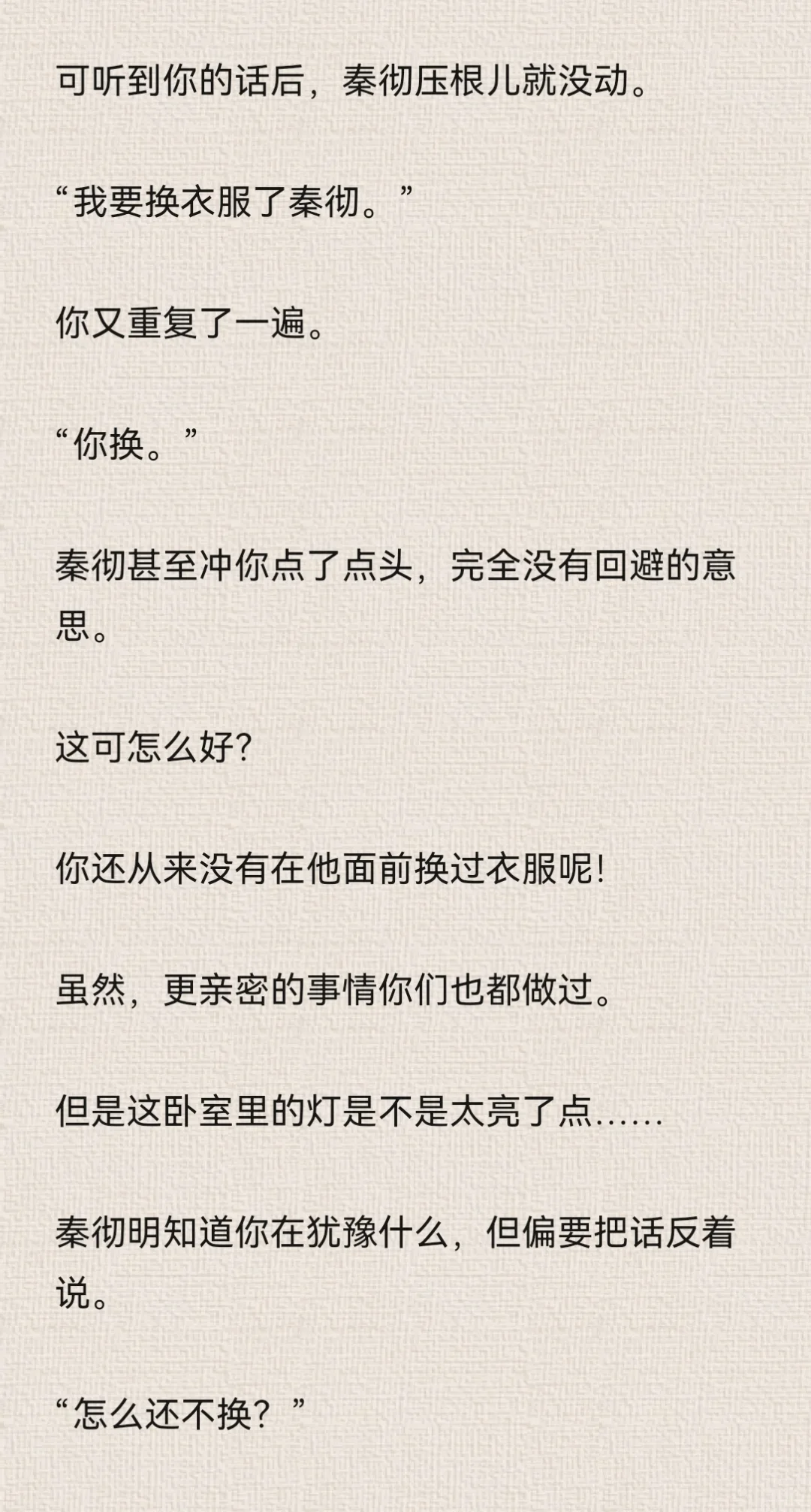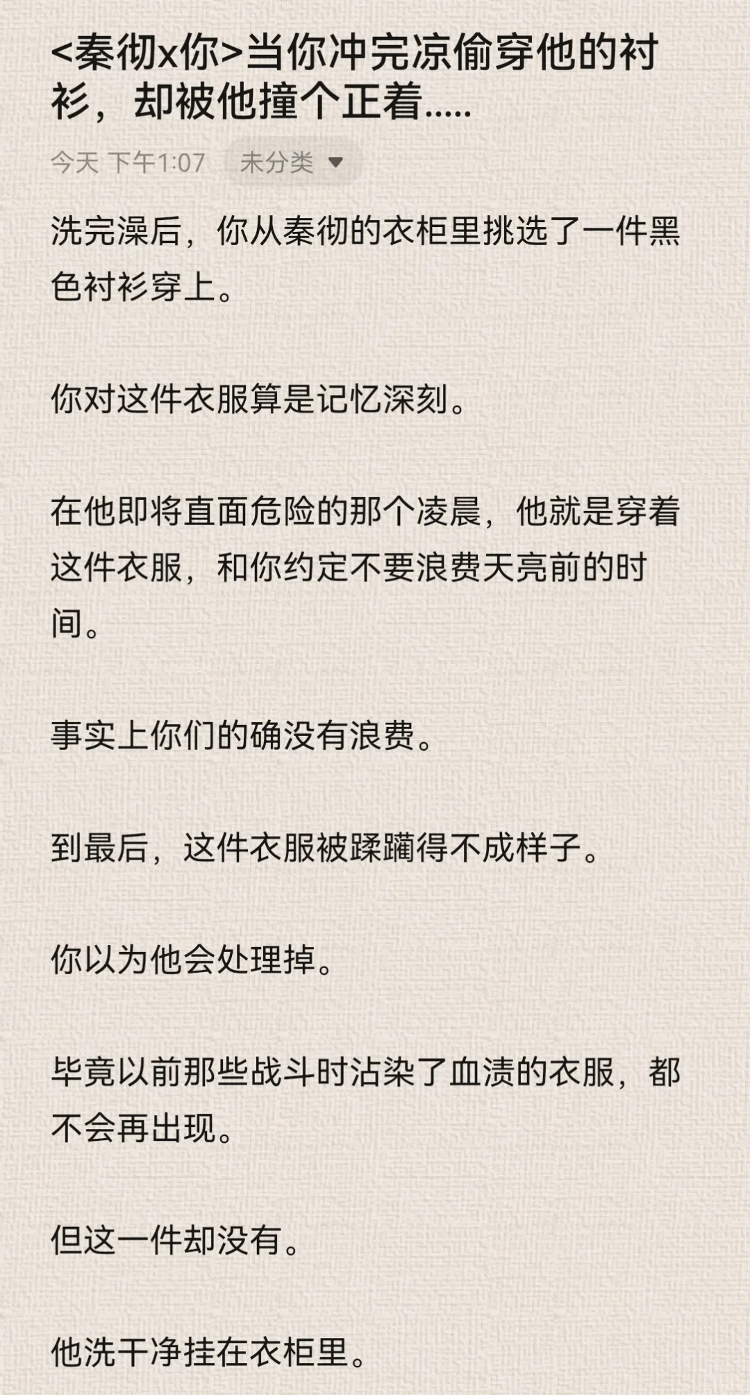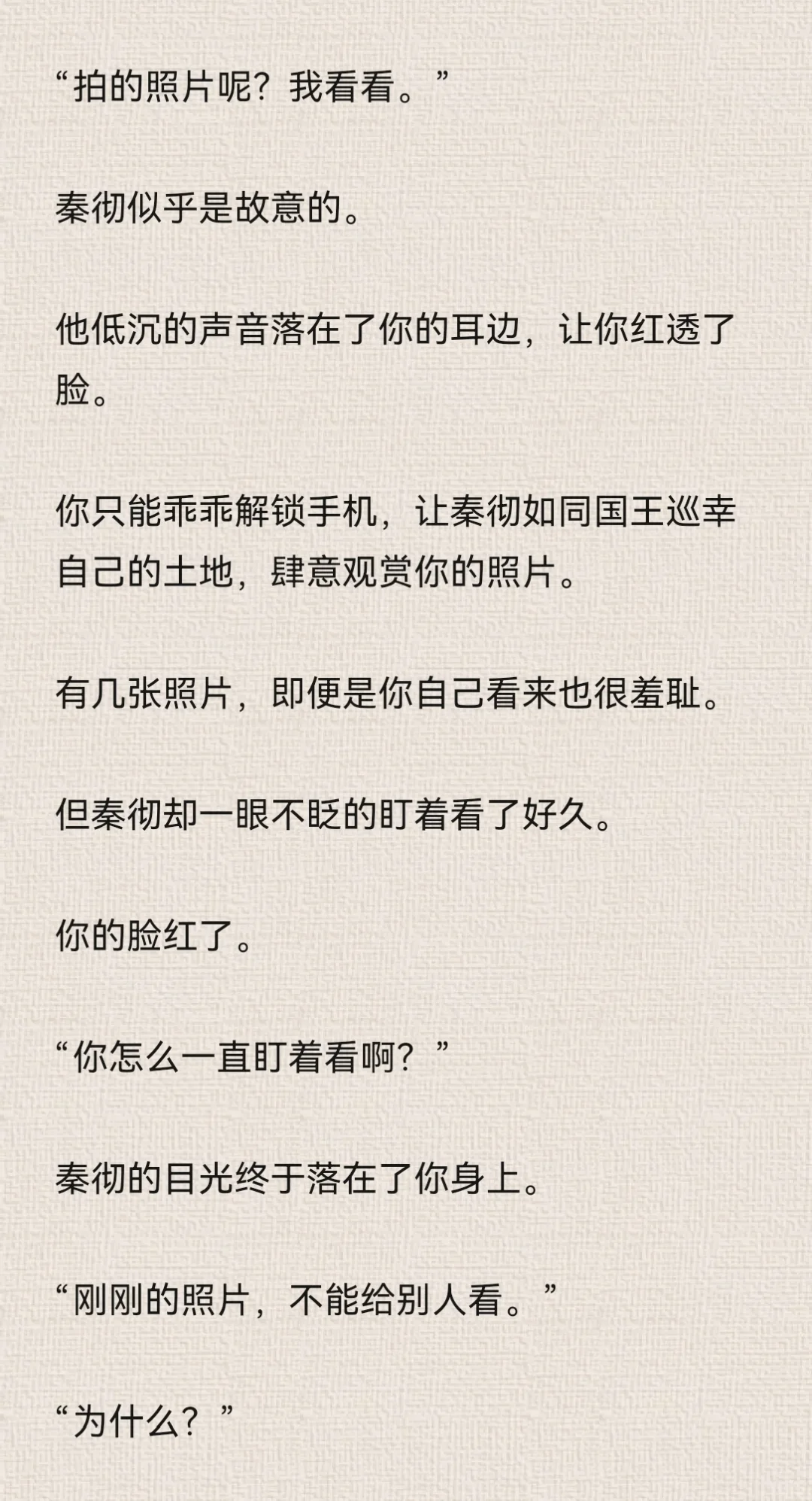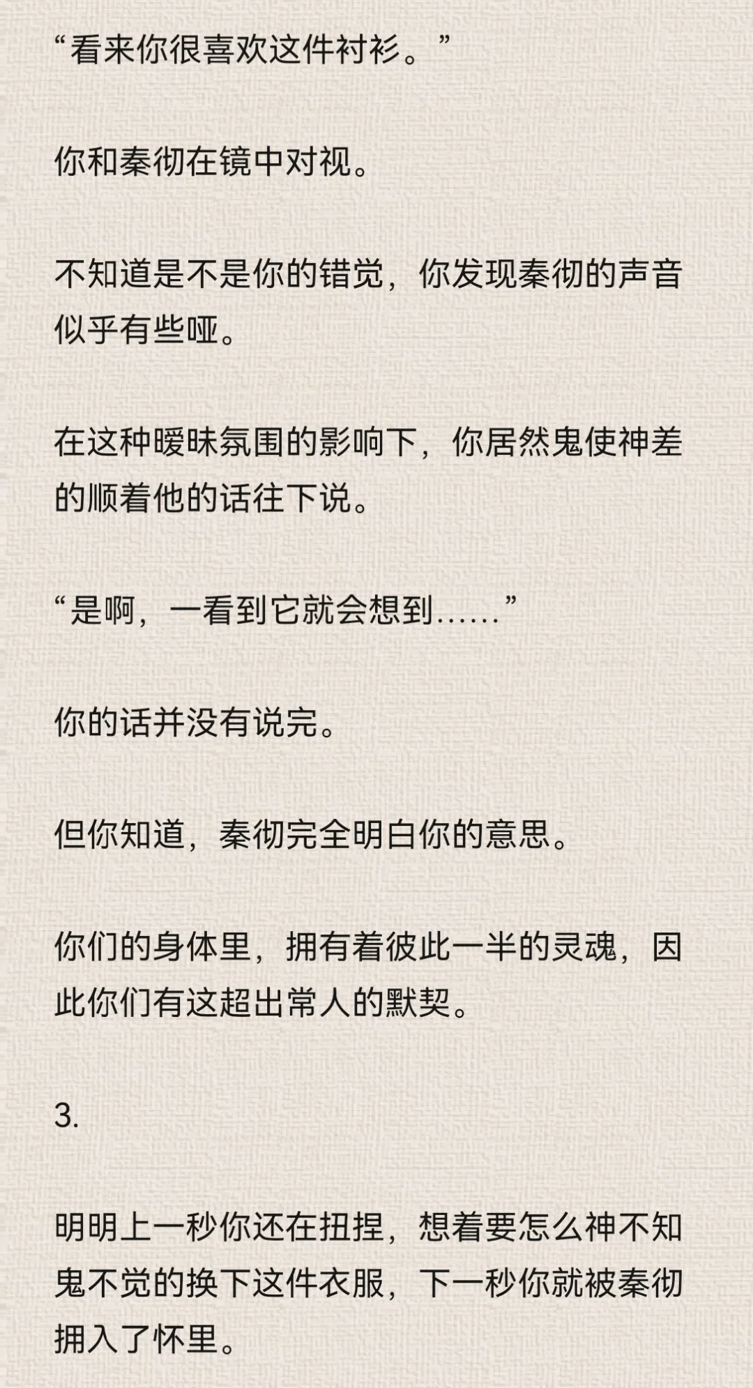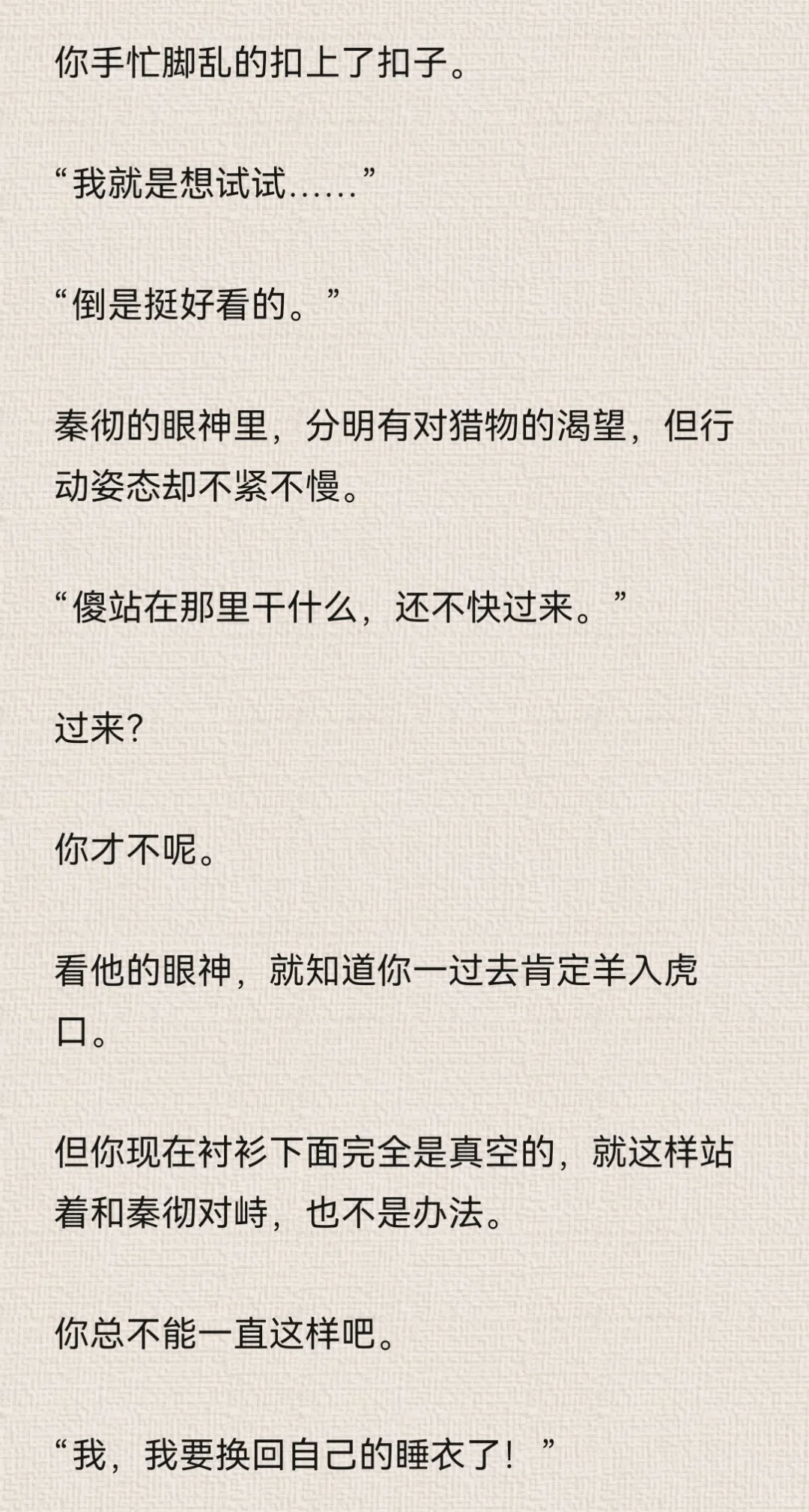 你想着,反正秦彻现在正在处理公事,没空到卧室来找你。\n你大胆了些。\n特意对着镜子松了衬衫上的纽扣,拉低领口,让衬衫变成一字肩。\n由于衣领被你好好的固定在肩膀处,因此整件衬衫都不免往上提了提。\n本来就短的衬衫,因为你的刻意动作而缩短。\n你觉得有趣,立刻拿出手机,对着镜子里的自己自拍。\n为了好看,你的动作越来越大胆,甚至为了特意显示身体曲线,而做出了一些夸张的动作。\n但由于你拍照时实在太过投入,连秦彻站在门口都没能发觉。\n拿着手机寻找合适的光线时,你瞥到门口的秦彻。\n“啊!”你吓得尖叫一声,“你怎么回来了?”\n秦彻靠在门框上,似笑非笑地看着你,眼神紧紧贴在你身上。\n你夸张的姿态也变得僵硬起来。\n后知后觉的尴尬……\n秦彻唇角勾了勾,仔细地欣赏你的样子。\n“不回来,怎么会知道小狸花正在做什么?”\n你感受到了他目光中的炽热直白,伸手捂住领口。\n但你忘了自己是真空状态。\n秦彻的衬衫虽然宽大,但你稍微一动作,衬衫下摆还是会上移。\n你陷入了一种顾上就顾不了下的窘迫中。\n秦彻露出了玩味的笑容,说话的语气也暧昧起来。\n“让我猜猜,小狸花里面,该不会什么都没穿吧?”\n“你,你不许看!”\n你莫明的觉得有些心虚。\n“在我的卧室里,穿着我的衬衫,还不许我看,真霸道。”\n秦彻语气听起来像是埋怨,但其实说是调情更确切一些。#乙女向 #同人文 #秦彻 #恋与深空