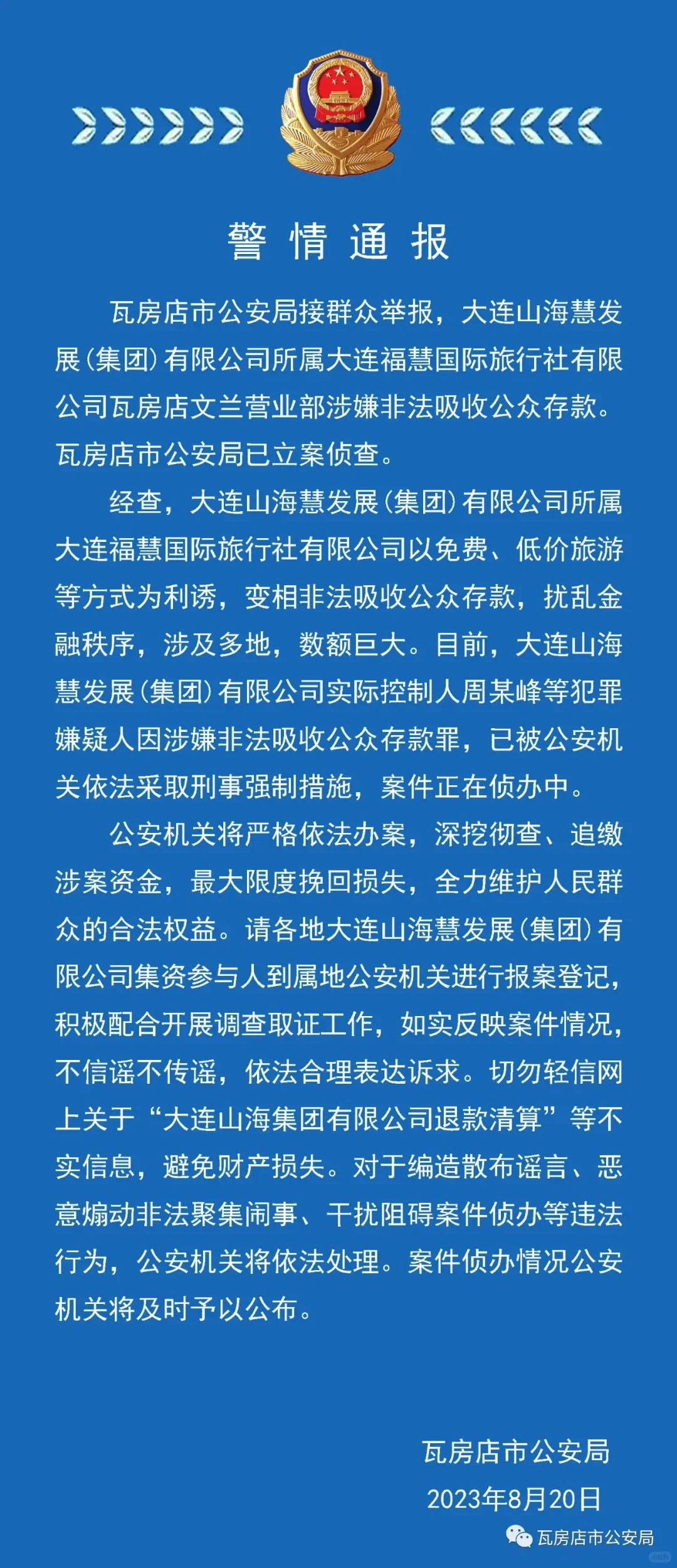 今天,我接到朋友的紧急电话,说有位女士遇到了经济纠纷类的案件需要我的帮助解决。我驱车前往约定地点,与这位女士会面了解案情。\n这位女士跟我讲了她在大连山海旅行社集团公司宁波分公司投资了一个项目,定期返还利息那种。根据原先约定,她至今本应收回投资本金和允诺的利息,可是现在连人都联系不上了。我听起来感觉很不对劲,就把涉案公司的名字放进搜索栏,直接看到一周前的新闻,该旅行社集团公司的实际控制人因非法吸收公众存款、集资诈骗已被刑拘。我意识到她这个肯定是被集资诈骗了。\n这位女士还一直跟我讲说要去法院起诉,我打断了她。直接带着她前往当地公安分局经侦大队,详细说明了案情,叔叔说已经立案调查了,给这位女士先做了登记,后续进展会随时通知。\n各位友友,一定一定多提醒家里的长辈、老人谨慎对待高利率投资理财产品,避免集资诈骗。不要贪图高回报而忽视风险,仔细研究投资机构背景,不要轻易相信陌生人。保持警觉和理智,选择可靠投资途径,向专业人士咨询。如遇诈骗,及时报案,祝您财务安全!#宁波律师#经济纠纷#集资诈骗#大连山海慧发展集团