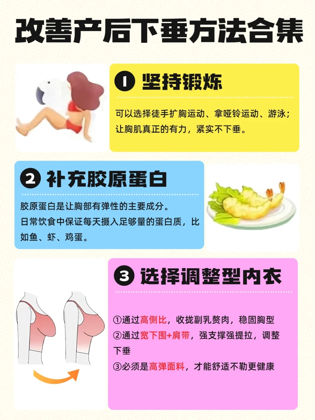 🍧首先,拒绝焦虑!\n🍧如果断奶没有经过循序渐进的漫长过程\n🍧那就几乎没有谁能逃得过🐻部变的软榻干瘪\n🍧这并不是自己的错,请不要自卑\n \n🌸人体有强大的自愈力和恢复力,在断奶三个月后,rf开始快速恢复。\n🌸虽然很难恢复到少女期,但做好以下3个方面的功课,起码能恢复80%\n1⃣穿衣:坚持穿宽肩带、薄胸垫、下收贴合、托举功能好的内衣。\n2⃣饮食:可以多吃鱼、虾、蛋、奶、豆制品,其中鱼皮有丰富的胶原。(但是有甲状腺问题和卵巢疾病的宝妈,就不要这么吃了)\n4⃣锻炼:有条件的,可以常去游泳。\n#产后下垂 #产后修复 #产后恢复 #胸下垂 #下垂胸 #大胸内衣 #大胸显小 #大胸 #产后