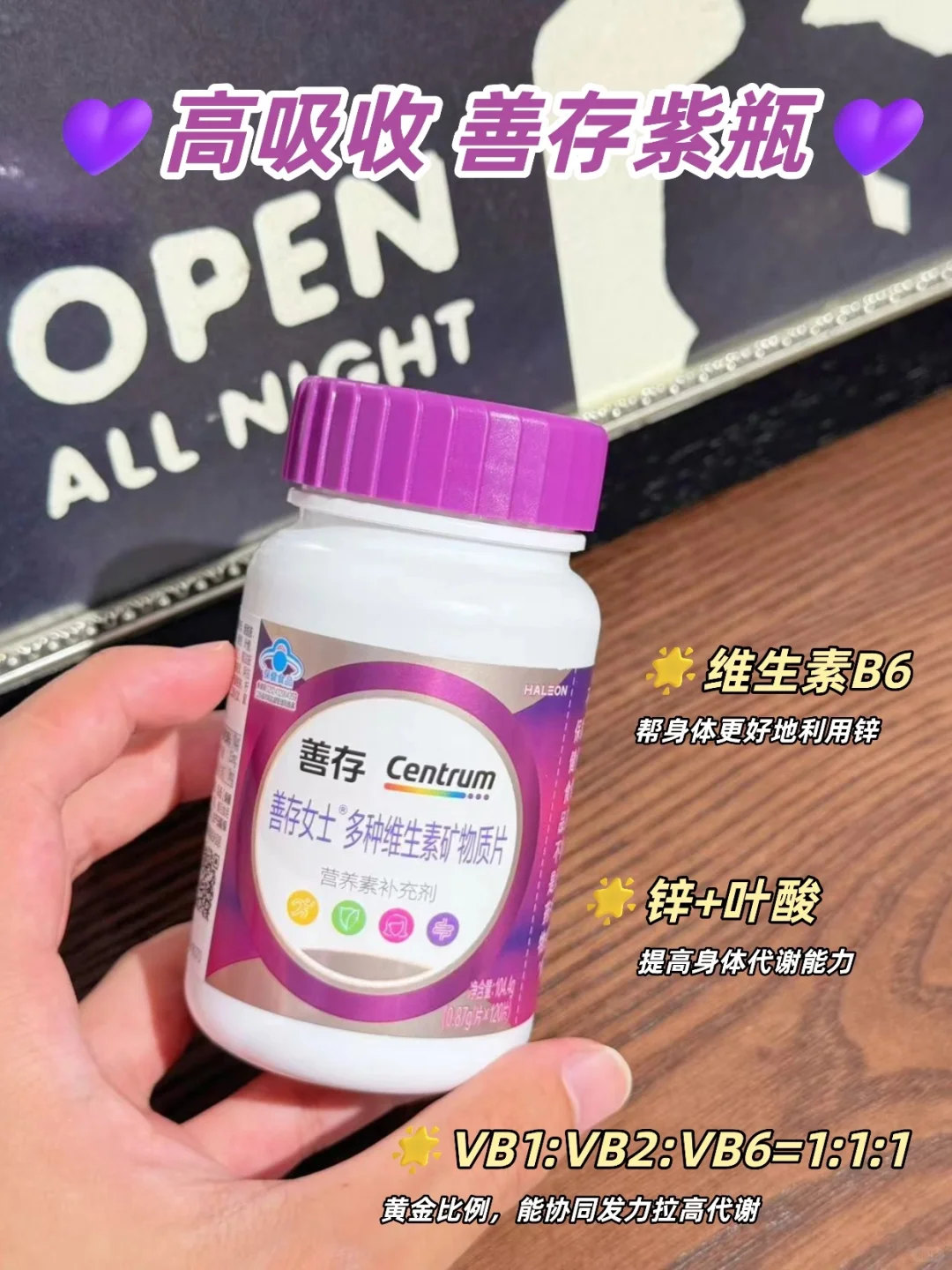 减肥时顿顿算卡路里,真的快把我逼疯了!\n之前为了掉秤,我每天吃饭像做数学题\n早餐一片面包多少卡,午餐鸡胸肉煮多久不超量\n本子记满好几本,体重却纹丝不动!\n直到刷到营养师说\n“光算卡路里有啥用,身体缺营养、代谢跟不上,再算也没用!”\n原来我顿顿算热量\n却把关键的锌、叶酸、维生素 B 族都给 “算没了”\n维生素B族能促进锌的吸收\n锌支持蛋白质合成、促进叶酸吸收的重要矿物质。补充锌不仅能维持肌肉量,是实现健康减重不可或缺的一环。\n缺了锌+叶酸,代谢没动力,就算吃得再少也瘦不下来缺了维生素B族,营养无法转换成能量,代谢过程像卡了壳\n搞懂这些我直接放弃算卡路里\n入手了闺蜜安利的💜高吸收 善存紫瓶💜\n没想到居然打开了减肥新世界\n它里面有富含22 种营养元素,多种维矿和膳食纤维,而且锌、叶酸、维生素 B 族全都有\n不用自己瞎搭配,一瓶就把代谢需要的营养补得明明白白\n尤其是 VB1:VB2:VB6 = 1:1:1 的黄金比例,符合权威推荐\n能协同发力拉高代谢mini 小颗粒,每天早餐后吃两粒\n一口温水就咽下去了,完全不卡嗓子\n善存是专研复维 40 多年的国际大品牌\n💜高吸收 善存紫瓶💜还有小蓝帽认证加持\n吃着特别安❤,不用怕没效果\n现在我再也不算卡路里了\n搭配着每周 4 次有氧\n坚持了不到一个月,体重居然掉了 3 斤\n减肥不用硬算,补对营养\n拉高代谢才是关键\n想轻松减肥的姐妹,试试💜高吸收 善存紫瓶💜\n不用顿顿算热量也能掉秤,真的太香了!\n#善存 #高吸收善存紫瓶 #善存紫瓶 #维生素 #女士复合维生素 #内调变美这一瓶#代谢#减肥#小基数减肥#秋季减肥#减脂平台期#万物皆可淘宝#秋日养生#秋日养身