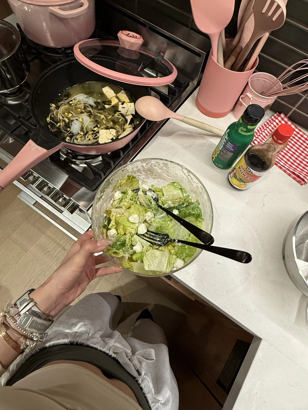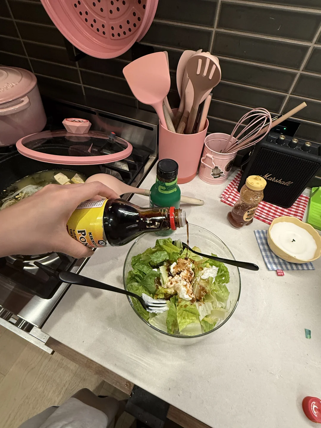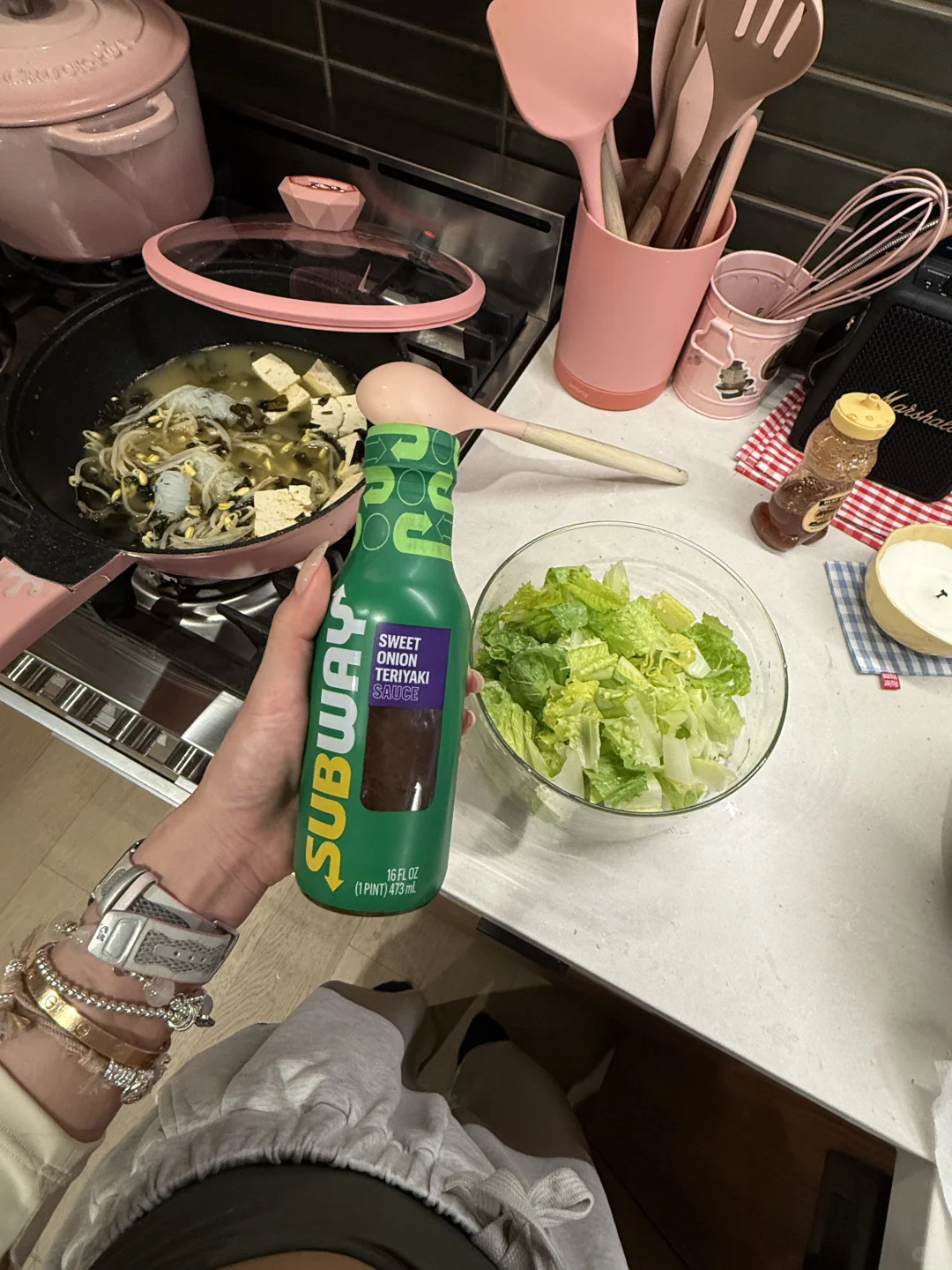 在Vons发现了最爱的 Sweet Onion Teriyaki Sauce!酸甜清爽,卡路里还很低。\ndressing的做法也很简单:一勺 0脂希腊酸奶,看心情加适量 sweet onion sauce和ponzu,再撒一点dill weed。\nRomanie生菜水分足、脆、甜,口感很好,不加dressing都很好吃了。最后放上些 马苏里拉芝士。本来还有海带汤,一碗沙拉吃完就吃不下了😌\n#food #今天吃什么呢 #蔬菜沙拉 #低卡酱料 #健康的味道 #吃饭糊弄学 #减脂 #晚餐 #一人食 #吃瘦不饿瘦