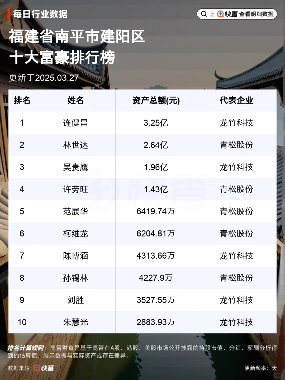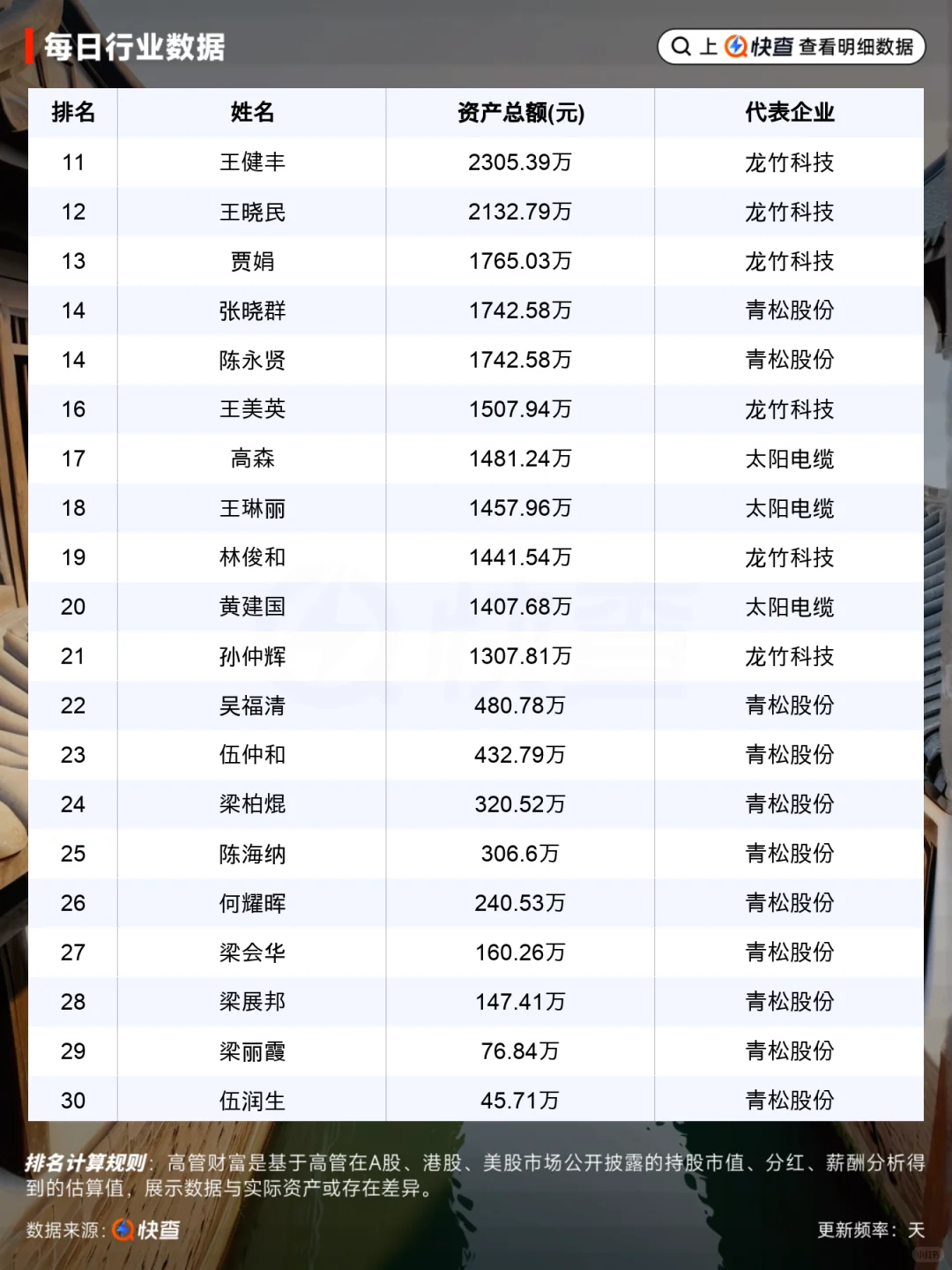 ☀️ 建阳区的富豪榜真是让人眼前一亮!青松股份和龙竹科技的几位高管占据了榜单的大部分位置,其中连健昌以3.25亿的财富稳居榜首,他的企业龙竹科技在竹、藤家具制造领域表现突出。贾娟的排名上升也引起了关注,她在竹藤创新和环保材料方面做出了不少贡献。 🌟\n \n太阳电缆的高森和王琳丽也强势上榜,分别以1481.24万和1457.96万的财富位列第17和第18位,他们在电线、电缆及电工器材制造领域有着不俗的表现。 🎉\n \n哇塞!瞬间觉得自己钱包好轻薄...😂\n \n#建阳富豪榜#太阳电缆#高管资产#青松股份#龙竹科技#连健昌#贾娟#排名上升#竹藤创新#环保材料#上快查查高管资产#快查查企业#企查查#天眼查#企业查询#APP推荐