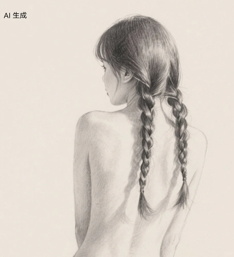 看!这个双麻花辫少女的素描背影绝了!蓬松精致的麻花辫像被风吹过的麦浪,每一根发丝都在诉说青涩心事~左手青涩地置于腰前,当她侧颜回眸——叮!睫毛像蝶翼般轻颤,在脸颊投下细碎阴影,嘴角那抹未说出口的悸动...这哪里是素描?分明是青春在纸上发芽!\n#素描美学