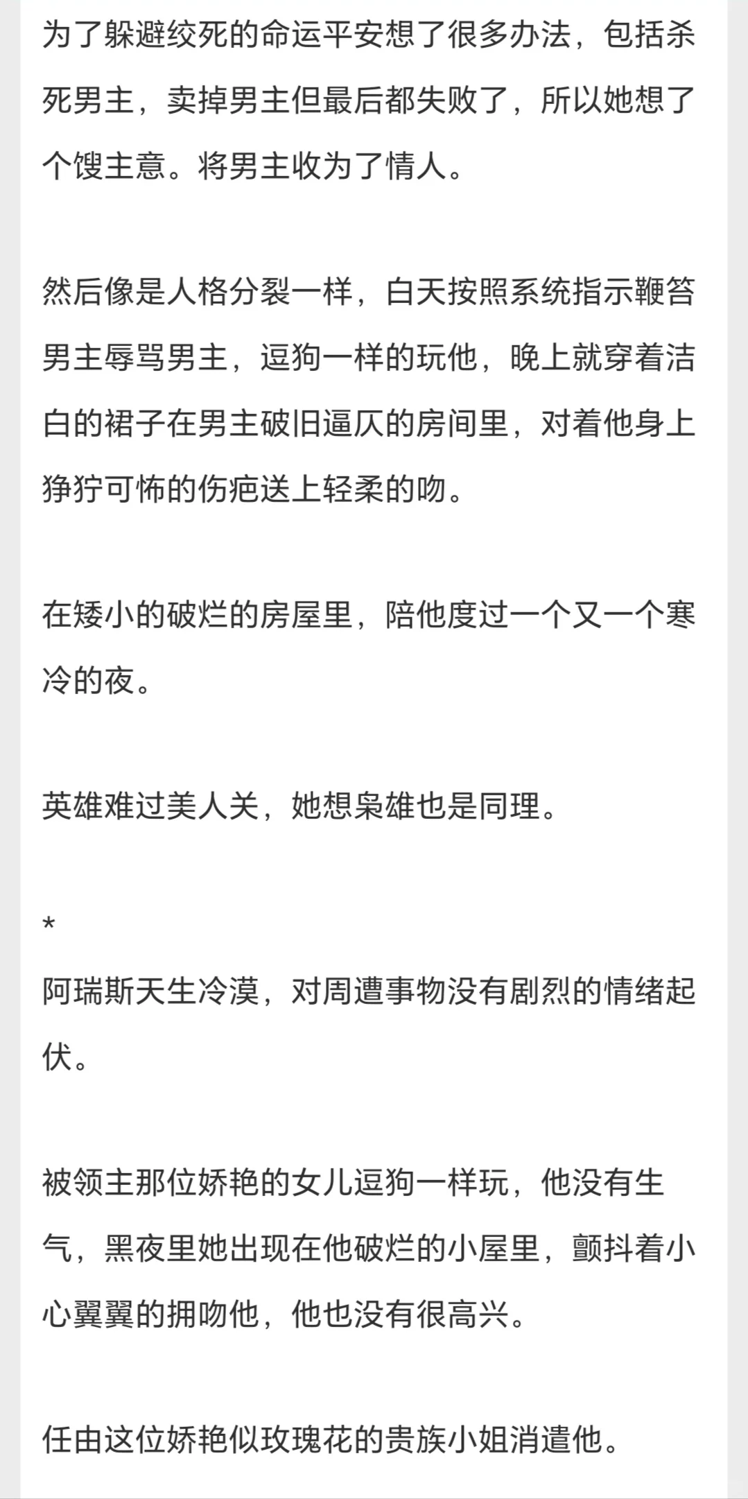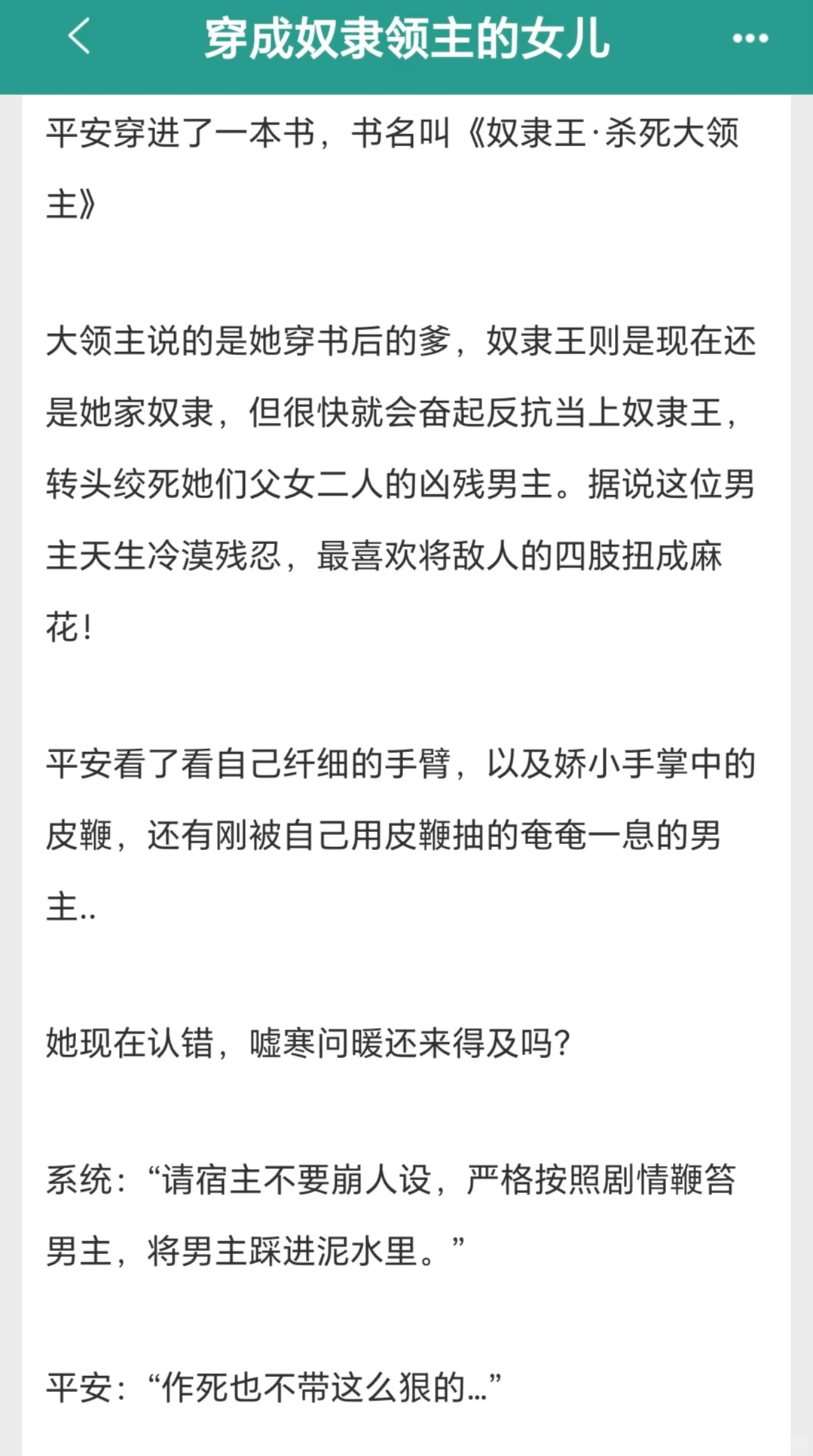《穿成奴隶领主的女儿》bt蛮小吉\n冷漠凶残奴隶王X高高在上娇蛮美艳大小姐\n背景是西幻古奴隶制社会,女主穿成了领主的女儿,为了逃离未来被绞死的结局,她决定先下手为强,弄死将来会成为奴隶王的男主。男主天性冷漠残忍,他这时只是一个普通的奴隶,因实力强劲才刚被女主父亲买来角斗场。\n女主在系统的胁迫下不得不走剧情维持恶毒人设,同时绞尽脑汁想把男主弄死,她想了无数办法包括但不限于借他人之手雇凶杀人、下毒、把男主喂野狼群等,但都被有着野兽般直觉的男主化险为夷了,迫于无奈她只能另辟蹊径,以身为饵,开启训狗计划。\n男主一早就觊觎女主了,一见钟情,女主时而高傲疏离时而又亲昵痴缠温柔缱绻成功把男主钓成翘嘴,明知道可能会被扎得鲜血淋漓仍忍不住靠近,男主下位感很重,爱上女主后会不择手段的阴暗掠夺,被驯服的凶兽恶犬X娇艳玫瑰\n排雷:女主自私,男主恋爱脑,不吃慎入,结局略仓促,有伏笔没交代\n【文案】\n带刺的玫瑰花小姐VS皮糙肉厚被扎了还要摘花的大块头奴隶\n平安穿进了一本书,书名叫《奴隶王·杀死大领主》\n大领主说的是她穿书后的爹,奴隶王则是现在还是她家奴隶,但很快就会奋起反抗当上奴隶王, 转头绞死她们父女二人的凶残男主。据说这位男主天生冷漠残忍,最喜欢将敌人的四肢扭成麻花!\n平安看了看自己纤细的手臂,以及娇小手掌中的皮鞭,还有刚被自己用皮鞭抽的奄奄一息的男主..\n她现在认错,嘘寒问暖还来得及吗?\n系统:“请宿主不要崩人设,严格按照剧情鞭笞男主,将男主踩进泥水里。”\n平安:“作死也不带这么狠的...\n为了躲避绞死的命运平安想了很多办法,包括杀死男主,卖掉男主但最后都失败了,所以想了个馊主意。将男主收为了情人。\n然后像是人格分裂一样,白天按照系统指示鞭笞男主辱骂男主,逗狗一样的玩他,晚上就穿着洁白的裙子在男主破旧逼仄的房间里,对着他身上狰狞可怖的伤疤送上轻柔的吻。\n在矮小的破烂的房屋里,陪他度过一个又一个寒冷的夜。\n英雄难过美人关,她想枭雄也是同理。\n*\n阿瑞斯天生冷漠,对周遭事物没有剧烈的情绪起伏。\n被领主那位娇艳的女儿逗狗一样玩,他没有生气,黑夜里她出现在他破烂的小屋里,颤抖着小心翼翼的拥吻他,他也没有很高兴。\n任由这位娇艳似玫瑰花的贵族小姐消遣他。\n……\n文案见图\n#西幻文 #西方罗曼 #小说推文 #书荒拯救 #下克上 #言情小说推荐 #甜文推荐 #糙汉文