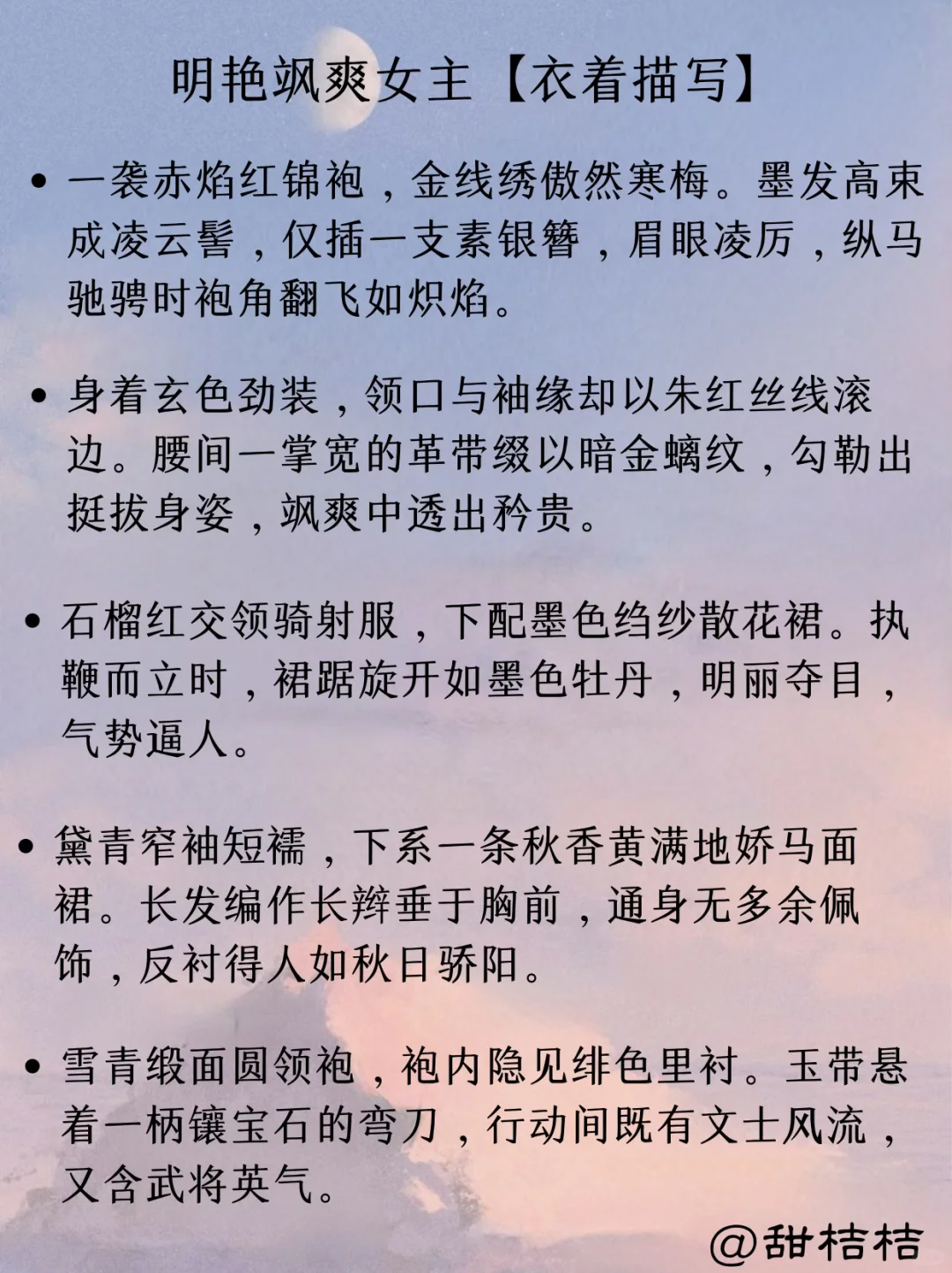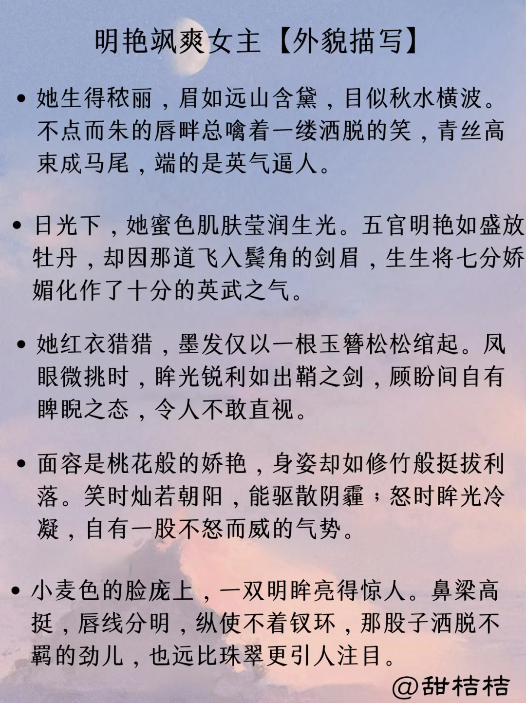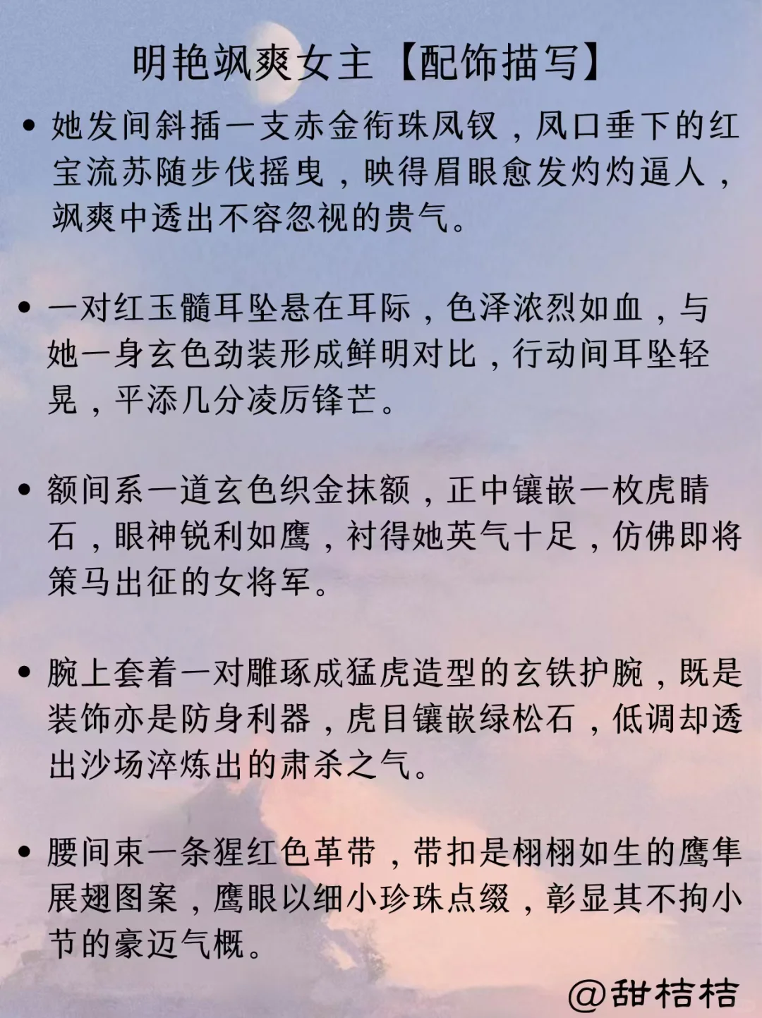明艳飒爽女主【外貌描写】\n她生得秾丽,眉如远山含黛,目似秋水横波。不点而朱的唇畔总噙着一缕洒脱的笑,青丝高束成马尾,端的是英气逼人。\n日光下,她蜜色肌肤莹润生光。五官明艳如盛放牡丹,却因那道飞入鬓角的剑眉,生生将七分娇媚化作了十分的英武之气。\n她红衣猎猎,墨发仅以一根玉簪松松绾起。凤眼微挑时,眸光锐利如出鞘之剑,顾盼间自有睥睨之态,令人不敢直视。\n面容是桃花般的娇艳,身姿却如修竹般挺拔利落。笑时灿若朝阳,能驱散阴霾;怒时眸光冷凝,自有一股不怒而威的气势。\n小麦色的脸庞上,一双明眸亮得惊人。鼻梁高挺,唇线分明,纵使不着钗环,那股子酒脱不羁的劲儿,也远比珠翠更引人注目。\n \n明艳飒爽女主【衣着描写】\n一袭赤焰红锦袍,金线绣傲然寒梅。墨发高束成凌云髻,仅插一支素银簪,眉眼凌厉,纵马驰骋时袍角翻飞如炽焰。\n身着玄色劲装,领口与袖缘却以朱红丝线滚边。腰间一掌宽的革带缀以暗金螭纹,勾勒出挺拔身姿,飒爽中透出矜贵。\n石榴红交领骑射服,下配墨色绉纱散花裙。执鞭而立时,裙踞旋开如墨色牡丹,明丽夺目,气势逼人。\n黛青窄袖短襦,下系一条秋香黄满地娇马面裙。长发编作长辫垂于胸前,通身无多余佩饰,反衬得人如秋日骄阳。\n雪青缎面圆领袍,袍内隐见绯色里衬。玉带悬着一柄镶宝石的弯刀,行动间既有文士风流又含武将英气。\n \n明艳飒爽女主【配饰描写】\n她发间斜插一支赤金衔珠风钗,凤口垂下的红宝流苏随步伐摇曳,映得眉眼愈发灼灼逼人,飒爽中透出不容忽视的贵气。\n一对红玉髓耳坠悬在耳际,色泽浓烈如血,与她一身玄色劲装形成鲜明对比,行动间耳坠轻晃,平添几分凌厉锋芒。\n额间系一道玄色织金抹额,正中镶嵌一枚虎睛石,眼神锐利如鹰,衬得她英气十足,仿佛即将策马出征的女将军。\n腕上套着一对雕琢成猛虎造型的玄铁护腕,既是装饰亦是防身利器,虎目镶嵌绿松石,低调却透出沙场淬炼出的肃杀之气。\n#写作素材 #小说人物描写 #小说写作素材 #小说写作灵感 #小说写作干货 #描写女主外貌 #小说人物设定 #女主人设天花板 #古风小说