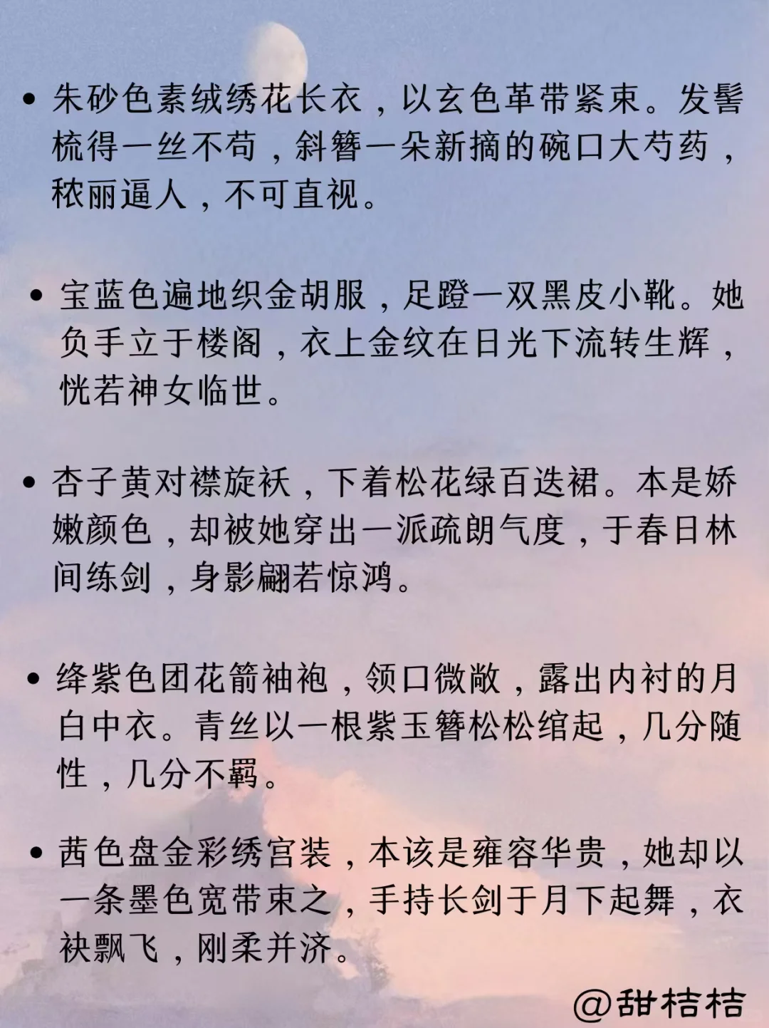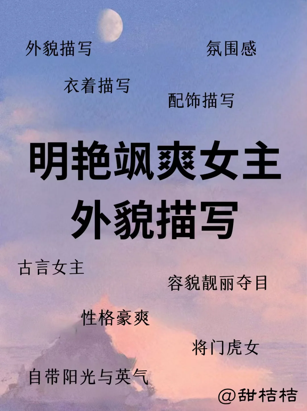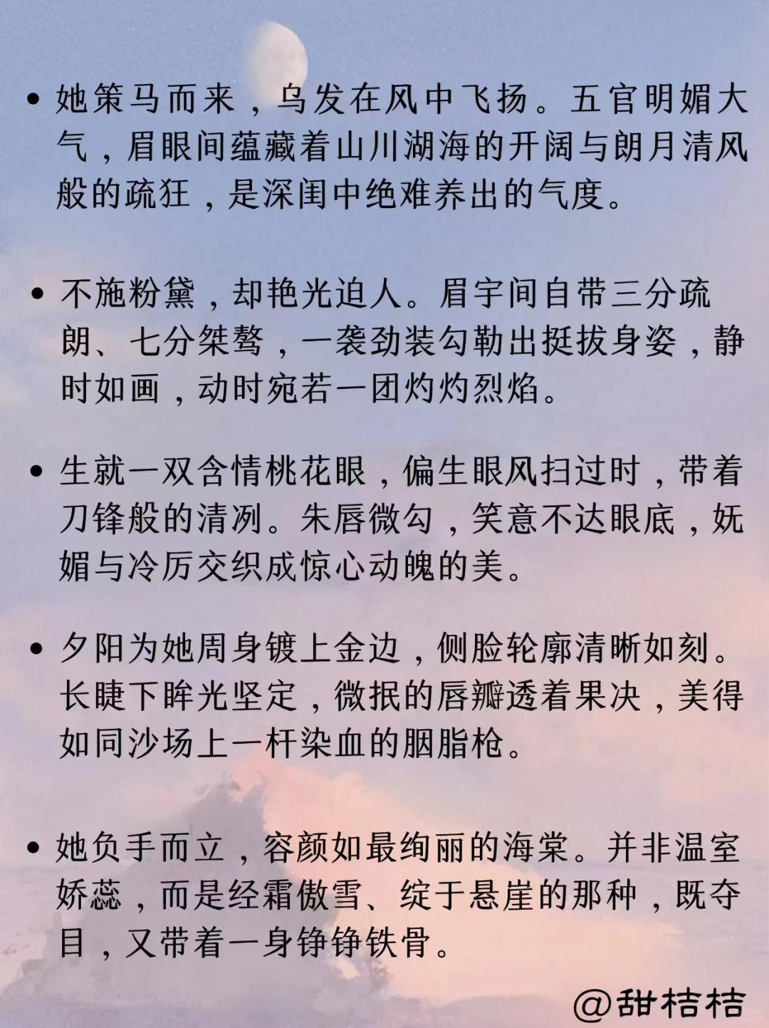 明艳飒爽女主【外貌描写】\n她生得秾丽,眉如远山含黛,目似秋水横波。不点而朱的唇畔总噙着一缕洒脱的笑,青丝高束成马尾,端的是英气逼人。\n日光下,她蜜色肌肤莹润生光。五官明艳如盛放牡丹,却因那道飞入鬓角的剑眉,生生将七分娇媚化作了十分的英武之气。\n她红衣猎猎,墨发仅以一根玉簪松松绾起。凤眼微挑时,眸光锐利如出鞘之剑,顾盼间自有睥睨之态,令人不敢直视。\n面容是桃花般的娇艳,身姿却如修竹般挺拔利落。笑时灿若朝阳,能驱散阴霾;怒时眸光冷凝,自有一股不怒而威的气势。\n小麦色的脸庞上,一双明眸亮得惊人。鼻梁高挺,唇线分明,纵使不着钗环,那股子酒脱不羁的劲儿,也远比珠翠更引人注目。\n \n明艳飒爽女主【衣着描写】\n一袭赤焰红锦袍,金线绣傲然寒梅。墨发高束成凌云髻,仅插一支素银簪,眉眼凌厉,纵马驰骋时袍角翻飞如炽焰。\n身着玄色劲装,领口与袖缘却以朱红丝线滚边。腰间一掌宽的革带缀以暗金螭纹,勾勒出挺拔身姿,飒爽中透出矜贵。\n石榴红交领骑射服,下配墨色绉纱散花裙。执鞭而立时,裙踞旋开如墨色牡丹,明丽夺目,气势逼人。\n黛青窄袖短襦,下系一条秋香黄满地娇马面裙。长发编作长辫垂于胸前,通身无多余佩饰,反衬得人如秋日骄阳。\n雪青缎面圆领袍,袍内隐见绯色里衬。玉带悬着一柄镶宝石的弯刀,行动间既有文士风流又含武将英气。\n \n明艳飒爽女主【配饰描写】\n她发间斜插一支赤金衔珠风钗,凤口垂下的红宝流苏随步伐摇曳,映得眉眼愈发灼灼逼人,飒爽中透出不容忽视的贵气。\n一对红玉髓耳坠悬在耳际,色泽浓烈如血,与她一身玄色劲装形成鲜明对比,行动间耳坠轻晃,平添几分凌厉锋芒。\n额间系一道玄色织金抹额,正中镶嵌一枚虎睛石,眼神锐利如鹰,衬得她英气十足,仿佛即将策马出征的女将军。\n腕上套着一对雕琢成猛虎造型的玄铁护腕,既是装饰亦是防身利器,虎目镶嵌绿松石,低调却透出沙场淬炼出的肃杀之气。\n#写作素材 #小说人物描写 #小说写作素材 #小说写作灵感 #小说写作干货 #描写女主外貌 #小说人物设定 #女主人设天花板 #古风小说