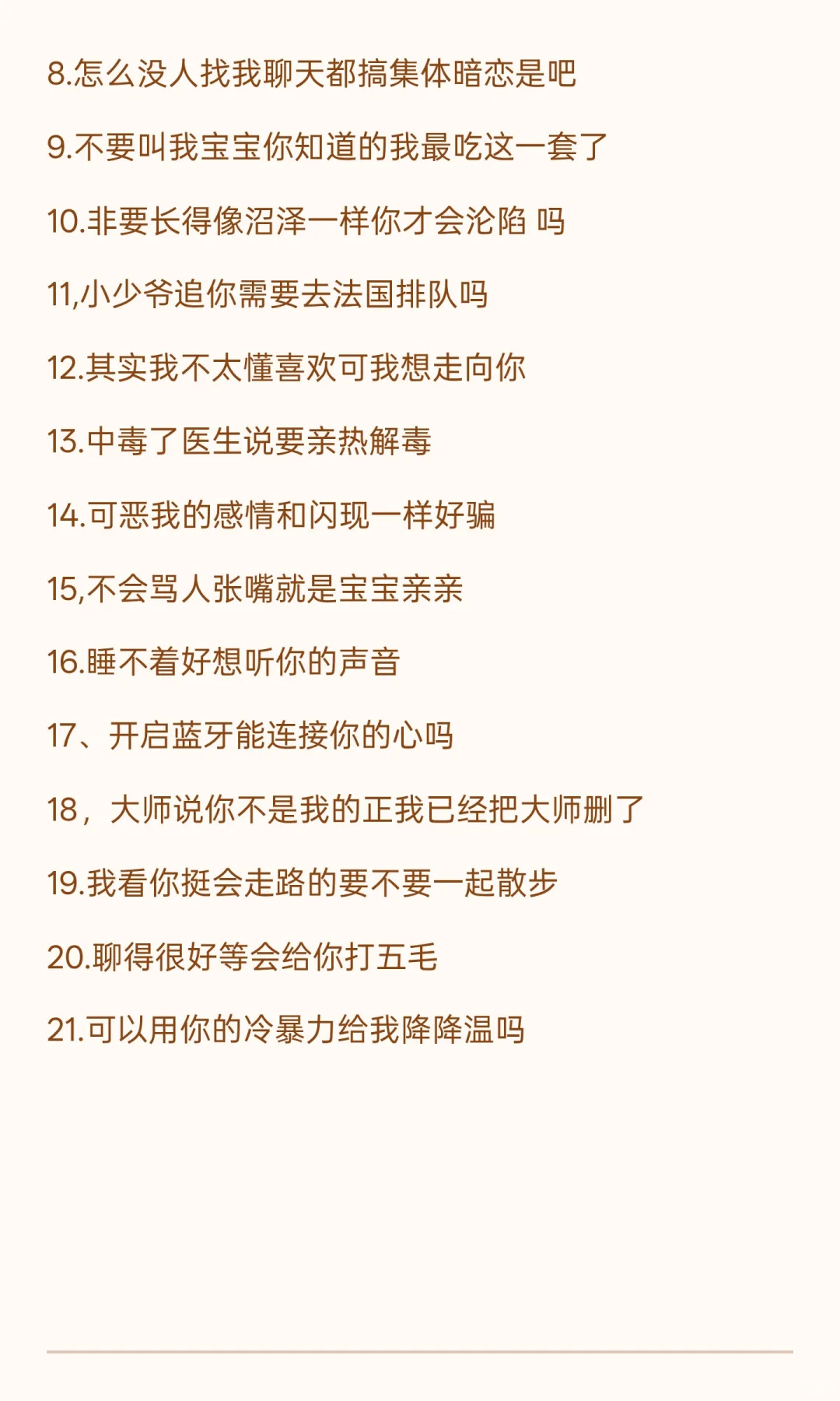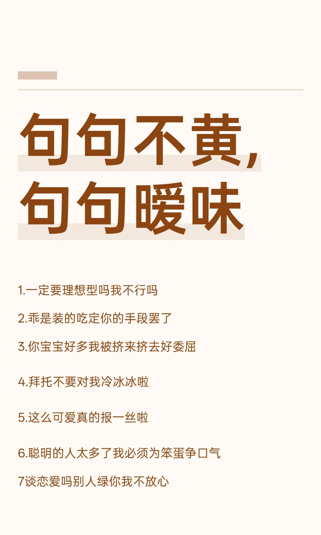 句句不黄,句句暧味\n \n1.一定要理想型吗我不行吗\n2.乖是装的吃定你的手段罢了\n3.你宝宝好多我被挤来挤去好委屈\n \n4.拜托不要对我冷冰冰啦\n \n5.这么可爱真的报一丝啦\n \n6.聪明的人太多了我必须为笨蛋争口气\n7谈恋爱吗别人绿你我不放心\n8.怎么没人找我聊天都搞集体暗恋是吧\n9.不要叫我宝宝你知道的我最吃这一套了\n10.非要长得像沼泽一样你才会沦陷 吗\n11,小少爷追你需要去法国排队吗\n12.其实我不太懂喜欢可我想走向你\n13.中毒了医生说要亲热解毒\n14.可恶我的感情和闪现一样好骗\n15,不会骂人张嘴就是宝宝亲亲\n16.睡不着好想听你的声音\n17、开启蓝牙能连接你的心吗\n18,大师说你不是我的正我已经把大师删了\n19.我看你挺会走路的要不要一起散步\n20.聊得很好等会给你打五毛\n21.可以用你的冷暴力给我降降温吗#直播话术 #直播技巧 #主播培训 #新人主播 #直播培训 #主播 #句句无你却句句写你 #个播 #撩人情话 #嘴甜的好处