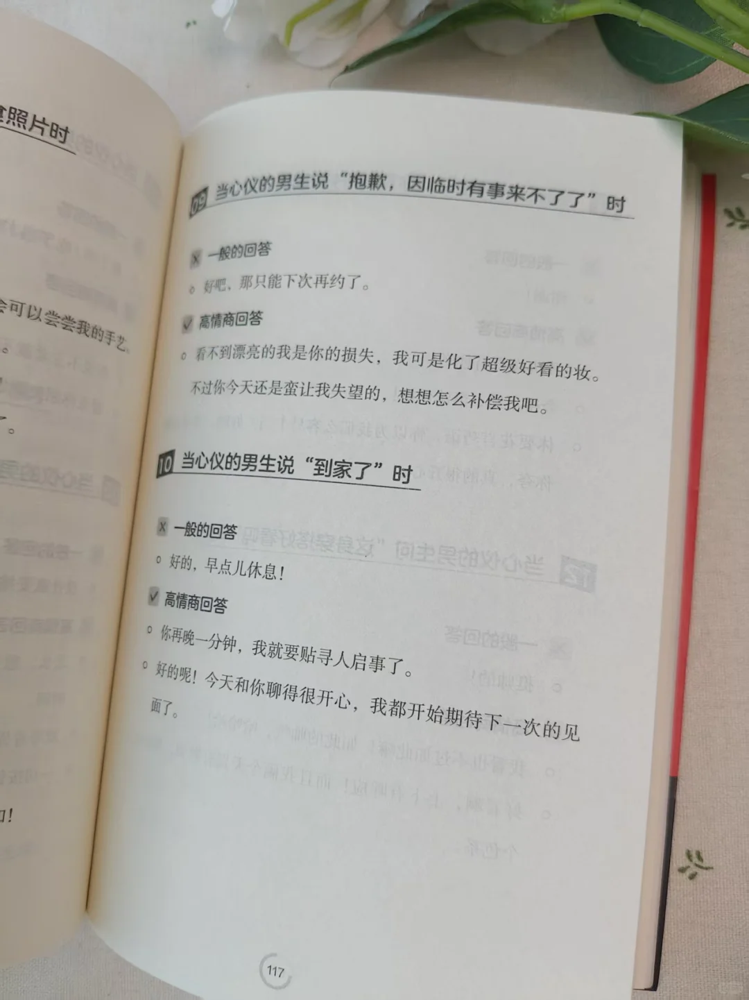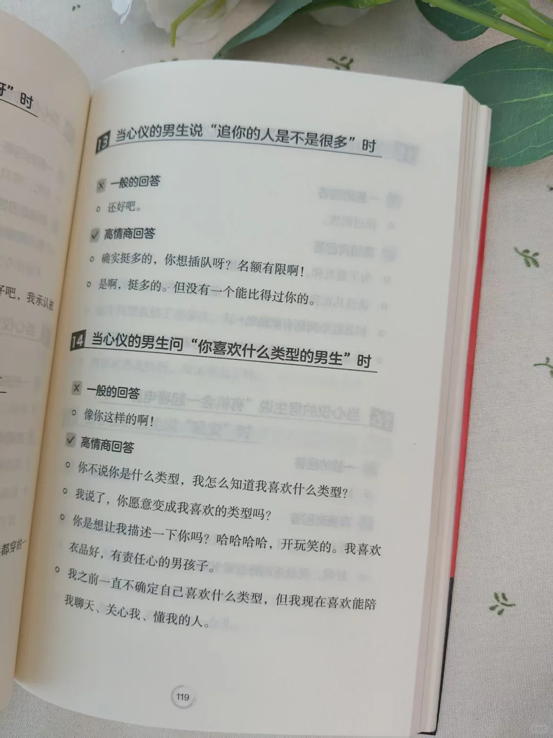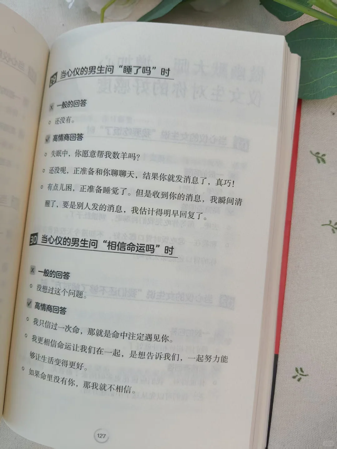 爱情里哪有什么“天生合拍”,\n不过是有人懂用温柔话术,把平淡对话变成心动瞬间~\n别再只会说“在干嘛”“早点睡”,\n试试这6种回话,轻松让他对你越来越上心!\n \n1、他说 “刚忙完”\n× 一般回答:“哦,那你休息吧。”\n√ 高情商回话:“忙了这么久肯定累坏啦~要不要跟我说说今天最累的事?我当你的‘情绪小垃圾桶’~”\n👉 先心疼再递话题,让他觉得你超懂他\n \n2、他吐槽“今天工作好烦”\n× 一般回答:“别烦了,都会过去的。”(没实质安慰)\n√ 高情商回话:“听你这么说我都跟着着急了~是遇到难搞的事了吗?要是想吐槽,我一直都在;要是想静静,我也等你愿意说的时候~”\n👉 先共情再给选择,不施压还显贴心,超戳男生心\n \n3、他问“想我了吗”\n× 一般回答:“还好吧。”(显得敷衍)\n√ 高情商回话:“你猜~不过我发现,今天看手机的次数都变多了,总怕错过你的消息~”\n👉 不直白却藏满心意,比 “想” 更让他心动\n \n4、他夸 “你今天真好看”\n× 一般回答:“没有啦,随便穿的。”(不自信)\n√ 高情商回话:“谢谢呀!听你这么说我超开心~不过我觉得,今天跟你聊天,我整个人状态都变好了呢~\n👉 先感谢再回撩,既大方又拉近距离\n \n5、闹小矛盾后他说 “别生气了”\n× 一般回答:“我没有生气。”(嘴硬)\n√ 高情商回话:“其实我早就不气啦~就是刚才没收到你消息,有点想你而已~”\n👉 给台阶还表心意,轻松化解矛盾\n \n6、他说 “有你在真好”\n× 一般回答:“还好啦。”(浪费心动时刻)\n√ 高情商回话:“我也是!跟你在一起的时候,我总觉得特别踏实,好像再麻烦的事都不怕了~”\n👉 回应他的真心,让感情双向升温\n \n这些超甜的亲密关系话术,都来自时光学《回话有招》!\n32开便携尺寸,240页全是干货,\n书中还有超多约会、吵架和好、日常相处的话术,\n每个场景都标了“一般回答”和“高情商回答”,\n一看就懂、一用就会!\n爱情里,会说话真的能让感情更甜~\n \n#引导男人付出 #让男人喜欢你 #男人的小心思 #恋爱小技巧 #女性情感 #给男人立规矩 #读懂男人心 #让男友瞬间上头
