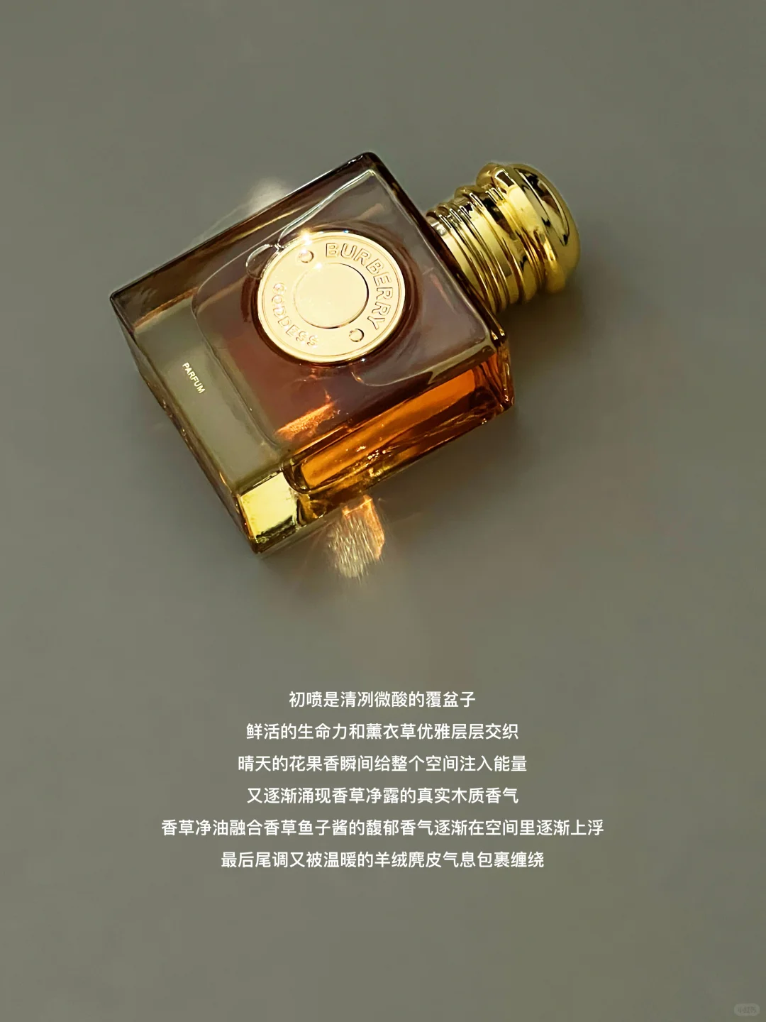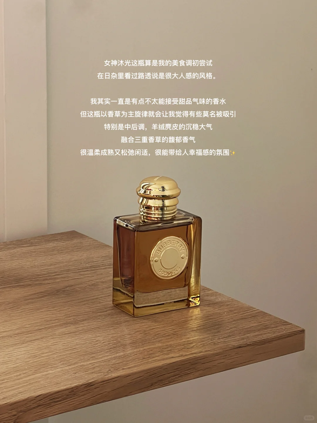 已经开始在为秋冬搜罗新香水了\n遇到这只Burberry全新女神沐光香\n她家女神系列的经典款算是我的人生香之一\n这次又出了一支新版\n-\n其实我很少尝试这种调香很独特的美食皮革调\n但很难不被这丰富的三重香草+皮革的层次吸引到~\n初闻就是清新多汁的覆盆子开场🫧鲜活明亮!\n酸甜的果香逐渐与浪漫的薰衣草香层层交织🪻\n逐渐香草味儿的馥郁醇香涌入鼻腔\n最后携木质调回归温和细腻的羊绒麂皮香🦌\n余韵完全就是松弛感伪体香~特别贴肤好穿\n-\n这瓶的气质在我心里是很有力量感的\n闻着都觉得被暖意包裹✨能量涌动的感觉\n就像一个笃定自信,气质温柔又强大的女性形象