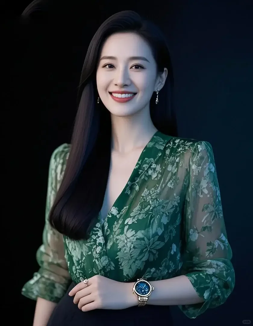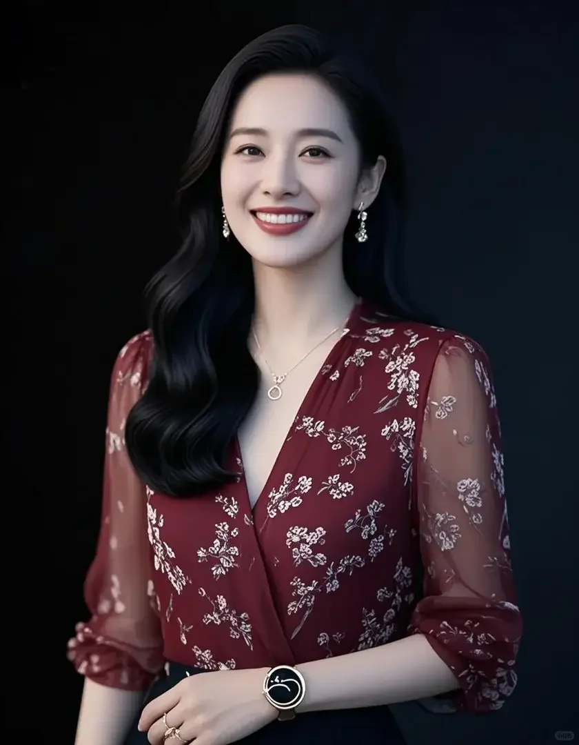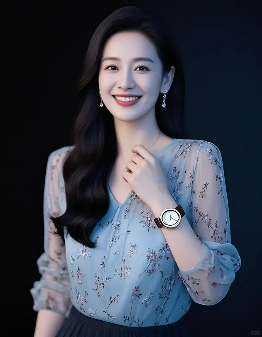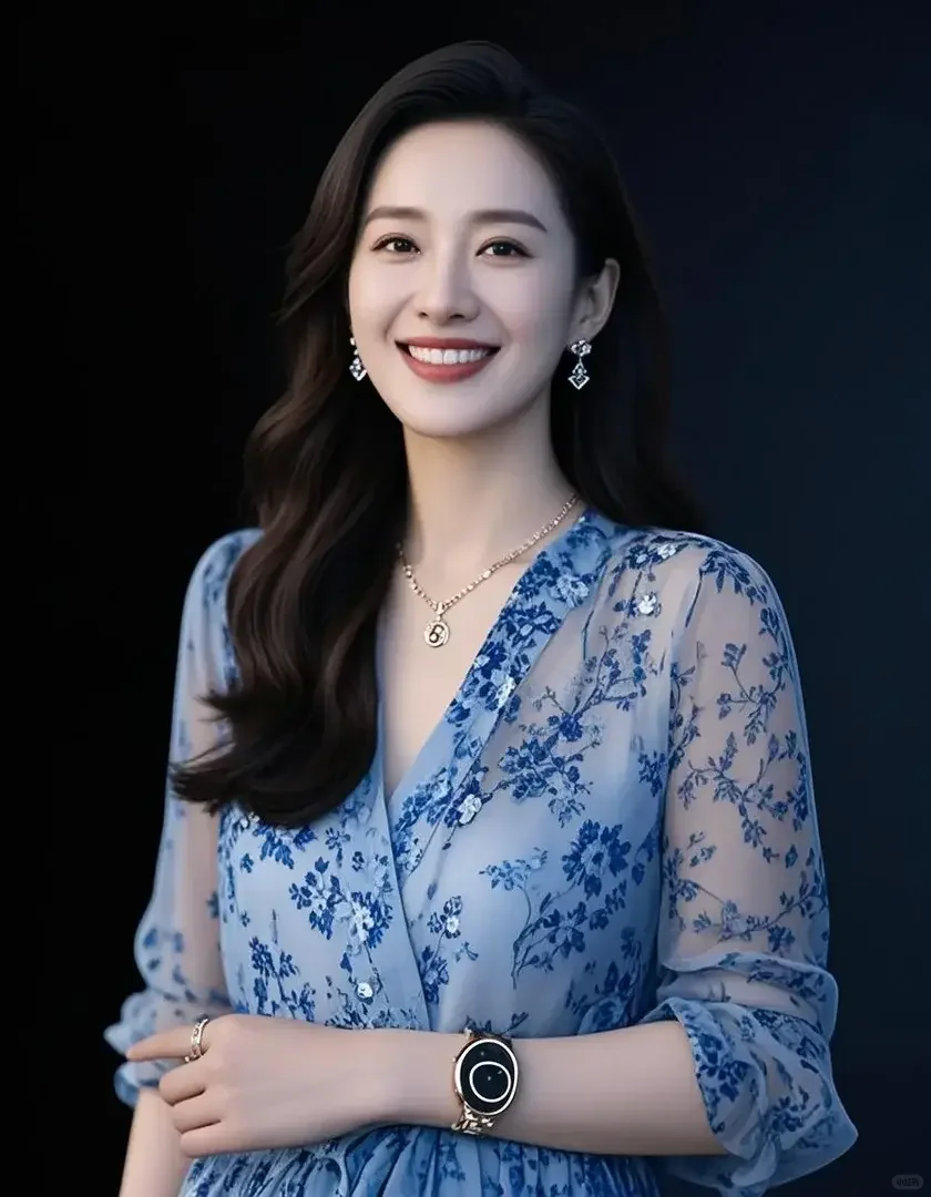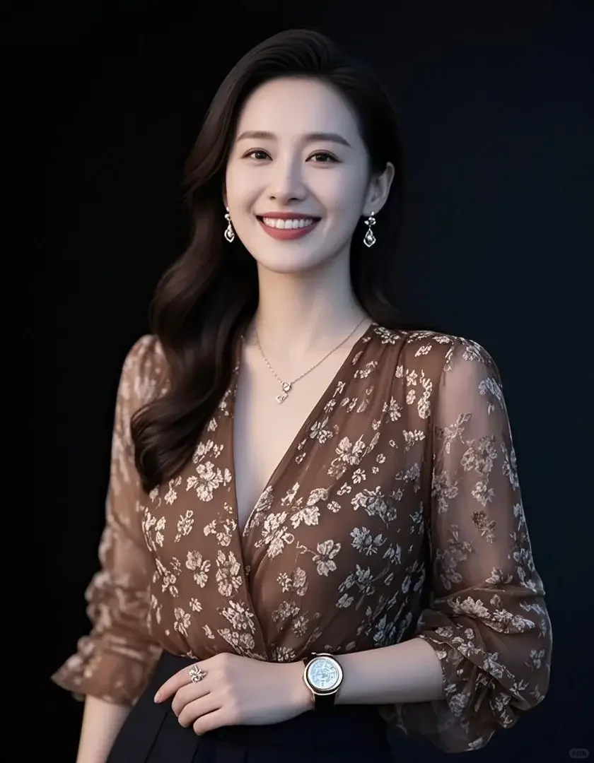 成熟优雅的女性,留着波浪长发,佩戴精致耳环、项链与手表,身着碎花薄纱上衣,在深色背景衬托下,笑容温婉,尽显高贵气质。