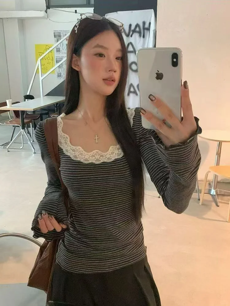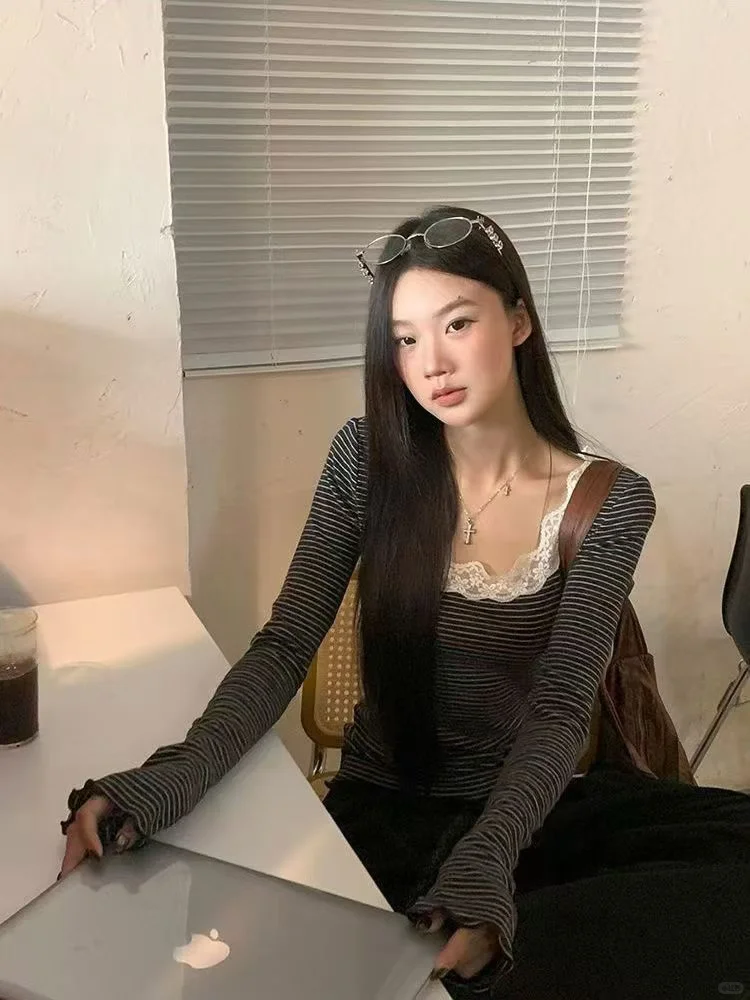 谁能拒绝一件把复古温柔与小众设计感焊死的条纹tee啊!\n领口的蕾丝花边是点睛之笔,甜妹感直接拉满;条纹元素经典不挑人,日常出街、约会通勤都能搭。微喇袖口的细节还藏着小心机,显瘦又有氛围感~\n不管是配高腰裙走甜辣风,还是搭牛仔裤走休闲风,它都能稳稳hold住,属于是秋日衣橱里的“万能选手”,穿上就知道什么叫颜值与实穿性并存!#甜辣风 #轻松穿出氛围感 #初秋必备 #秋季穿搭女 #早秋这么穿 #轻松拿捏秋日氛围感 #甜辣风穿搭 #悄悄上新的早秋穿搭