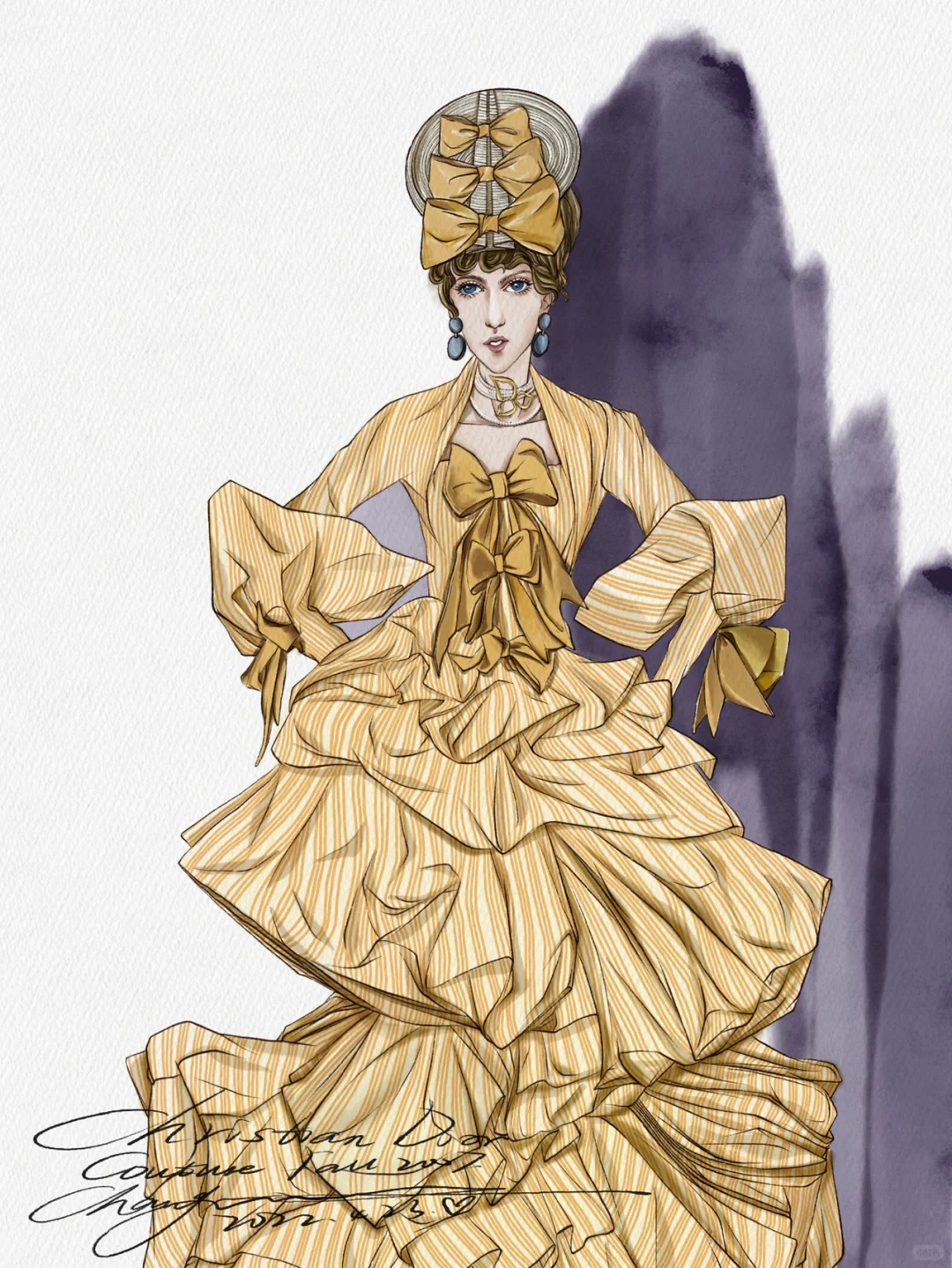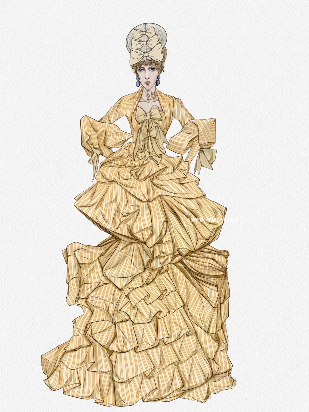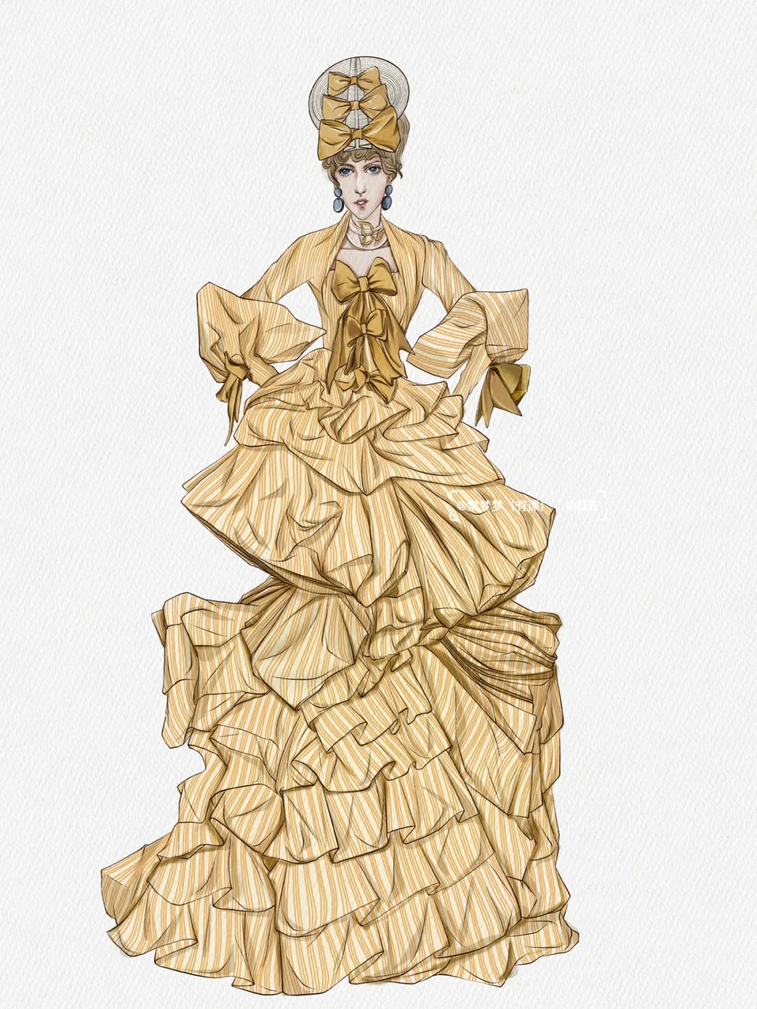 工具:iPad➕pencil\n软件:procreate\n画笔:自带/常梦梦自制\n \n秀场:Dior Couture Fall 2007\n \n层层叠叠的条纹礼服看起来复杂,实际上不仅画起来简单,而且效果事半功倍!\n赶快动手画起来吧!\n第一步:画线稿\n先定整个人物动态的造型动势,不用和原图一模一样,可以加入主观设想并设法实现,夸张一点的比例或姿势变一下都是可以的,但人的根基和重心一定得稳,不然就事倍功半啦。\n第二步:肤色➕大色块\n可以选一只较大的笔刷把色相一致的都铺一遍,这一步很快,大概两分钟就能搞定。\n第三步:画阴影\n根据一二步画出稍微暗一点的大色块,再用更暗一点勾暗部细节,这一步需要仔细观察,包括褶皱肌理的走向,分清主次,符合人体动态的活动规律,并注意虚实块面结合,也就是常说的素描关系。\n第四步:加细节和条纹图案\n这一步需要将需要加强的局部都再强化一遍,画条纹的时候需要注意条纹面料的走向要顺着人体包裹衣服的褶皱流向,这一步需要蛮多时间画条纹,耐心一点,毕竟慢工出细活,最后再点上高光就好啦!\n#服装设计手绘#服装设计效果图 #时装画 #时装插画 #服装设计#procreate #ipad画画 #插画 #插画分享 #插画教程 #原创插画