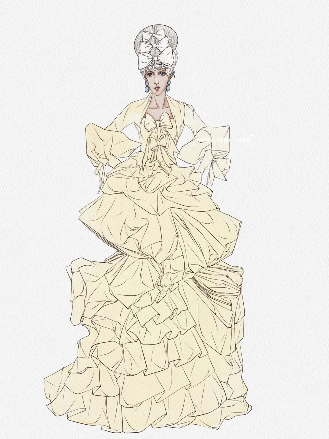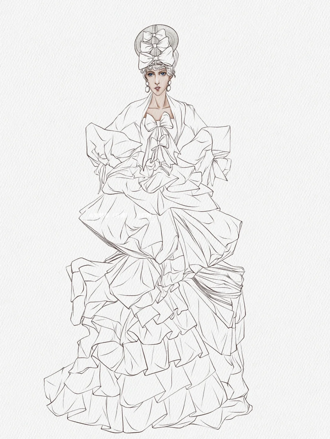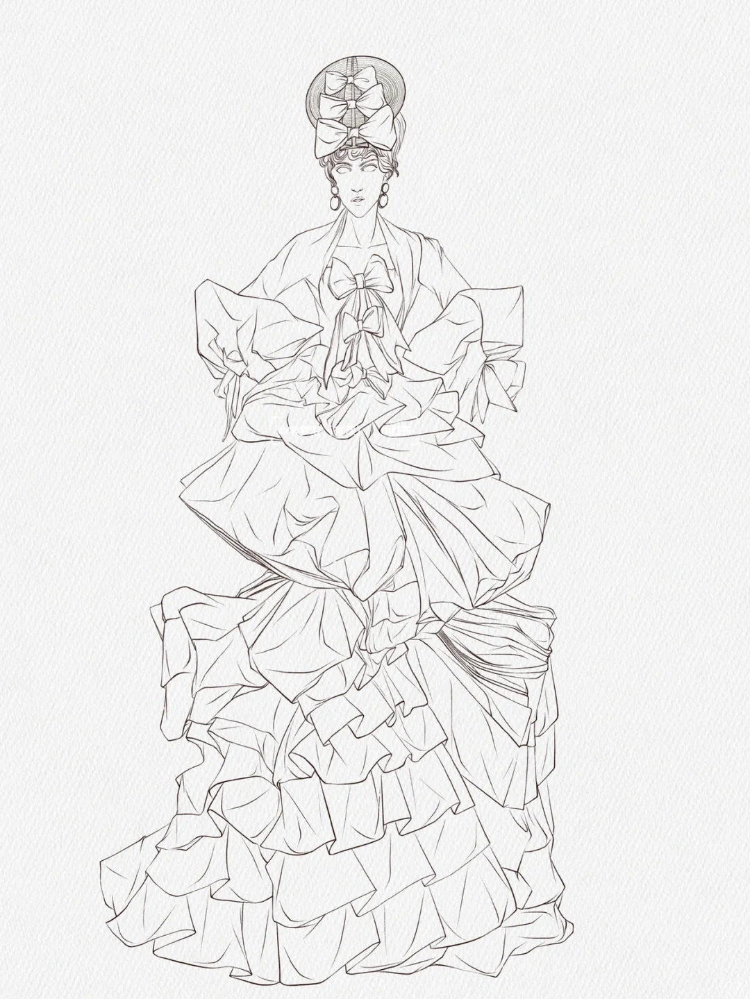 工具:iPad➕pencil\n软件:procreate\n画笔:自带/常梦梦自制\n \n秀场:Dior Couture Fall 2007\n \n层层叠叠的条纹礼服看起来复杂,实际上不仅画起来简单,而且效果事半功倍!\n赶快动手画起来吧!\n第一步:画线稿\n先定整个人物动态的造型动势,不用和原图一模一样,可以加入主观设想并设法实现,夸张一点的比例或姿势变一下都是可以的,但人的根基和重心一定得稳,不然就事倍功半啦。\n第二步:肤色➕大色块\n可以选一只较大的笔刷把色相一致的都铺一遍,这一步很快,大概两分钟就能搞定。\n第三步:画阴影\n根据一二步画出稍微暗一点的大色块,再用更暗一点勾暗部细节,这一步需要仔细观察,包括褶皱肌理的走向,分清主次,符合人体动态的活动规律,并注意虚实块面结合,也就是常说的素描关系。\n第四步:加细节和条纹图案\n这一步需要将需要加强的局部都再强化一遍,画条纹的时候需要注意条纹面料的走向要顺着人体包裹衣服的褶皱流向,这一步需要蛮多时间画条纹,耐心一点,毕竟慢工出细活,最后再点上高光就好啦!\n#服装设计手绘#服装设计效果图 #时装画 #时装插画 #服装设计#procreate #ipad画画 #插画 #插画分享 #插画教程 #原创插画