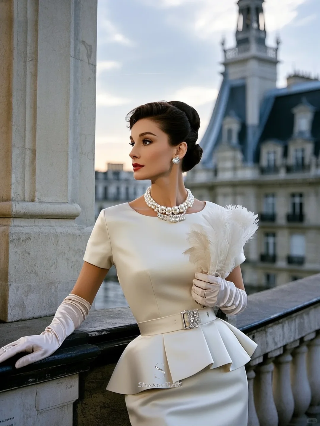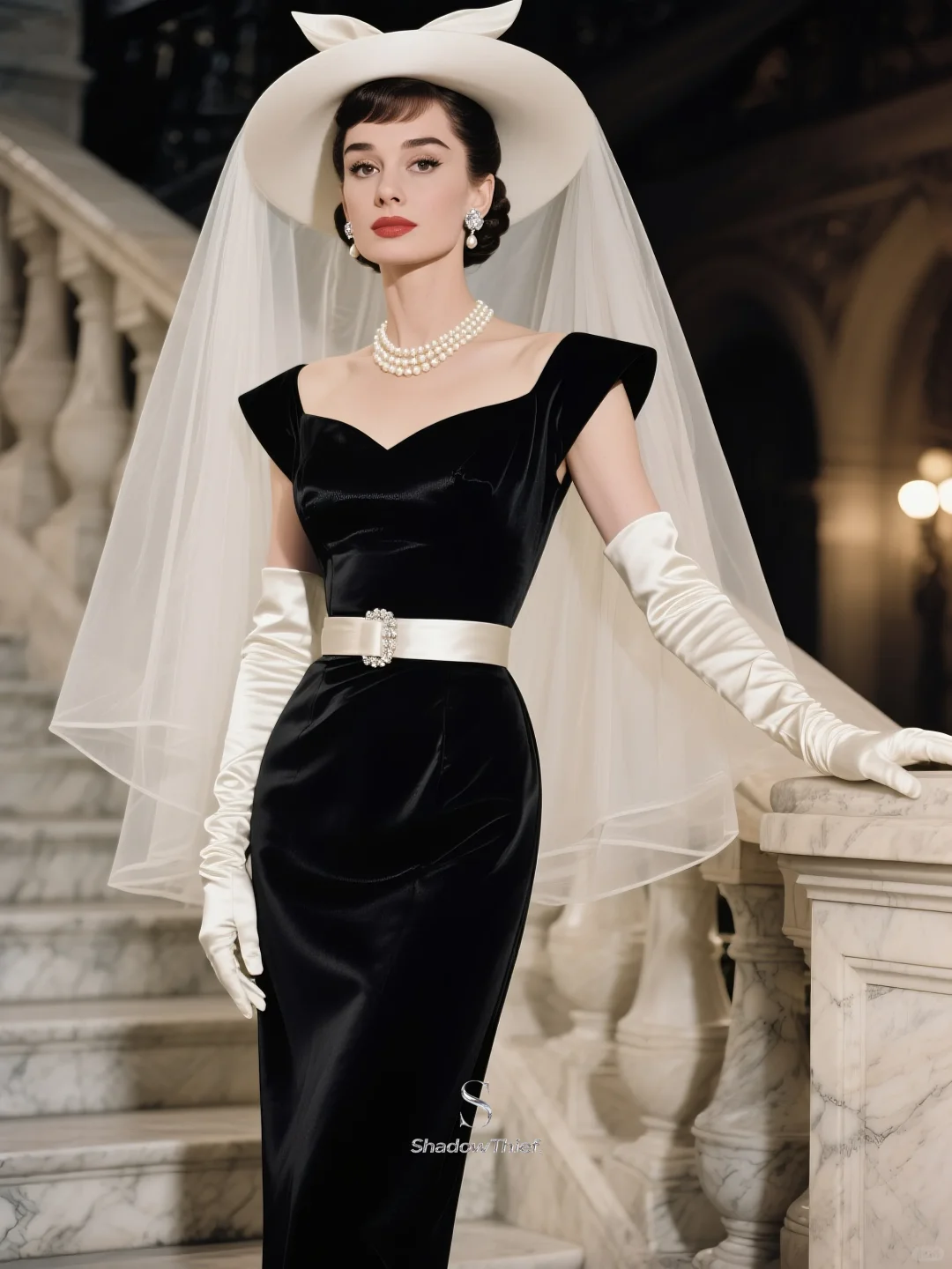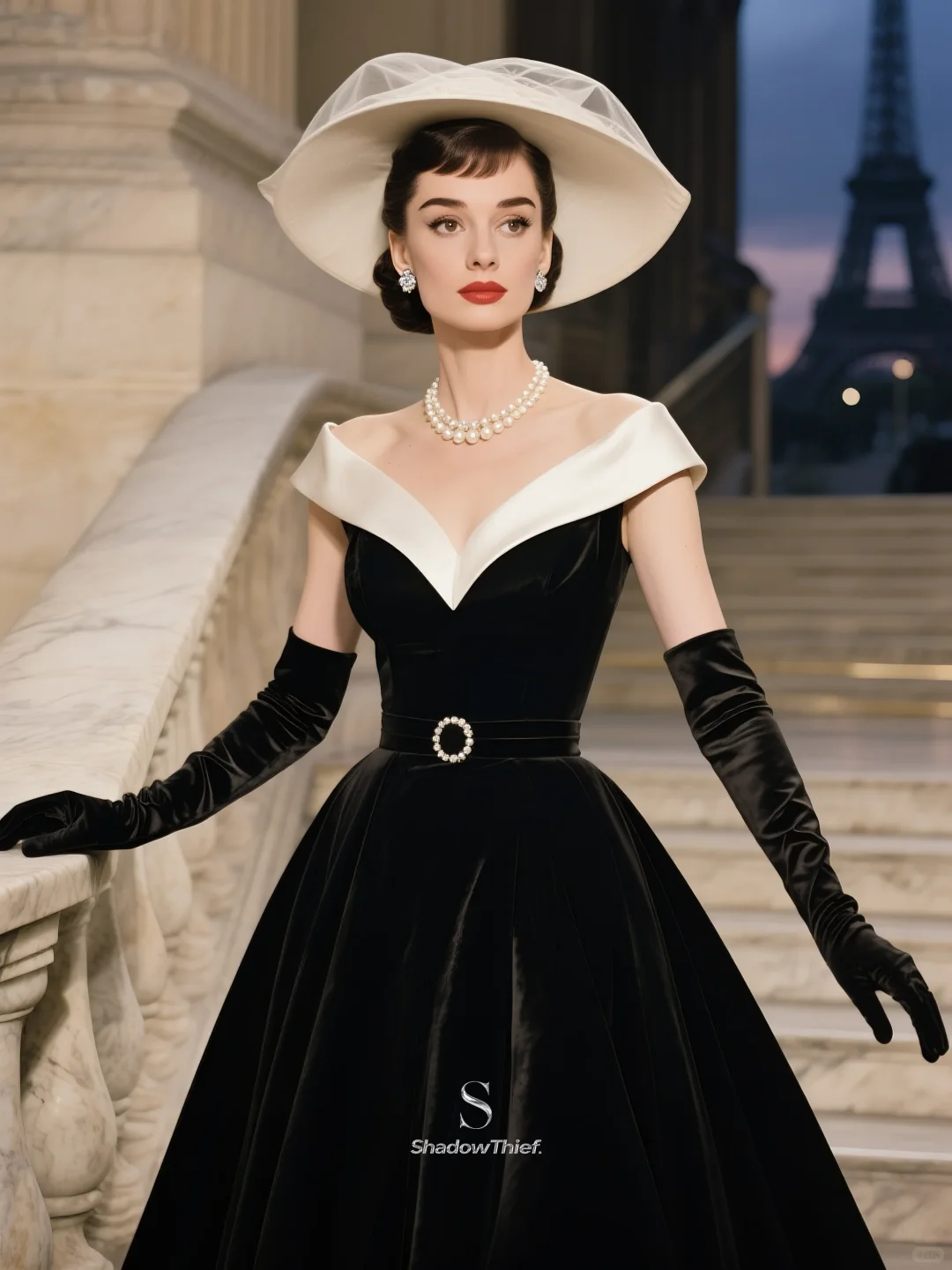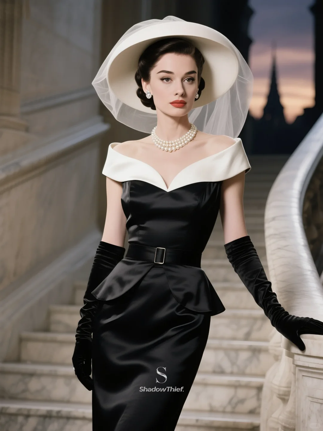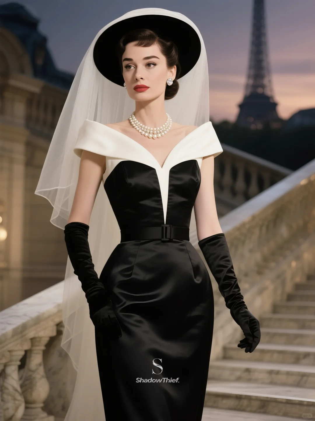 🤯 这不就是刻在Dior和Givenchy DNA里的优雅吗?说是现代版赫本也不为过!\n👗 廓形与结构 (Silhouette & Structure)\n经典的X廓形,美学张力拉满!上半身用硬挺面料做出雕塑感极强的翻折一字肩,锐利又舒展。腰部用宽版腰带强力收束,与肩部形成完美沙漏比例。下半身的缎面铅笔裙,勾勒曲线,利落又高贵。\n🧵 面料与色彩 (Fabric & Color)\n黑白,是永远不会出错的优雅。🖤🤍 主体的黑色真丝缎面,光泽如水银泻地,自带高级感。肩部的白色部分应该是非常规的厚重材质,才能支撑起这么挺括的造型。轻盈的头纱与厚重的礼帽形成虚实对比,材质的碰撞让整个look层次感丰富,充满戏剧性。\n✨ 配饰与氛围 (Accessories & Vibe)\n造型的完成度堪称完美!从复古的多层珍珠项链、天鹅绒长手套,到这顶宽檐礼帽,每一个配饰都在为“永恒的优雅”这个主题服务。背景里黄昏的巴黎铁塔,直接把故事感和氛围拉满!\n不得不说,AI现在的美学真的绝了,完全可以作为我们设计师的灵感加油站!⛽\n姐妹们,从这件礼服里,你们get到了哪些可以运用到自己设计里的元素?评论区聊聊!\n#服装设计 #设计灵感 #AI生成 #时尚moodboard #赫本风 #复古高定 #Dior美学 #服装设计师 #ShdowThief #礼服设计