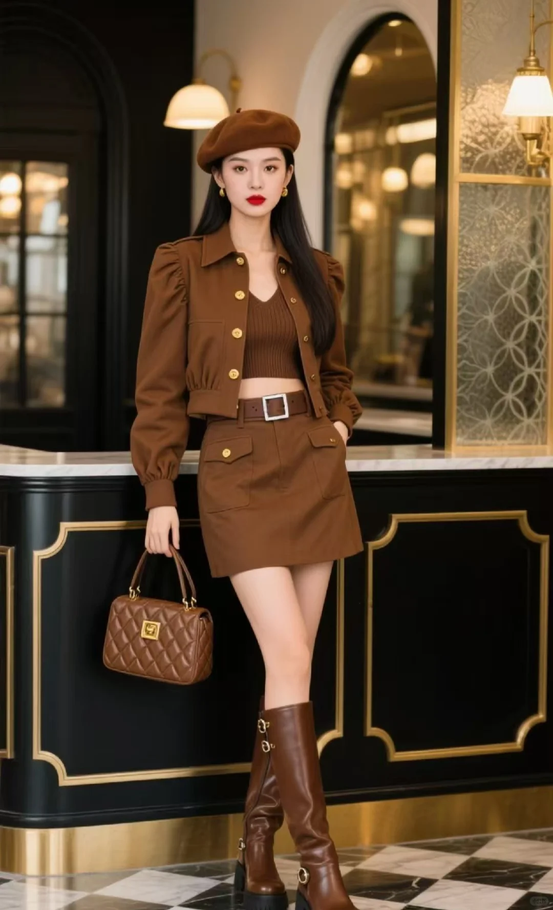 复古摩登感拉满!全棕套装+贝雷帽秒变画报女主~\n热点\n近期「棕系复古风」热度飙升,同色系叠穿+金属元素的搭配,既有老派优雅又带现代酷感,适配黑金氛围感场景,拍照自带电影画报质感,日常出街吸睛度满分。\n搭配技巧\n1. 同色叠穿有层次:短夹克+针织背心+工装裙,用棕色腰带分割腰线,避免全棕单调,显高又利落\n2. 金属元素点睛:金色纽扣+银色腰带扣+靴子搭扣呼应,提升精致度,打破深色沉闷\n3. 配饰呼应整体:贝雷帽+菱格纹手提包+长筒靴,统一棕色系,强化复古调性,和暖光场景适配度更高