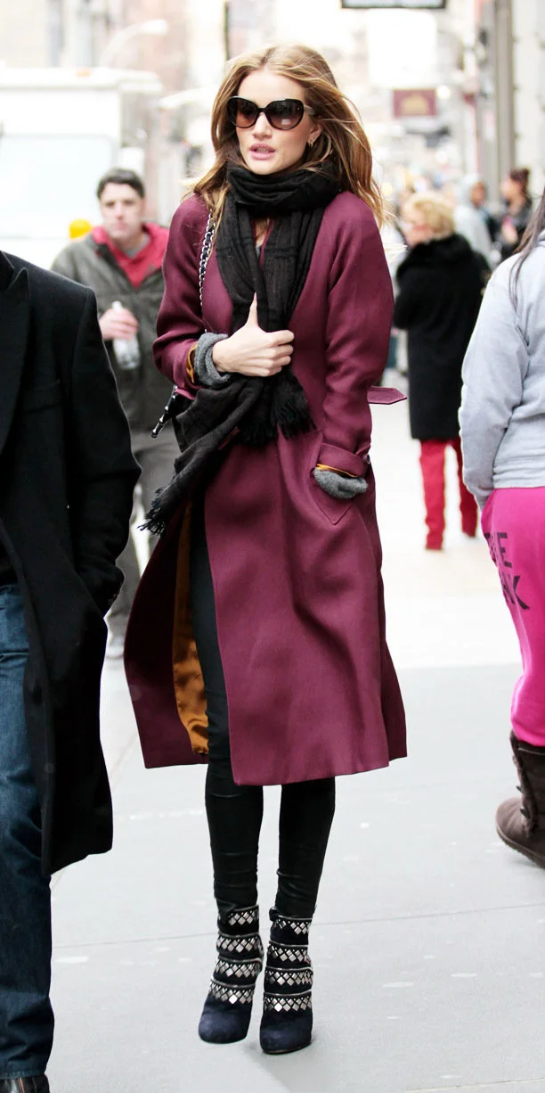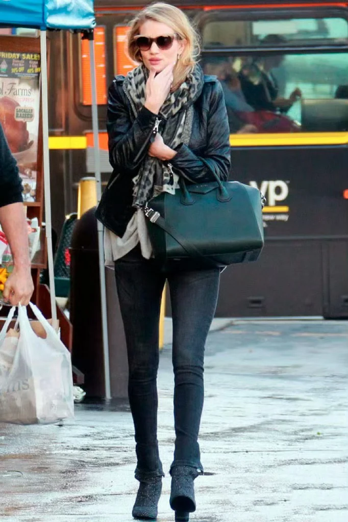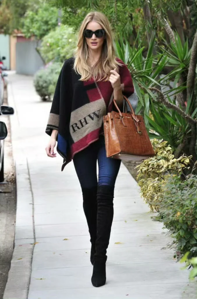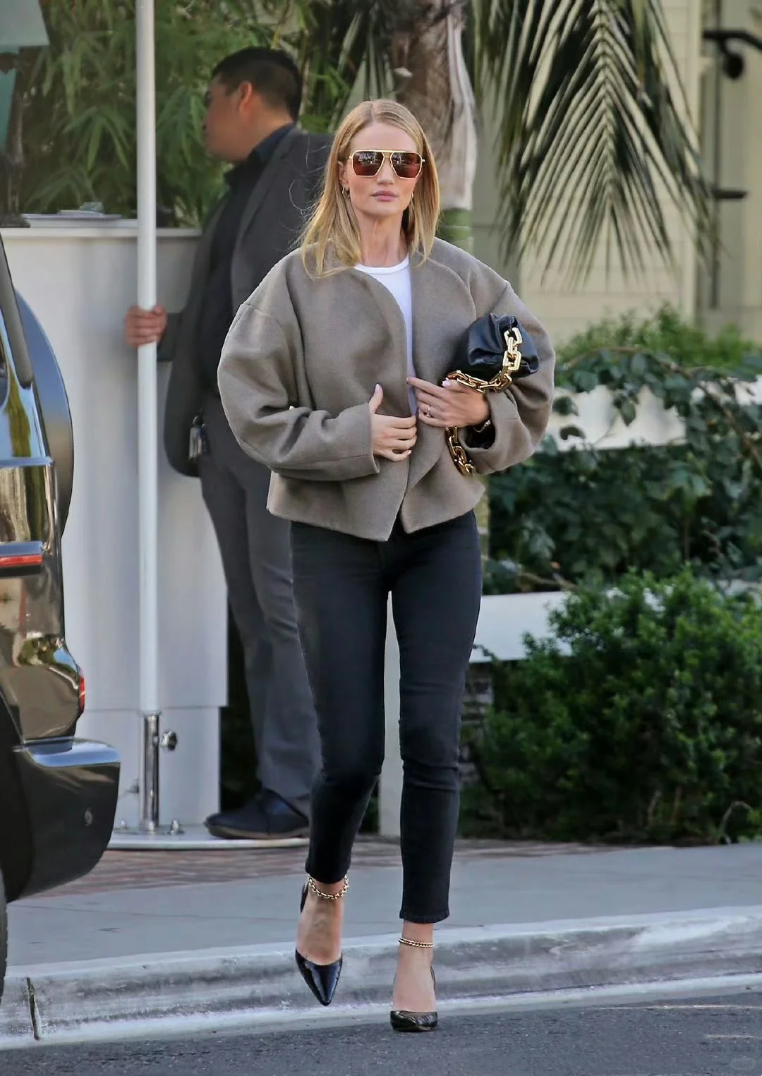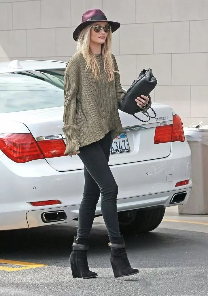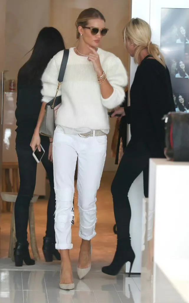 如果说夏天是清凉的热烈的时尚,那秋冬就是时尚达人的主战场了、参考Rosie Huntington-Whiteley14-17年间的街拍,优雅精致,美得恰到好处总是那么随性气质却不失亮点。\n \n她深喑细节的重要性,常用造型中的小心机为基础简约的搭配加分,她没有一样花哨的装备,纯色有质感的衬衣和毛衣是她的法宝,不同材质、颜色和款式让整体的穿搭和谐又很有层次质感。\n \n毛衣+牛仔裤+短靴or单鞋是最简约保暖又高级的秋冬搭配,纯色T恤或丝绸衬衣配皮衣或者廓形外套,显得有层次。🧣那个时候流行大包还有丝巾,这两单品一出来就是it girl,💼大包和高跟短靴让女王气场扑面而来。\n \n除此之外,利索大衣也穿得有声有色,身为2个孩子的母亲,Rosie的搭配看起来永远那么气场满满又女人味十足,秋冬时尚搭配方法get√\n \n#超模 #rosie #rosiehw #rosiehuntingtonwhiteley #超模穿搭 #欧美穿搭 #欧美明星街拍 #fashion#秋冬穿搭 #牛仔