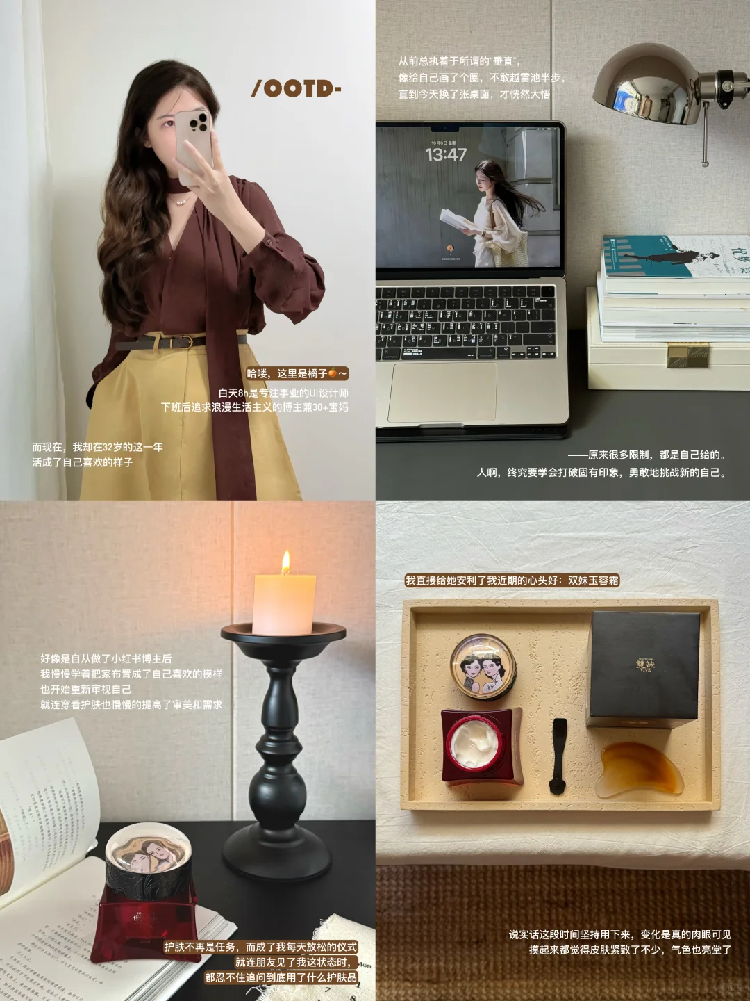 //💭\n网上有句话说的是女生一旦生了孩子\n她的人生就开始走下坡路\n曾经的我也以为女生的花期就只存在于二十几岁的时候\n \n而现在,我却在32岁的这一年\n活成了自己喜欢的样子\n \n-\n假期中见了很久不见的老朋友\n朋友惊讶到说我现在变化好大\n那种由内而外散发的从容和精致感是之前从来都没有的\n这个变化就连我自己都不曾发现\n \n真正的转折点,是我开始认真经营自己的生活\n学着把家布置成自己喜欢的模样\n也开始重新审视自己:\n30+的年龄,皮肤状态确实不如二十来岁时那般饱满有光泽\n从前觉得\"还年轻\"就可以敷衍的护肤步骤,现在看来是真的不行了。\n \n-\n于是,护肤不再是任务,而成了我每天放松的仪式。\n就连朋友见了我这状态时,都忍不住追问到底用了什么护肤品\n \n我直接给她安利了我近期的心头好:双妹玉容霜\n说实话这段时间坚持用下来,变化是真的肉眼可见\n摸起来都觉得皮肤紧致了不少,气色也亮堂了\n \n它的质地像天鹅绒似的滑溜溜\n涂在脸上一点不闷油,轻轻拍两下就吸收了\n最让我喜欢的是那股淡淡的玉兰香\n闻着特别高级,每次涂它护肤的愉悦感直接拉满\n \n不仅是护肤,现在的我穿衣服也不随便将就了\n更像是在表达自己的喜好\n化妆也不是为了讨好别人,而且为了取悦自己\n \n//💭\n我终于懂得:\n30+不是下坡路的开始,而是一个女人最好的年华。\n因为我们更懂自己,更知道如何选择\n也更有底气去追求想要的生活。\n \n所以,别信什么花期有限\n真正的花期,是从你开始爱自己的那一刻才刚刚开始\n \n-\n我是橘子🍊\n祝你明媚,熠熠生辉✨#双妹#双妹玉容霜#抗老面霜#日常plog #生活美学 #女性成长 #30而已 #精致女人 #贵气感 #浪漫生活的记录者