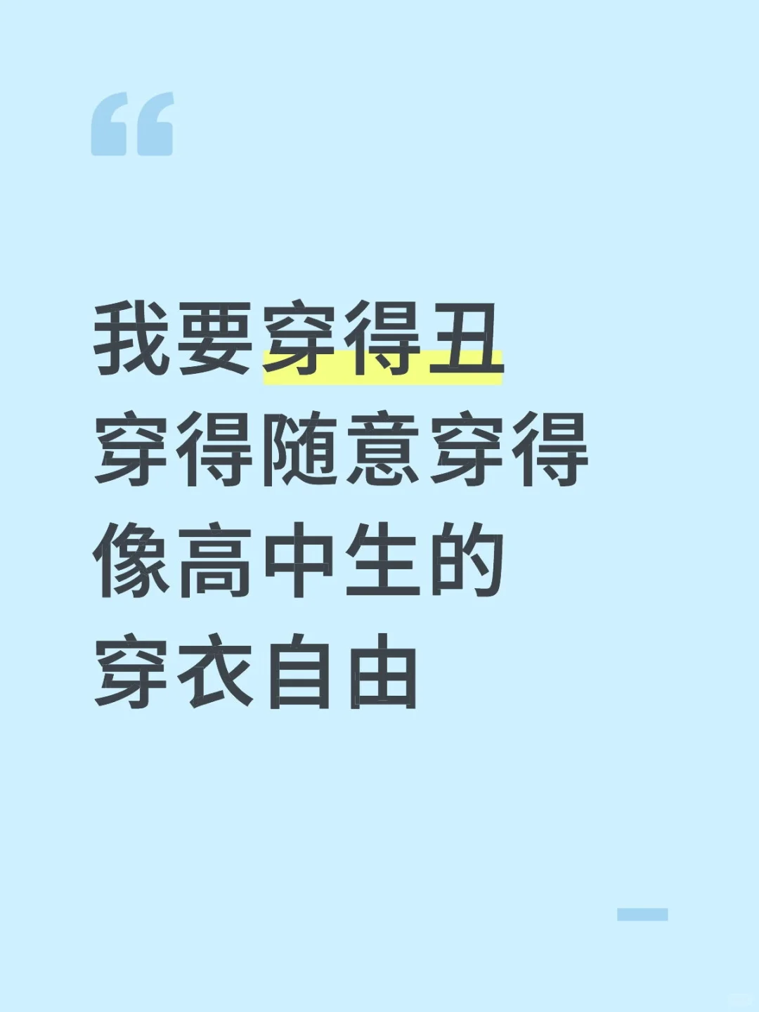 我要穿得丑穿得随意穿得像高中生的穿衣自由\n \n一到穿得性感穿得可爱穿得漂亮穿衣自由就浩浩荡荡打过来了,怎么没人维护我们屌丝穿搭遛弯穿搭中性穿搭土气穿搭的自由,我还想要睡衣穿搭自由。\n我大学了不化妆不打扮老是被说“没点大学生的样子”“像个高中生”,一开始还没咂摸到其中的不对劲,听多了真的烦了,怎么没人对素面朝天的男大学生说这些?怎么不说他们始终如一更像高中生呢?不是非得事事上升到这个角度,只是事实如此。\n从今天起,我要维护男人的穿衣自由。\n我是真心觉得男性也有爱美和打扮自己的权利,不要再被刻板印象绑架了。想做美甲想化妆想搞穿搭的男人你麻利去弄吧,本人会在背后默默支持你的,就像父爱无声那样。开玩笑的,我是真的支持。真的。\n#穿衣自由\n#尊重男性穿衣自由\n#结扎 #宝宝辅食