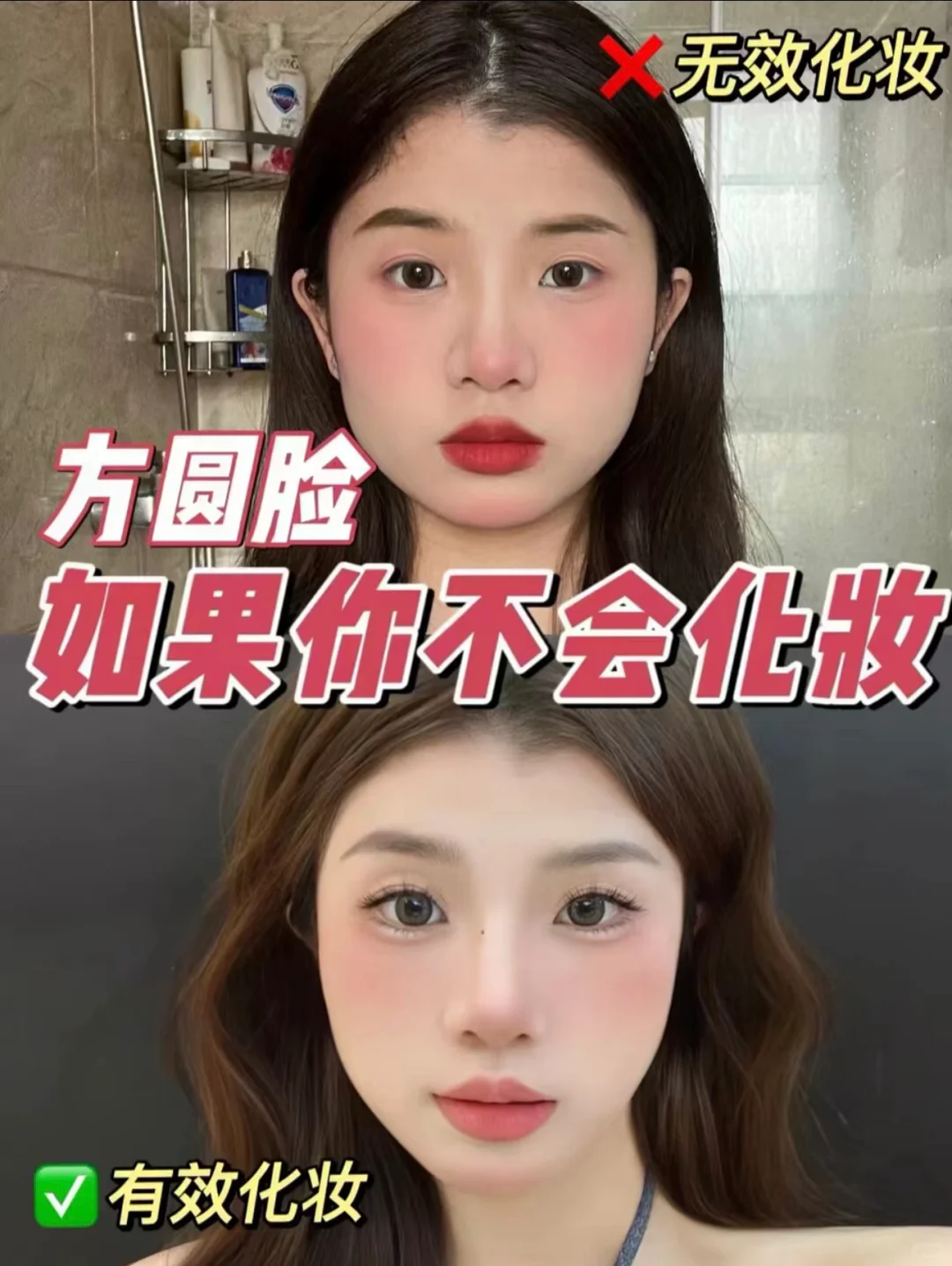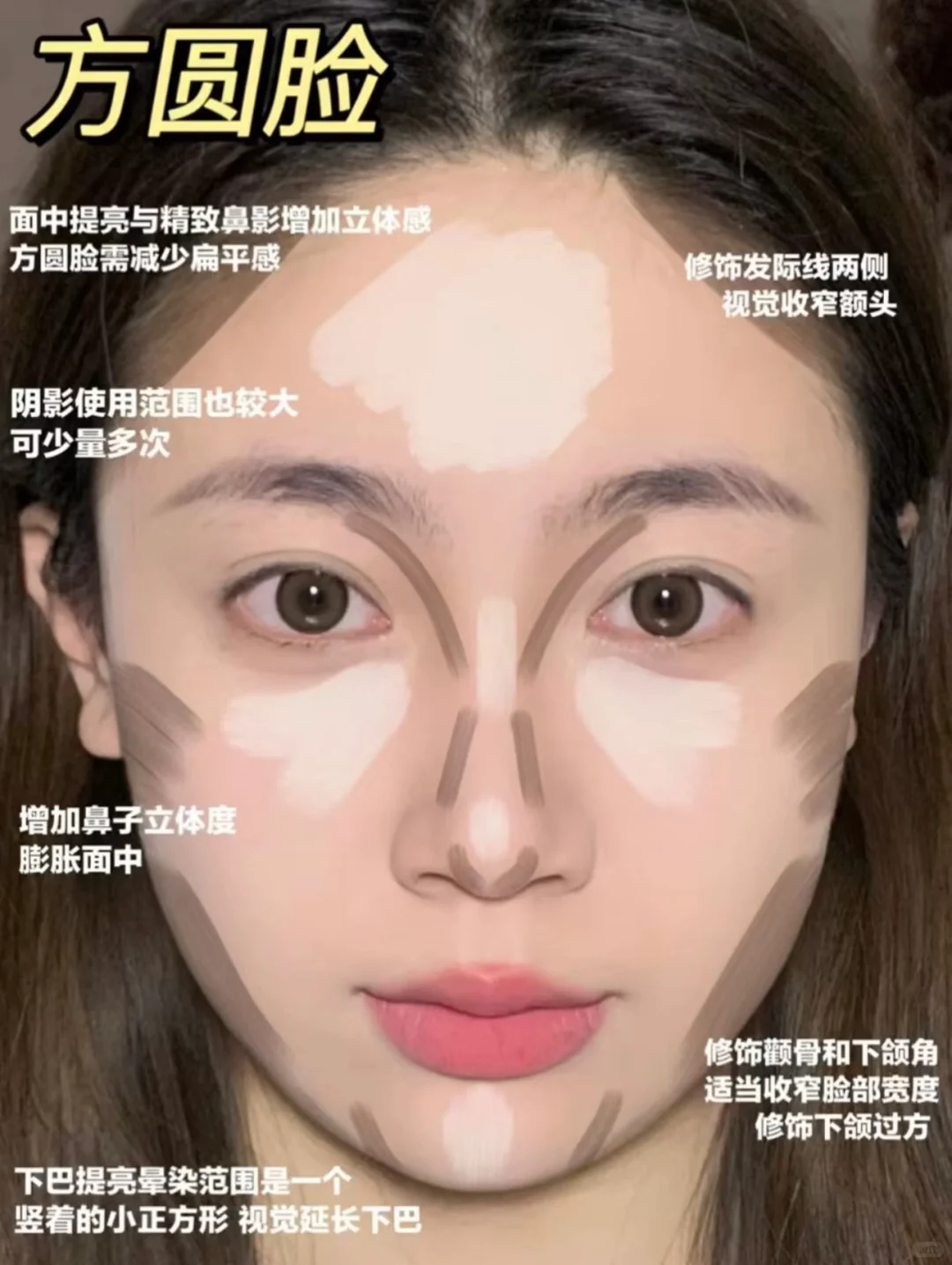 #更好的自己 #方圆脸 #适合女生 #方圆脸变美思路 #方圆脸妆容 #方脸 方圆脸变美总结1化妆粉眉毛:X平直眉会加重脸型的方正感。\n√整体微微上扬,眉尾缓和落下,提高脸部折叠,更加修饰脸型。口红:X避免涂得太厚重,会让视觉中心在嘴唇。\nX边界棱角分明,显村显老显笨重。\n√弱化边界感,唇形明显会加重脸型棱角感。\n√唇中颜色重,唇边颜色浅。修容:\nX斜着画侧影,脸凹,颧骨更突出。\nX嘴修容,嫌脏没效果,还一整个见光死。\n√梯形修容\n用灰棕色的修容,在下颚线来一笔,平行于这条线,在颧骨后方往前再画一笔,范围不要超过外眼角,接着侧面竖直加一笔,让两条线连接更自然。