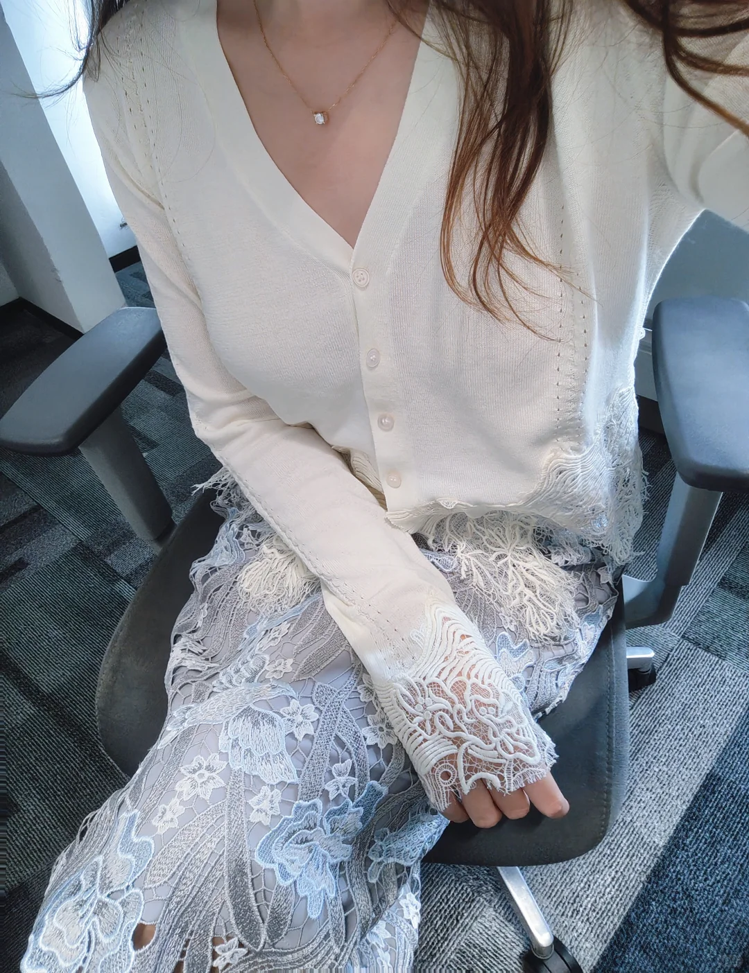 今天回到舒适区\n蕾丝搭配写了我的名字!\n这件开衫扣起来穿也好看\n \n突然发现会议穿这套很适合\n桌子以上的部分还是很严谨\n亮点全在腰以下\n这衣服真是太懂打工人了\n精致和干练我都要\n#日常通勤穿搭也要美 #蕾丝上衣 #精致氛围感 #一身温柔力