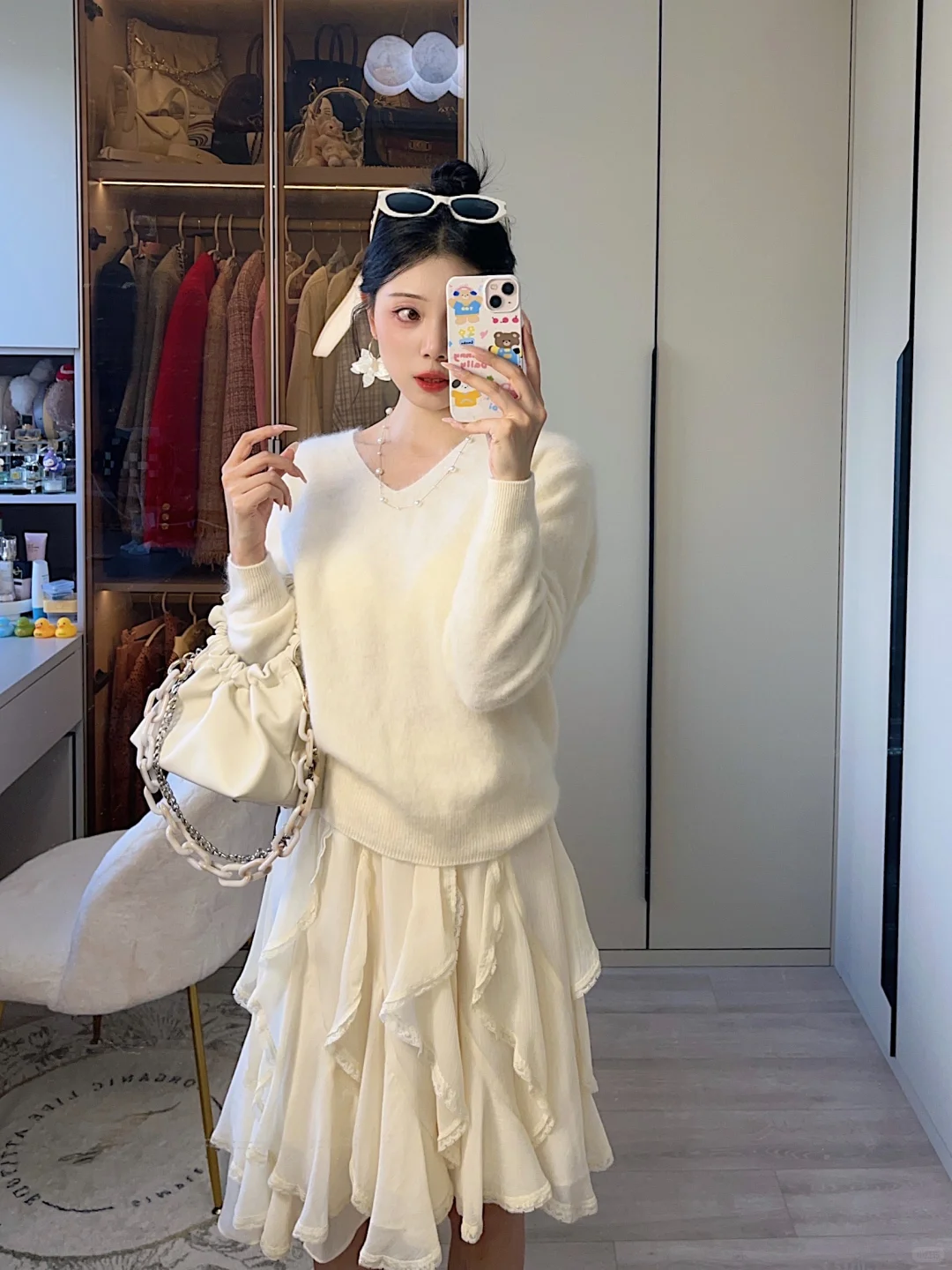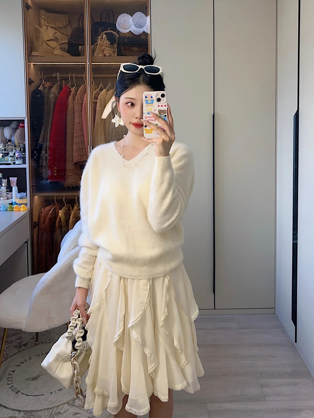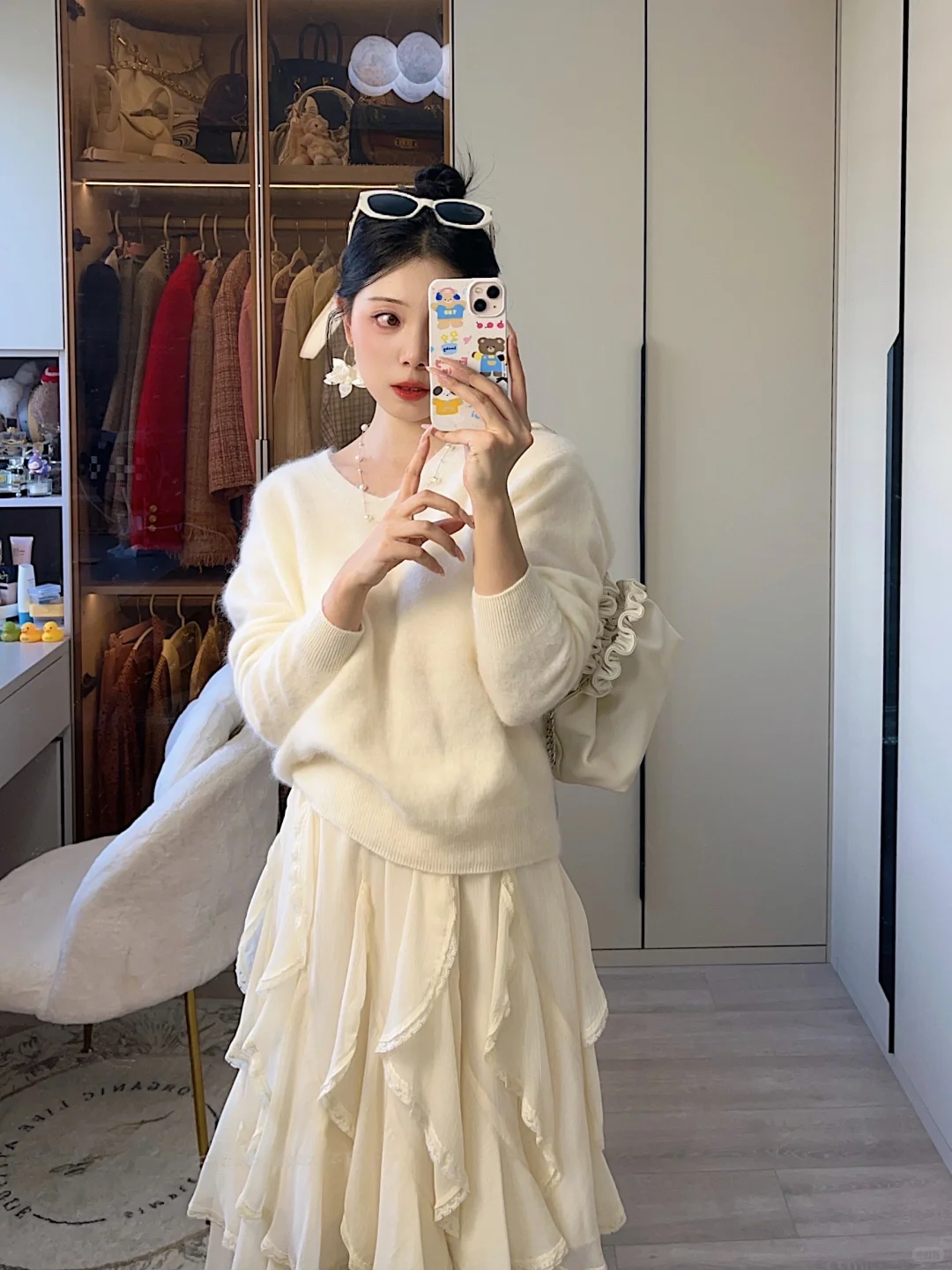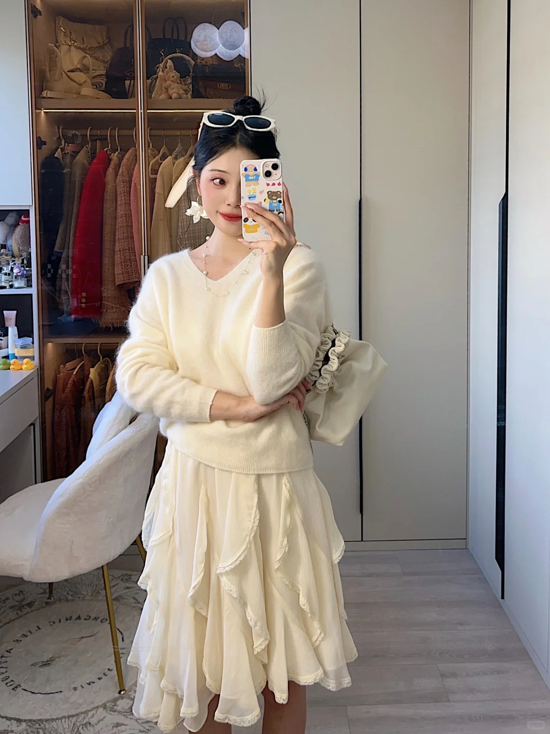 白色毛衣+蕾丝半裙 | 一身白是我本命!