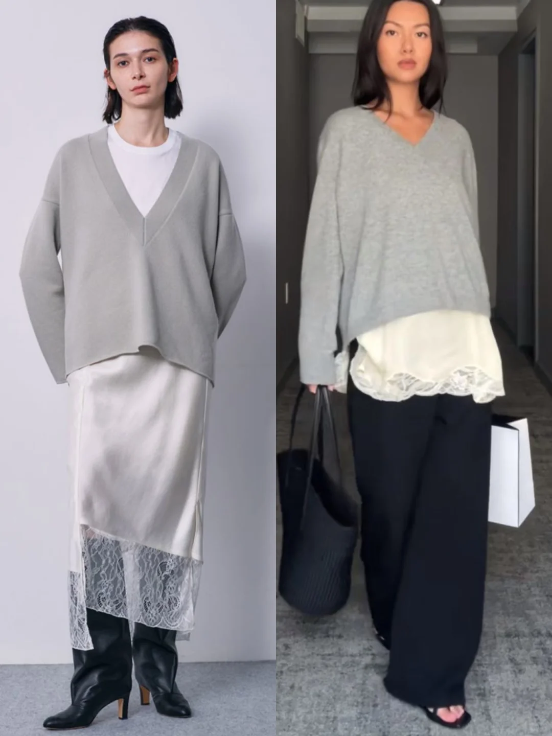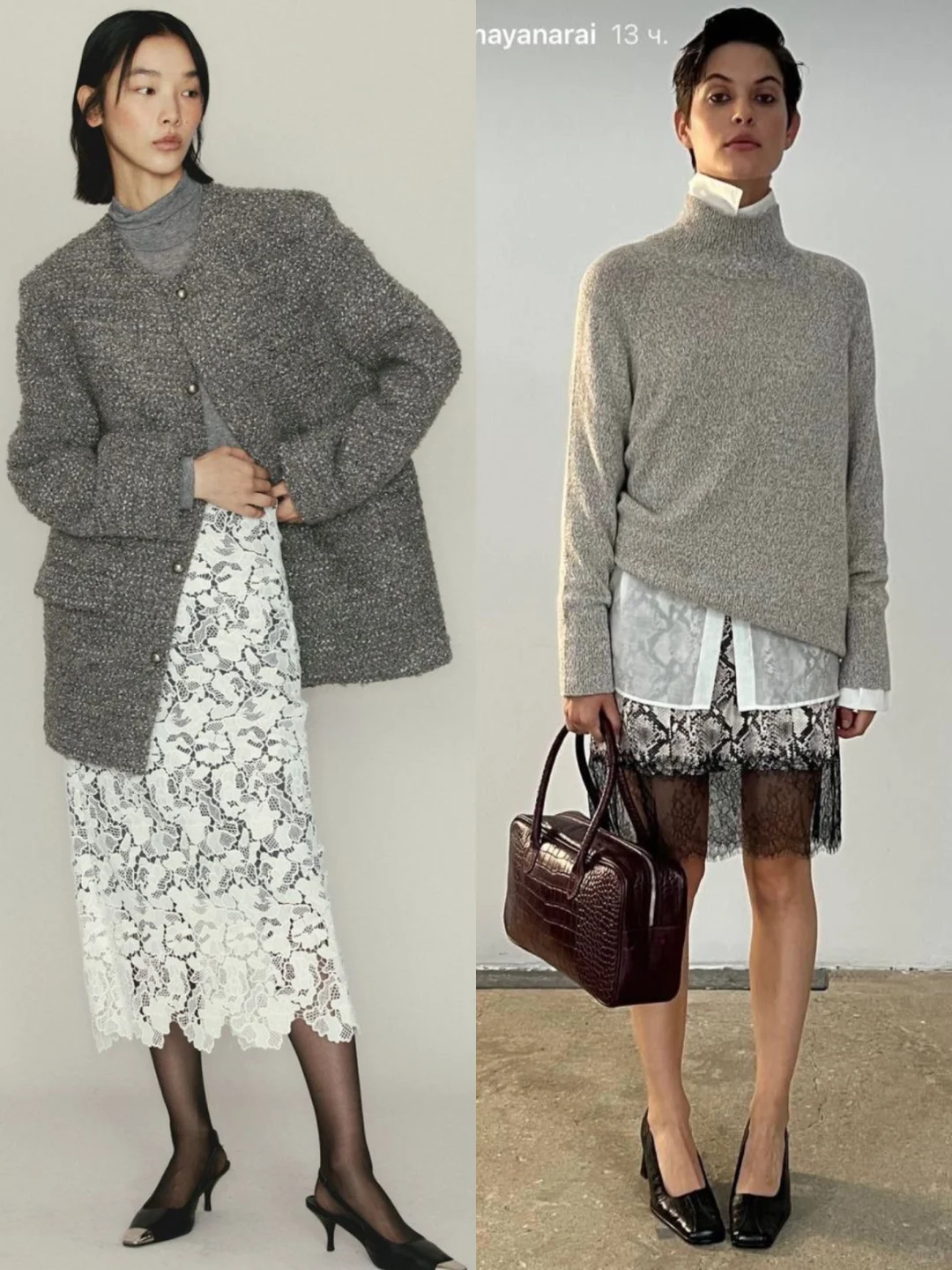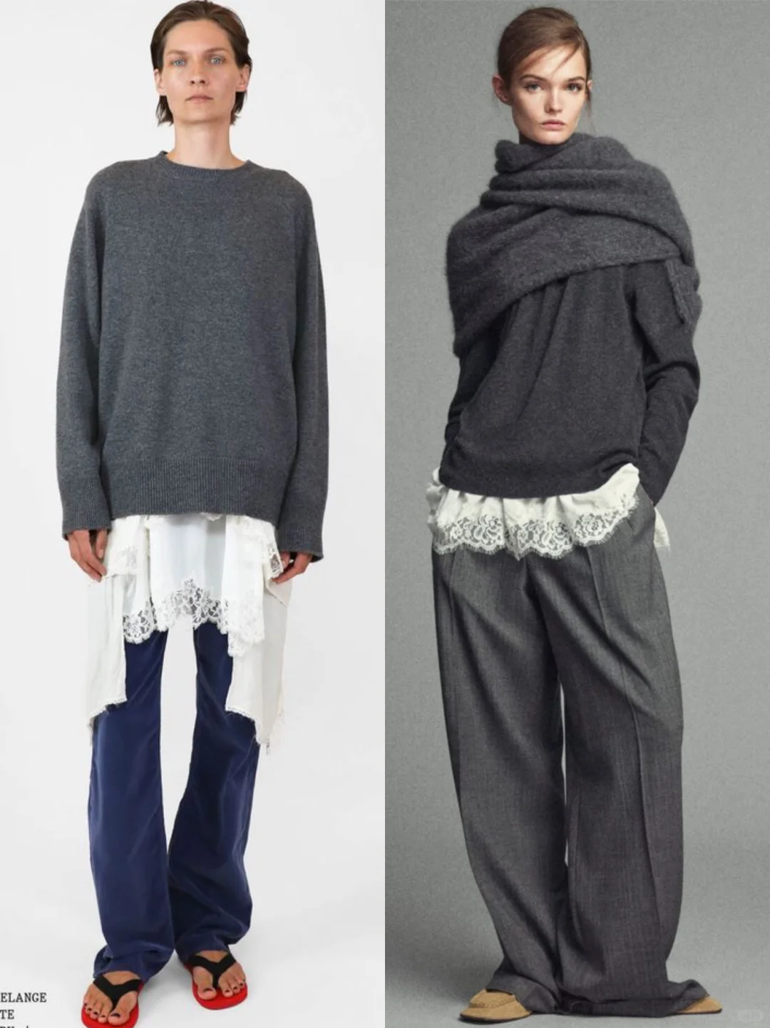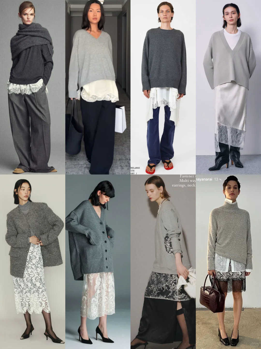 时尚圈的“矛盾美学”又升级了!羊绒与蕾丝的碰撞成为2025秋冬前沿趋势——用羊绒的温暖厚重中和蕾丝的细腻柔美,打造兼具高级感与层次感的叠穿风格,时髦精们快马住~\n🔍趋势核心:柔与刚的材质对话\n• 上装:oversize羊绒衫、针织开衫(灰度系为主,营造低调高级感)\n• 下装/内搭:蕾丝半裙、蕾丝衬裙(白色/黑色蕾丝,增加柔美细节)\n• 搭配:阔腿西裤、丝绒裤、尖头鞋/乐福鞋,用中性单品平衡甜腻感\n🎬4套Look拆解,每套都戳中审美点\nLook1 极简高级通勤风\n• 穿搭:深灰羊绒叠穿蕾丝衬裤+灰色阔腿西裤+驼色穆勒鞋\n• 亮点:羊绒披肩式穿法+蕾丝细节若隐若现,通勤穿既显品味又不浮夸,金融圈、设计圈都适配\nLook2 都市休闲柔飒风\n• 穿搭:浅灰V领羊绒衫+白色蕾丝衬裙+黑色阔腿裤+黑白托特包\n• 亮点:短款羊绒衫露出蕾丝边,休闲中带点小性感,逛街、咖啡探店穿超吸睛\nLook3 个性混搭潮人风\n• 穿搭:深灰圆领羊绒衫+白色蕾丝长衬裙+藏青丝绒裤+红色夹脚拖\n• 亮点:羊绒的暖与蕾丝的柔,再撞色丝绒裤和夹脚拖,小众混搭风拉满,音乐节、艺术展穿搭首选\nLook4 轻熟复古名媛风\n• 穿搭:浅灰V领羊绒衫+白色蕾丝衬裙+黑色皮靴\n• 亮点:长款蕾丝衬裙增加层次,皮靴强化飒感,晚宴、约会穿这套直接美到失语\nLook5 法式优雅风\n• 穿搭:花灰色针织开衫+白色蕾丝半裙+黑色丝袜高跟鞋\n• 亮点:针织的纹理与蕾丝的精致呼应,法式优雅感拉满,上班、下午茶都很得体\nLook6 慵懒知性风\n• 穿搭:灰绿色羊绒开衫+白色蕾丝半裙+黑色尖头高跟鞋\n• 亮点:oversize开衫的慵懒与蕾丝半裙的柔美碰撞,日常出街随性又有格调\nLook7 复古奢华风\n• 穿搭:浅灰针织衫+黑白蕾丝半裙+黑色高跟鞋\n• 亮点:蕾丝的复古花纹与针织的简约结合,再搭配珍珠配饰,复古奢华感绝了\nLook8 极简酷感风\n• 穿搭:浅灰高领羊绒衫+蕾丝衬裙+黑色皮鞋+棕色复古包\n• 亮点:高领羊绒的酷感与蕾丝的\n#2025秋冬趋势 #羊绒蕾丝叠穿 #高级感穿搭 #矛盾美学 #廓系穿搭 #松弛感穿搭 #穿搭灵感 #镂空设计 #蕾丝上衣 #低调奢华穿搭