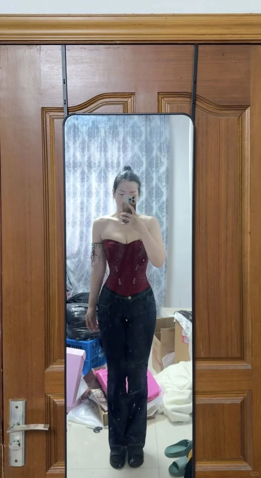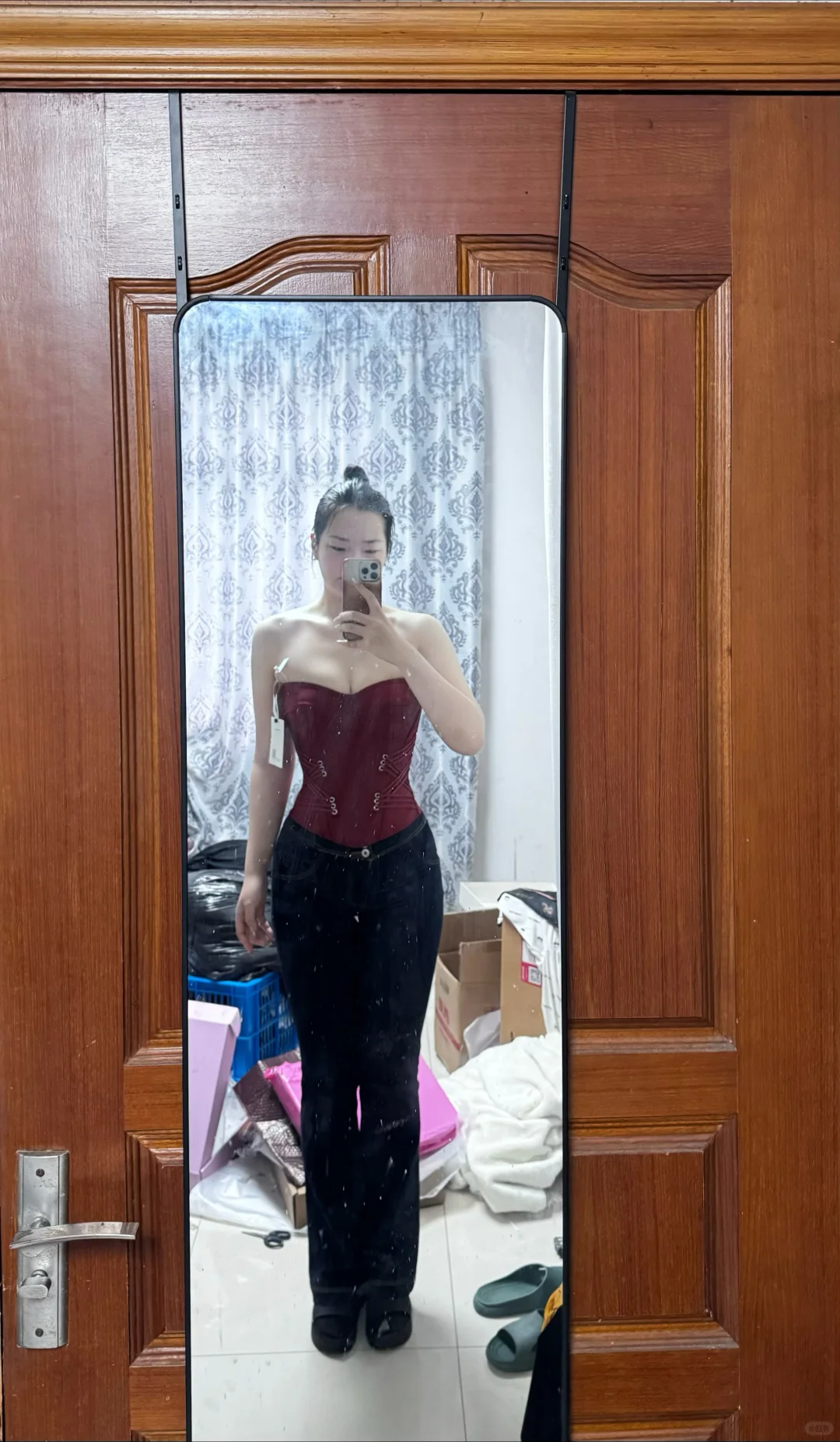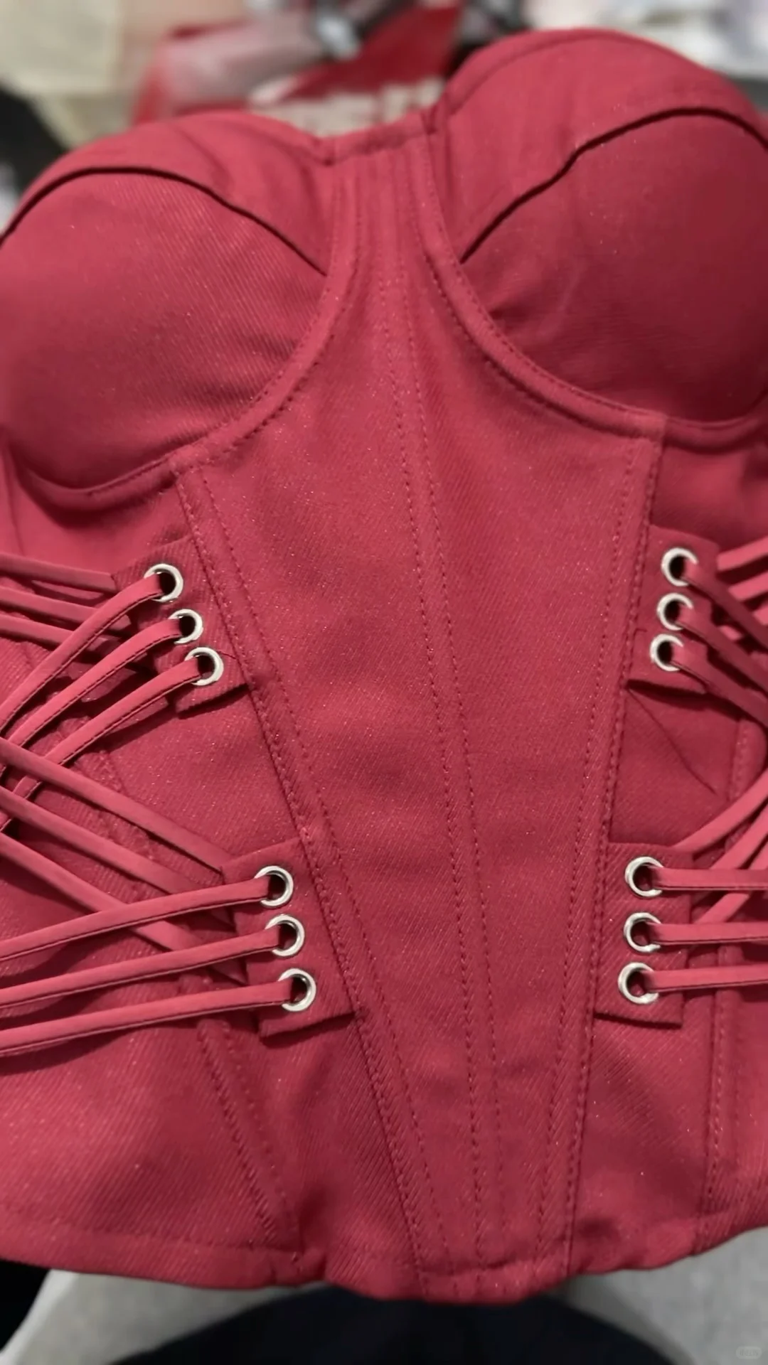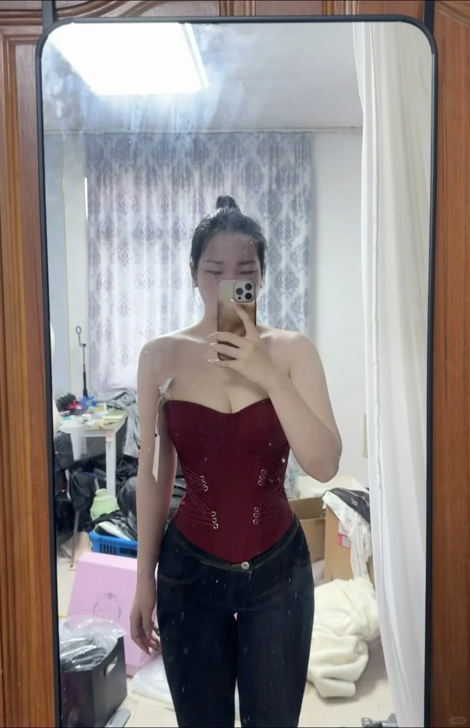 manrui新版不戳!这个面料是有点亮晶晶的斜纹布!蛮好看。颜色和图2图4差不多,其他拍的要么锐化了(图3……)要么拍的偏暖\n看详情页说小1-2cm,果然是小一些,我觉得像我一样在前段的正码拍就行!前中段腰围人,不想卡码拍小还想要强收腰效果的话这款正码正拍是一个很不错的选择,因为偏小一点✌🏻罩杯比他们之前的看起来窄一点,没那么大一个了。收腰效果依旧不戳!我一直觉得她们家的收腰效果,视觉上是各品牌里zui收的。\n老板发帖说上身可能有点褶子,我觉得不明显,因为最出褶子的地方被盖住了。这个很惊喜😲\n唯一纠结的点是我这件罩杯有点皱皱,我不知道是我个例还是都这样。你们觉得好看吗?\n#微胖女孩穿搭 #粗沙漏身材 #鱼骨胸衣 #抹胸 #服装测评 #绯色 #manrui #红色系
