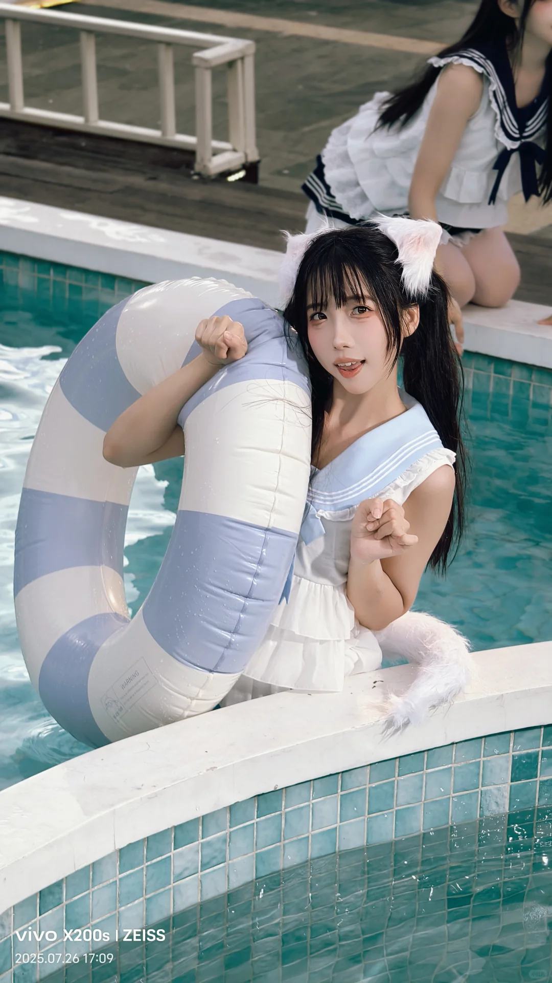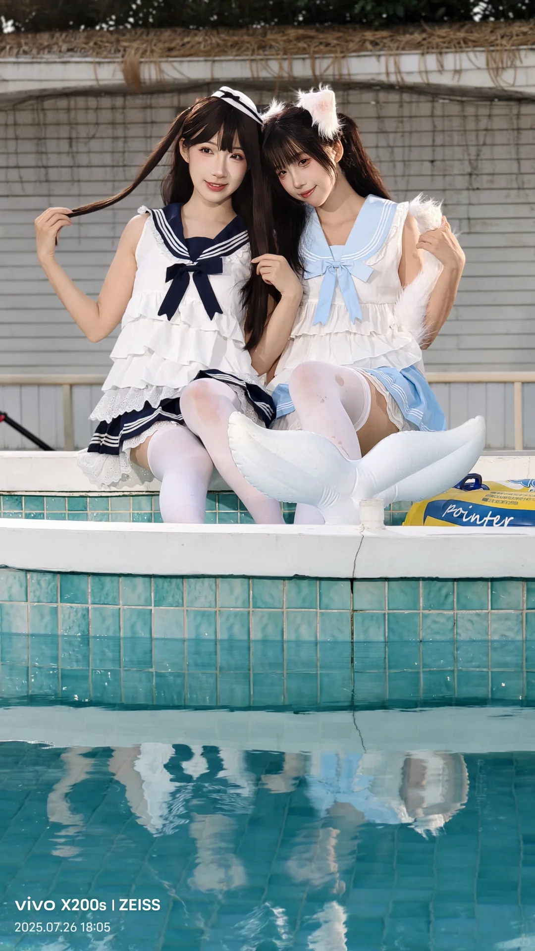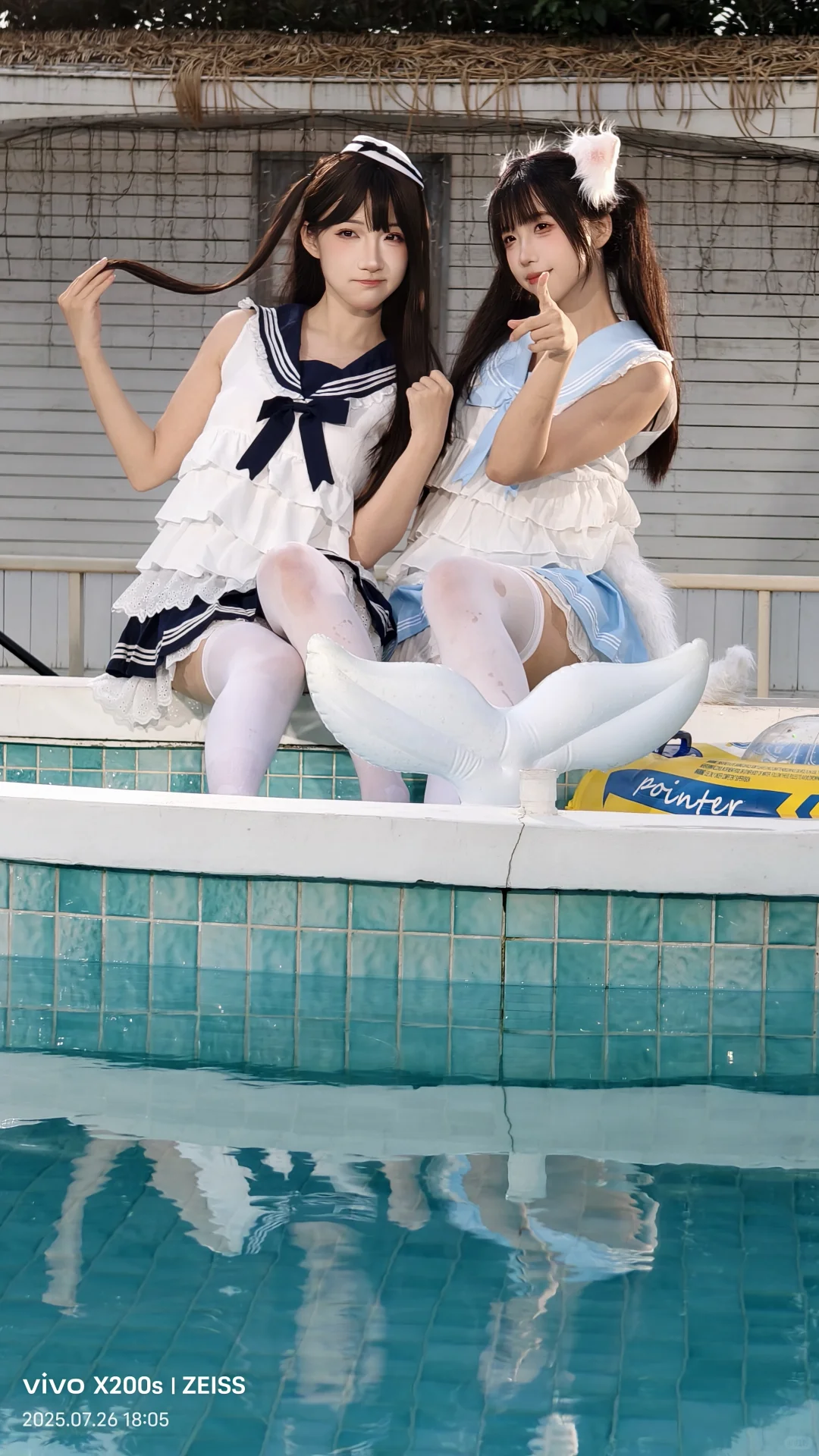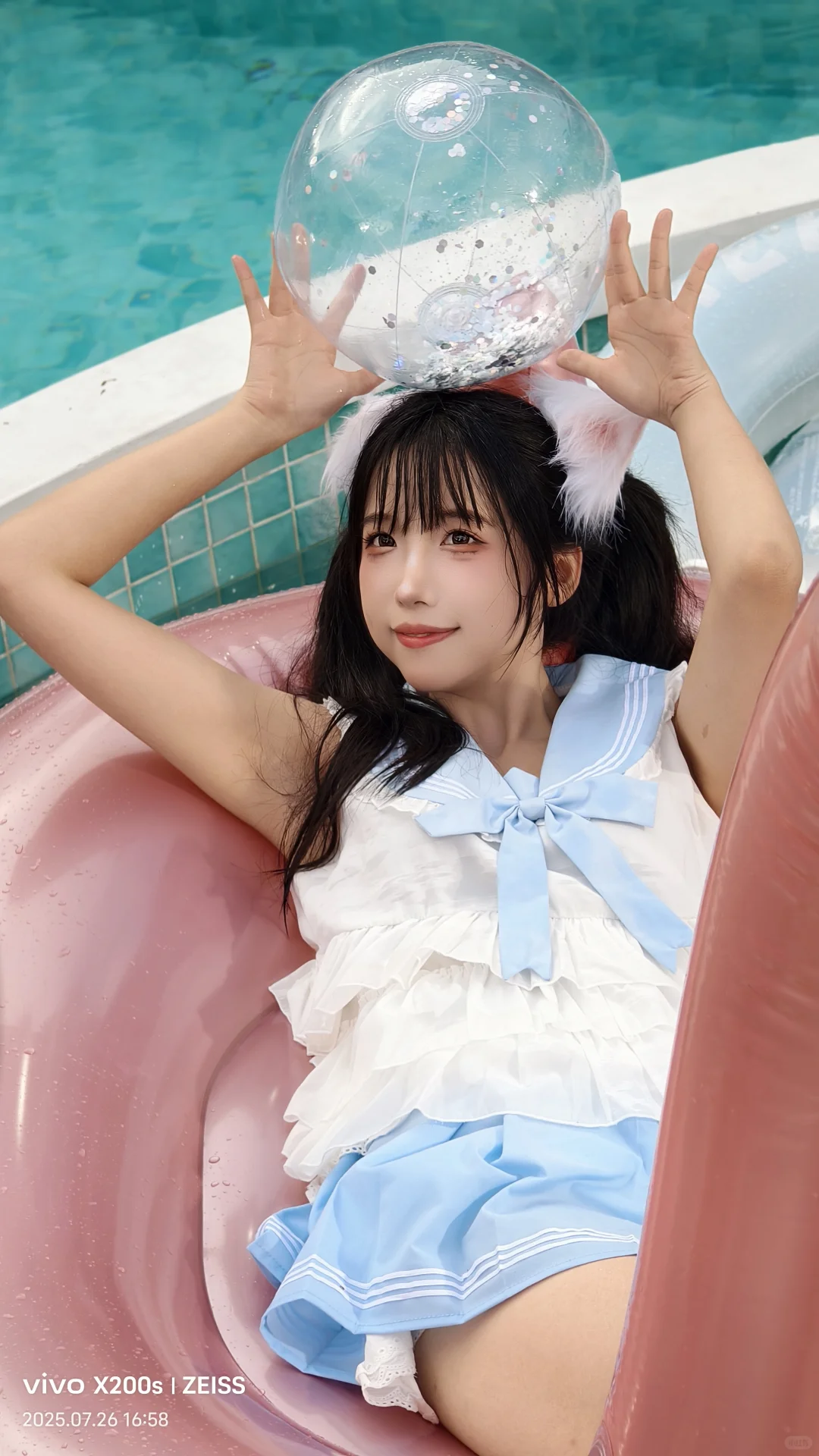 【泳池边的奶糖味心动💗】\n阳光33℃+,我把海盐汽水的气泡声留在了身后,只带了两件小东西:\n1️⃣ 奶油白丝绑带lolita娃娃裙 还有学院风水手服lolita裙(小心机:尾巴在腰后,转身才会被看到哦)\n2️⃣ 一杯加冰的草莓椰乳(用来降温,也用来当拍照道具📸)\n \n镜头拉近,裙摆飘起来像没拆开的奶糖纸,白丝在脚踝晃呀晃,踩水时溅起的碎钻光斑比高光还闪。\n \n📌tips:\n- 发带选同色蕾丝,低头整理头发的瞬间=纯欲绝杀\n- 滤镜用“胶片负片”,把泳池蓝调成薄荷冰淇淋色\n设备vivoX200s\n如果是相机拍摄 需要快门在1/250以上才能拍出水珠的效果\n虽然X200s是V2芯片 但是ai背景的效果杠杠的\n@vivo @宝矿力水特\n@摄影薯 @生活薯 @薯队长 #泳池写真 #泳装 #泳装ootd #白丝控 #一起来玩水吧
