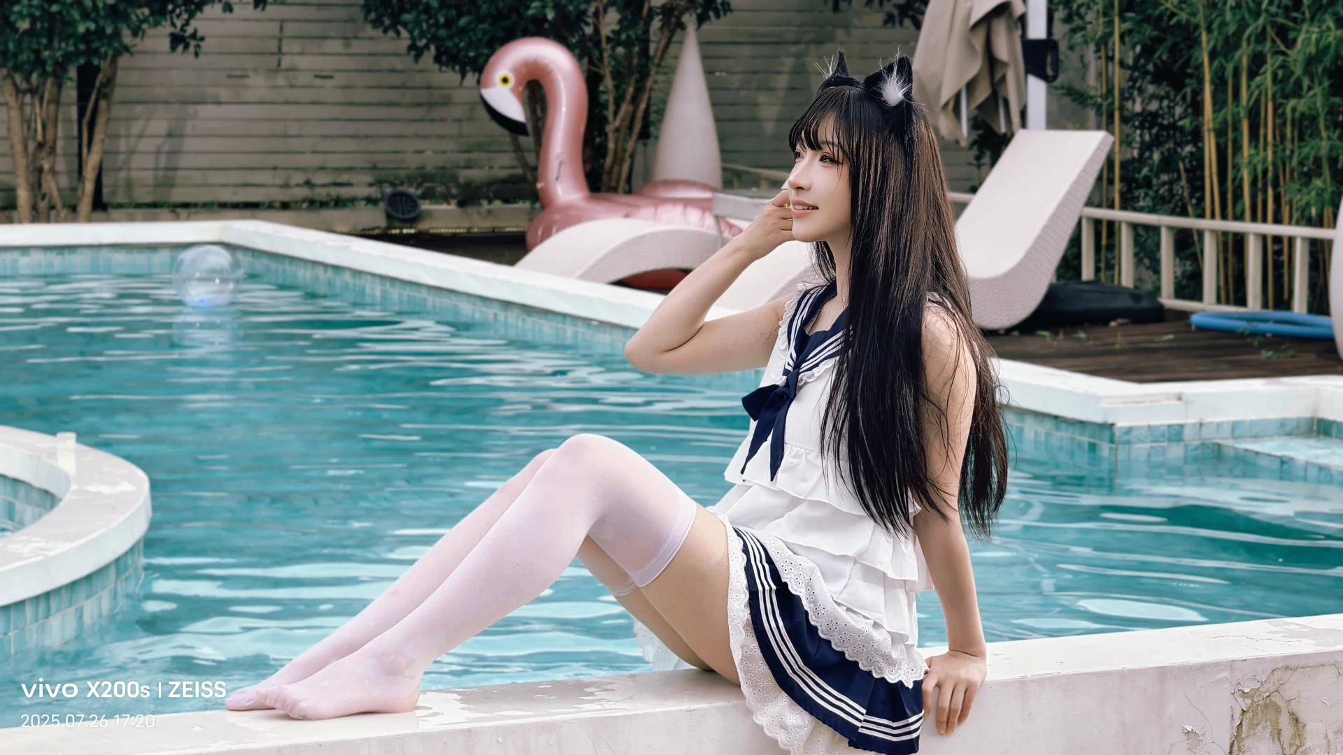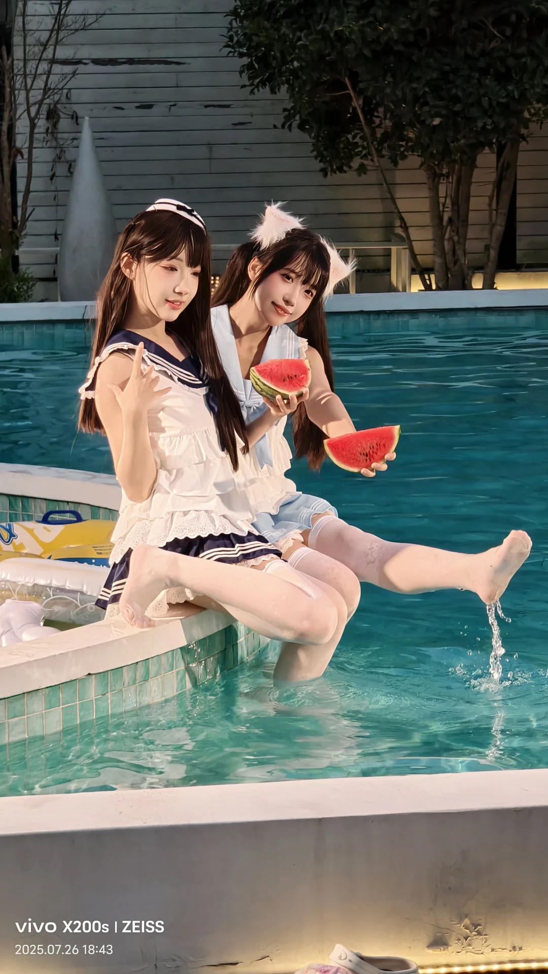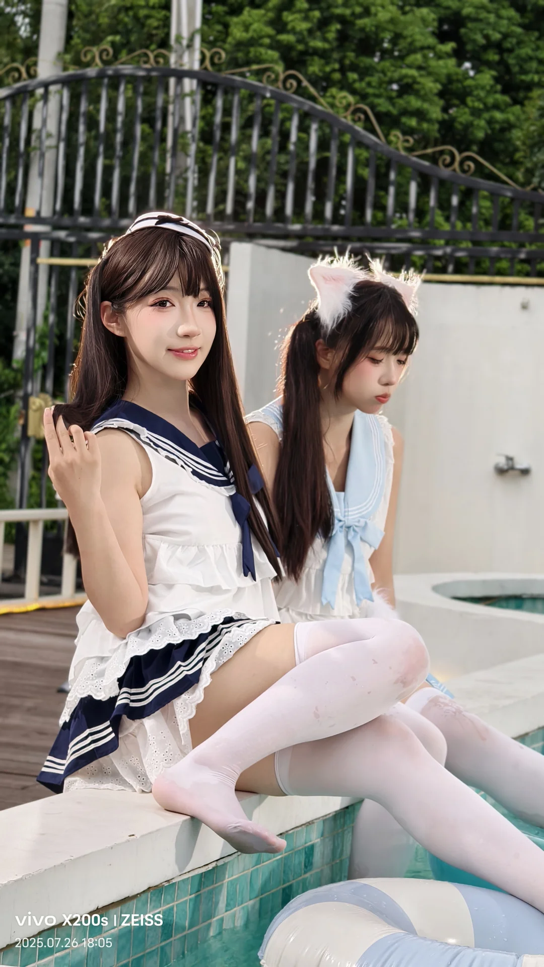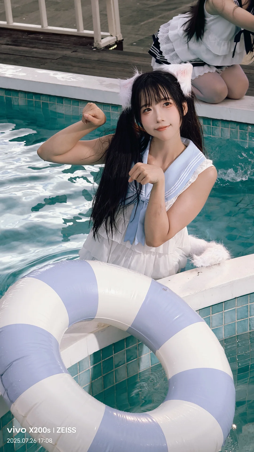 【泳池边的奶糖味心动💗】\n阳光33℃+,我把海盐汽水的气泡声留在了身后,只带了两件小东西:\n1️⃣ 奶油白丝绑带lolita娃娃裙 还有学院风水手服lolita裙(小心机:尾巴在腰后,转身才会被看到哦)\n2️⃣ 一杯加冰的草莓椰乳(用来降温,也用来当拍照道具📸)\n \n镜头拉近,裙摆飘起来像没拆开的奶糖纸,白丝在脚踝晃呀晃,踩水时溅起的碎钻光斑比高光还闪。\n \n📌tips:\n- 发带选同色蕾丝,低头整理头发的瞬间=纯欲绝杀\n- 滤镜用“胶片负片”,把泳池蓝调成薄荷冰淇淋色\n设备vivoX200s\n如果是相机拍摄 需要快门在1/250以上才能拍出水珠的效果\n虽然X200s是V2芯片 但是ai背景的效果杠杠的\n@vivo @宝矿力水特\n@摄影薯 @生活薯 @薯队长 #泳池写真 #泳装 #泳装ootd #白丝控 #一起来玩水吧