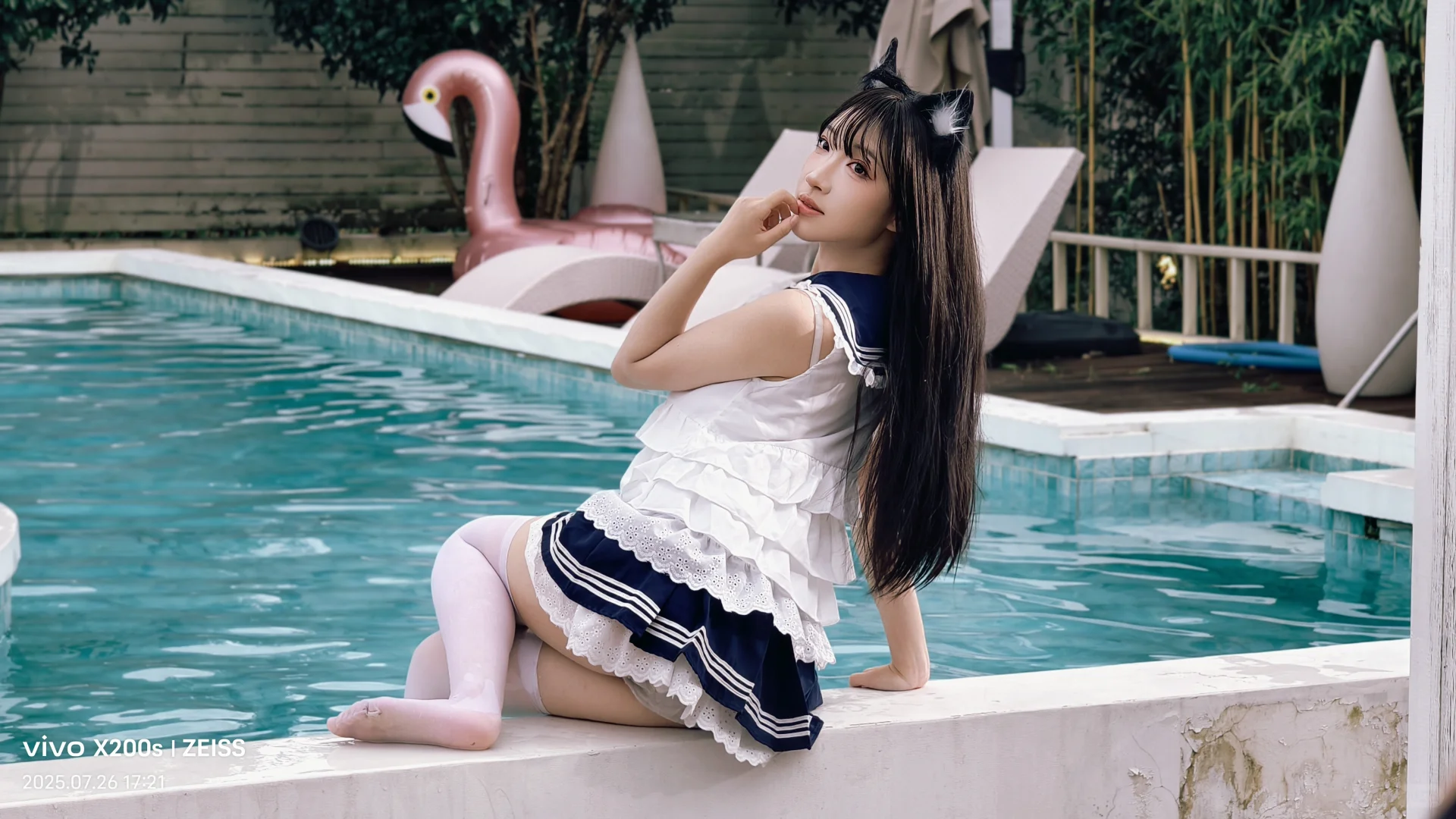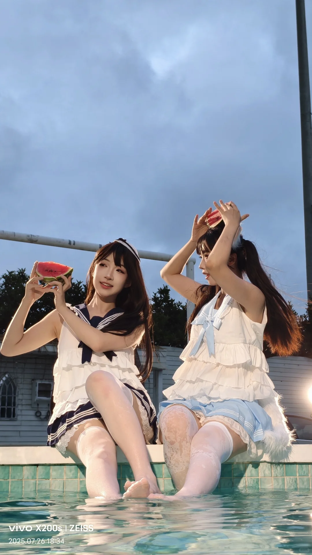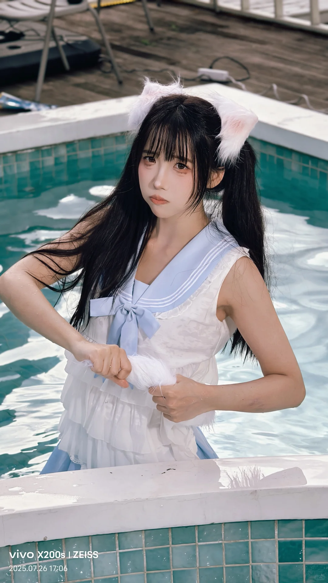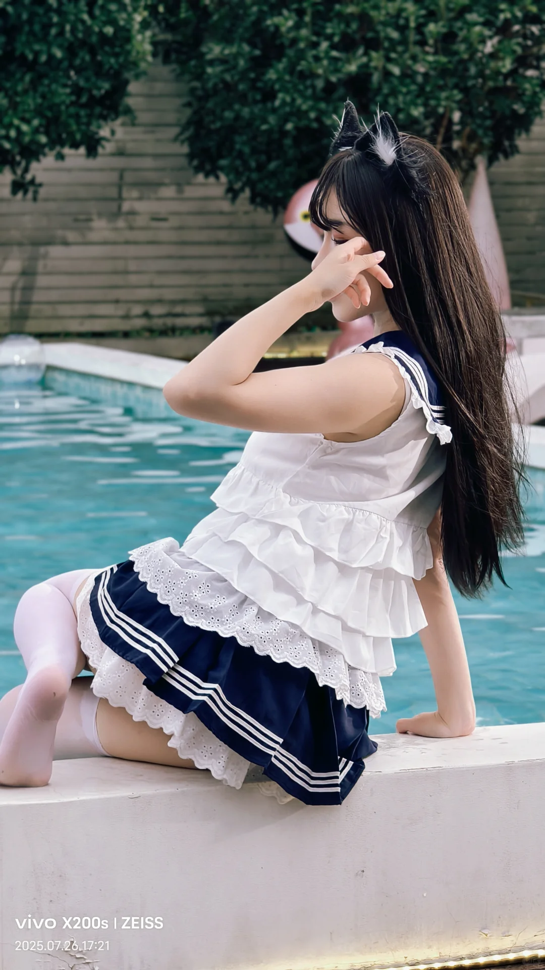 【泳池边的奶糖味心动💗】\n阳光33℃+,我把海盐汽水的气泡声留在了身后,只带了两件小东西:\n1️⃣ 奶油白丝绑带lolita娃娃裙 还有学院风水手服lolita裙(小心机:尾巴在腰后,转身才会被看到哦)\n2️⃣ 一杯加冰的草莓椰乳(用来降温,也用来当拍照道具📸)\n \n镜头拉近,裙摆飘起来像没拆开的奶糖纸,白丝在脚踝晃呀晃,踩水时溅起的碎钻光斑比高光还闪。\n \n📌tips:\n- 发带选同色蕾丝,低头整理头发的瞬间=纯欲绝杀\n- 滤镜用“胶片负片”,把泳池蓝调成薄荷冰淇淋色\n设备vivoX200s\n如果是相机拍摄 需要快门在1/250以上才能拍出水珠的效果\n虽然X200s是V2芯片 但是ai背景的效果杠杠的\n@vivo @宝矿力水特\n@摄影薯 @生活薯 @薯队长 #泳池写真 #泳装 #泳装ootd #白丝控 #一起来玩水吧