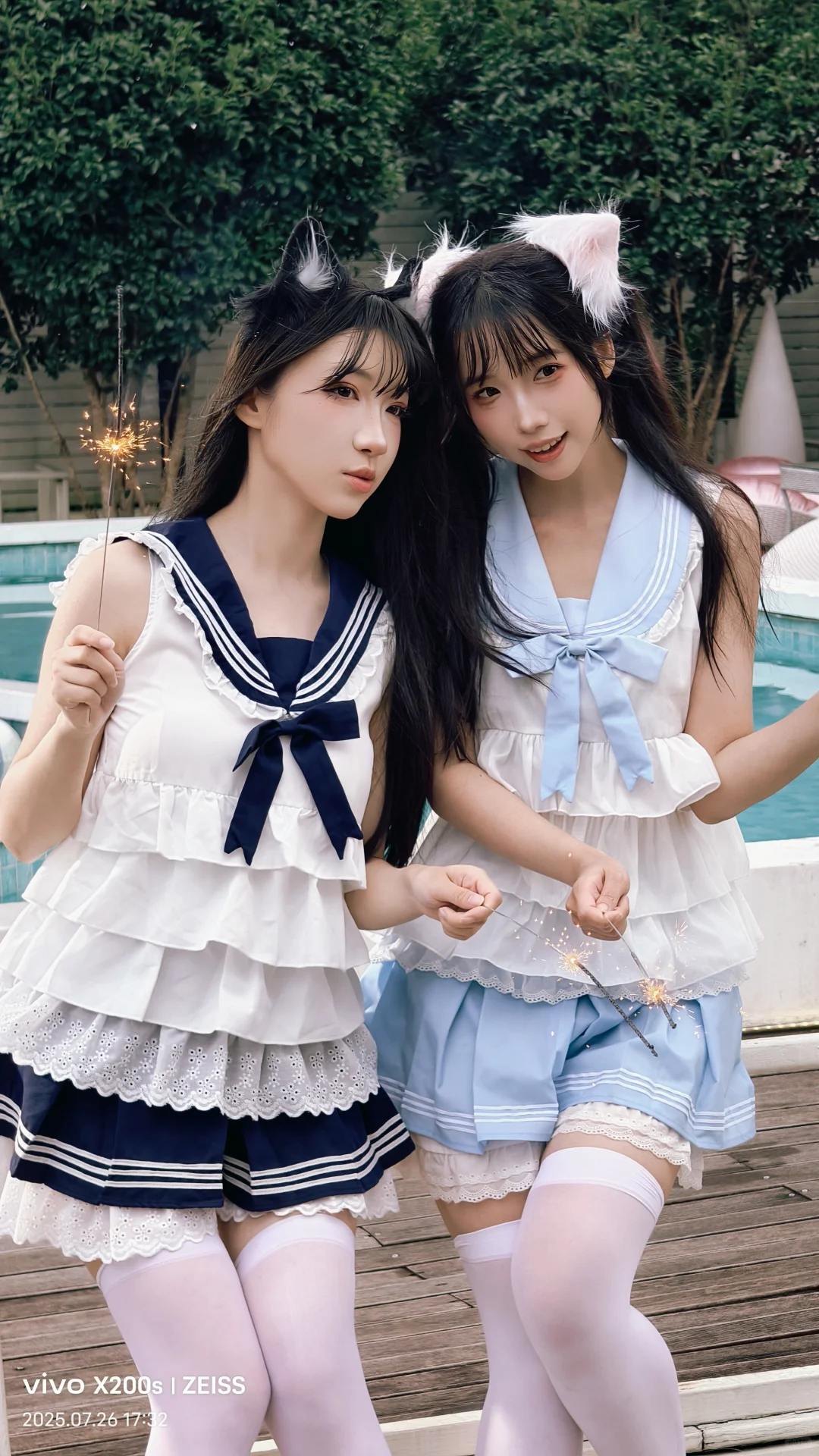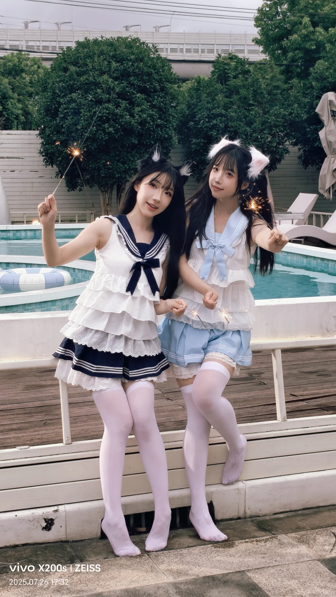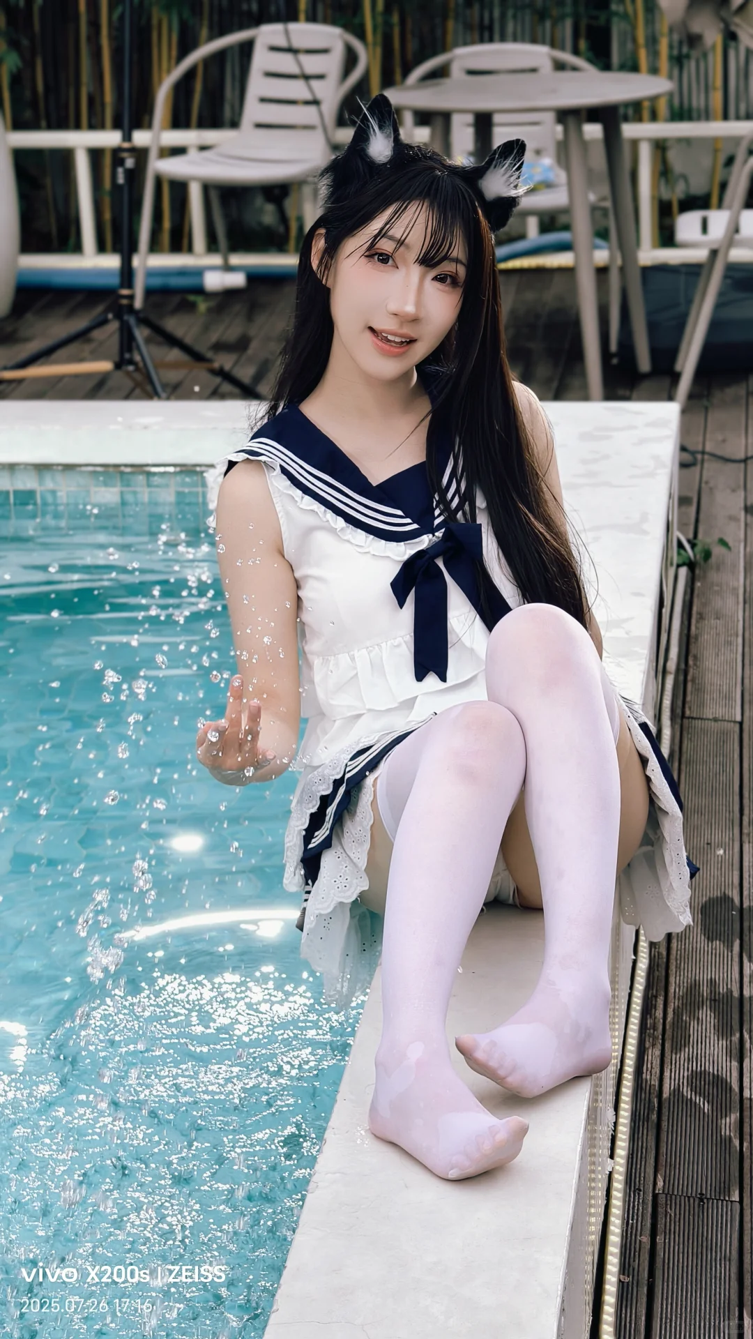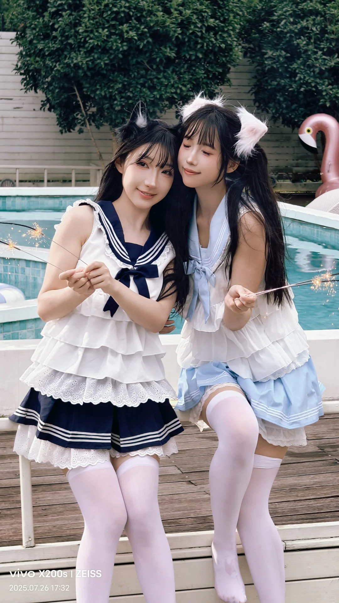 【泳池边的奶糖味心动💗】\n阳光33℃+,我把海盐汽水的气泡声留在了身后,只带了两件小东西:\n1️⃣ 奶油白丝绑带lolita娃娃裙 还有学院风水手服lolita裙(小心机:尾巴在腰后,转身才会被看到哦)\n2️⃣ 一杯加冰的草莓椰乳(用来降温,也用来当拍照道具📸)\n \n镜头拉近,裙摆飘起来像没拆开的奶糖纸,白丝在脚踝晃呀晃,踩水时溅起的碎钻光斑比高光还闪。\n \n📌tips:\n- 发带选同色蕾丝,低头整理头发的瞬间=纯欲绝杀\n- 滤镜用“胶片负片”,把泳池蓝调成薄荷冰淇淋色\n设备vivoX200s\n如果是相机拍摄 需要快门在1/250以上才能拍出水珠的效果\n虽然X200s是V2芯片 但是ai背景的效果杠杠的\n@vivo @宝矿力水特\n@摄影薯 @生活薯 @薯队长 #泳池写真 #泳装 #泳装ootd #白丝控 #一起来玩水吧