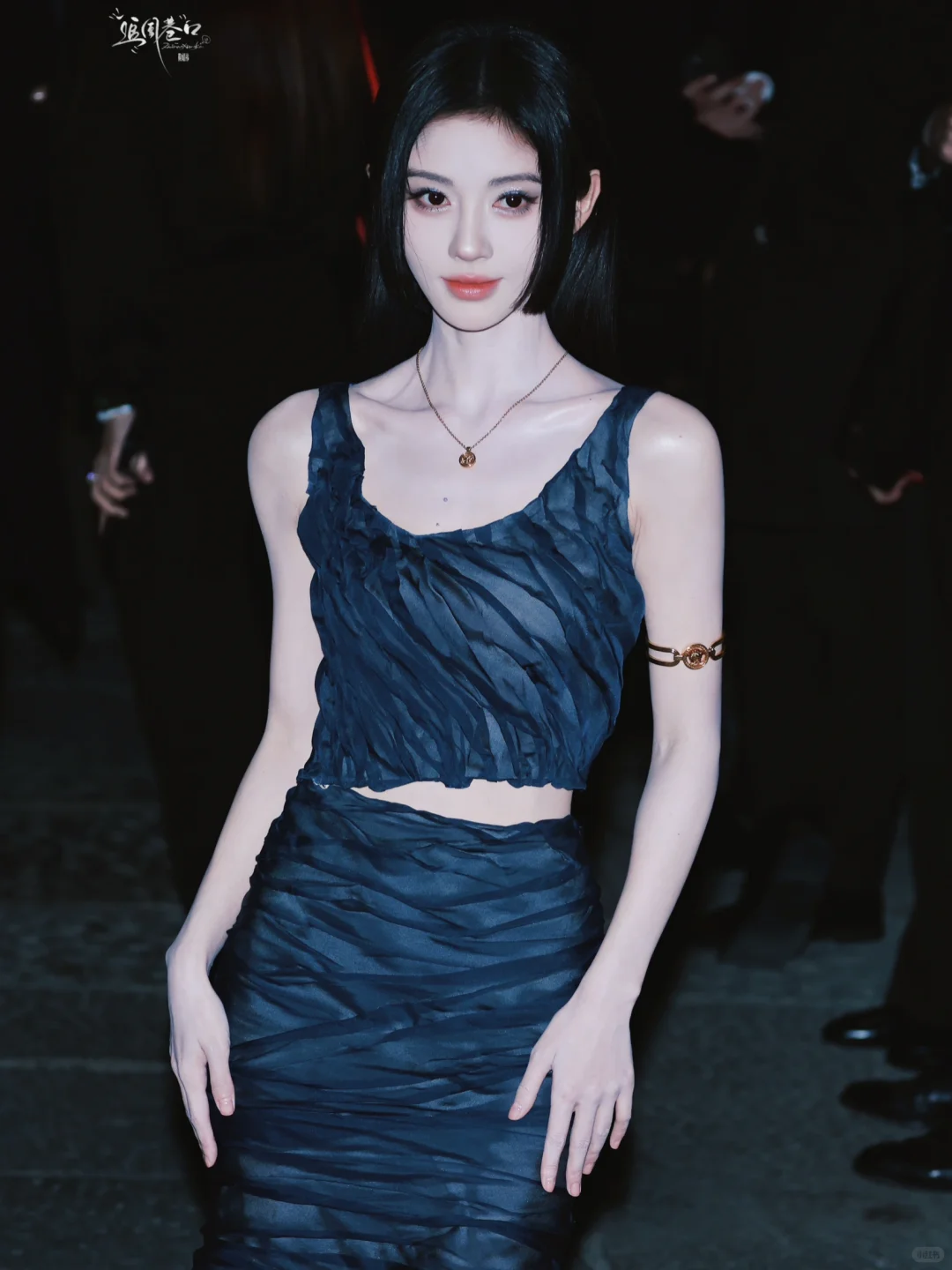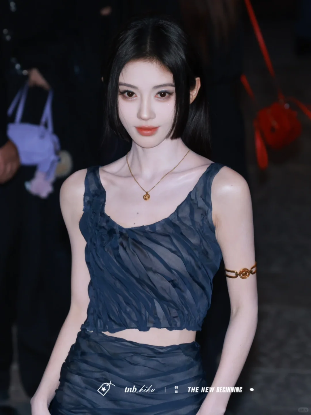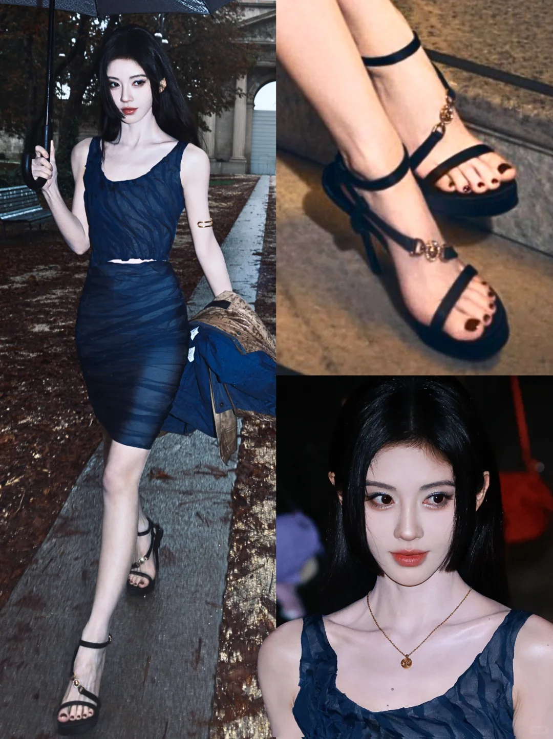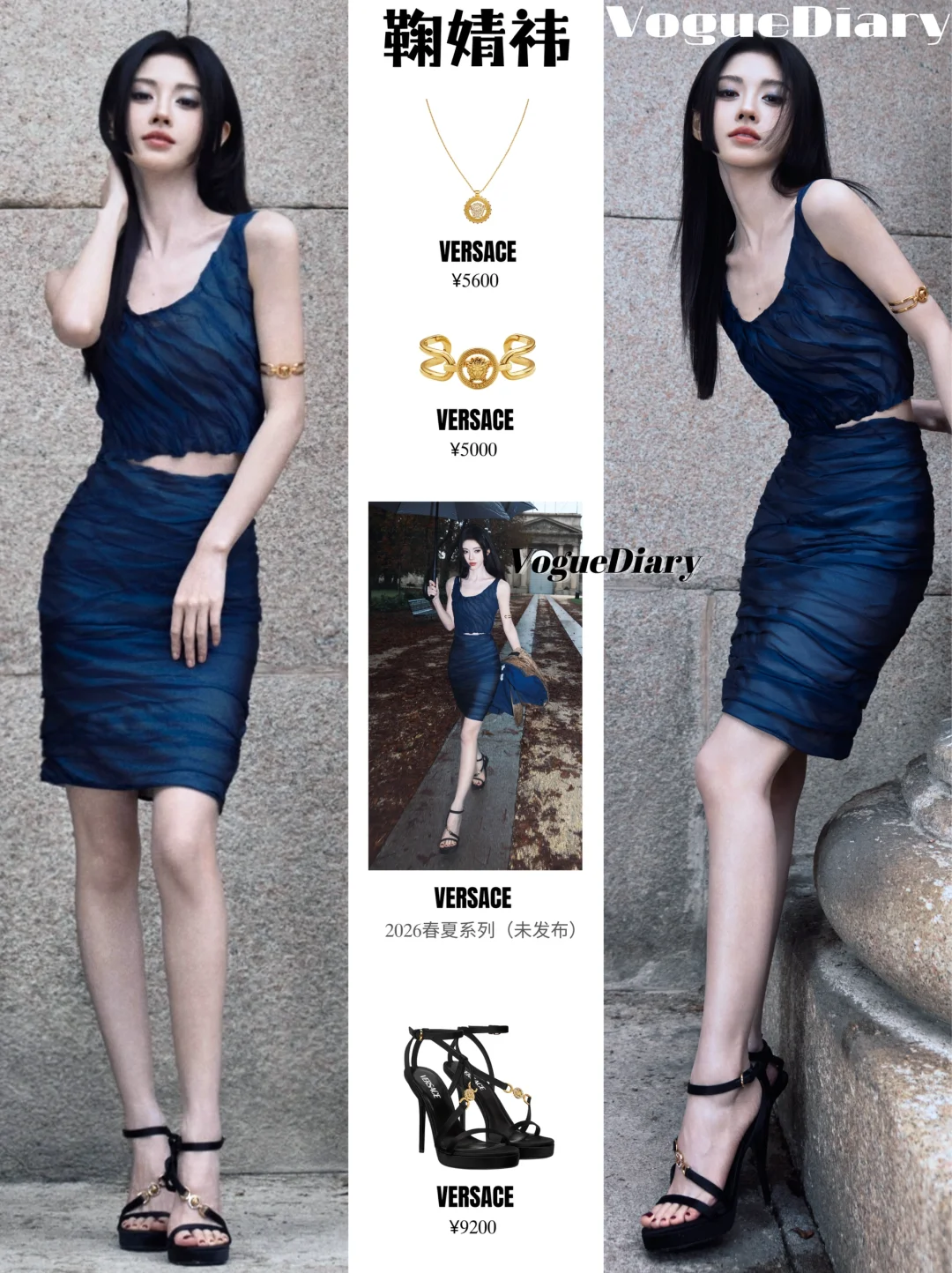 鞠婧祎亮相米兰时装周🔥\n身穿Versace未发布2026春夏系列深蓝薄纱褶皱裙气场全开~\n黑长直发深邃感十足,侧颜杀瞬间刷爆外网!\n走路带风slay全场,这才是东方美人正确打开方式叭🥰~\ncr:网络\n \n▶️Look解析\nAll in VERSACE\n \n#明星同款\n#明星穿搭\n#女明星同款\n#米兰时装周\n#RED明星热力风向标\n#鞠婧祎\n#鞠婧祎同款\n#玉足\n#美脚\n#RED明星热力风向标
