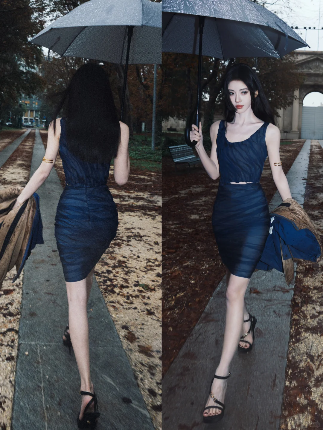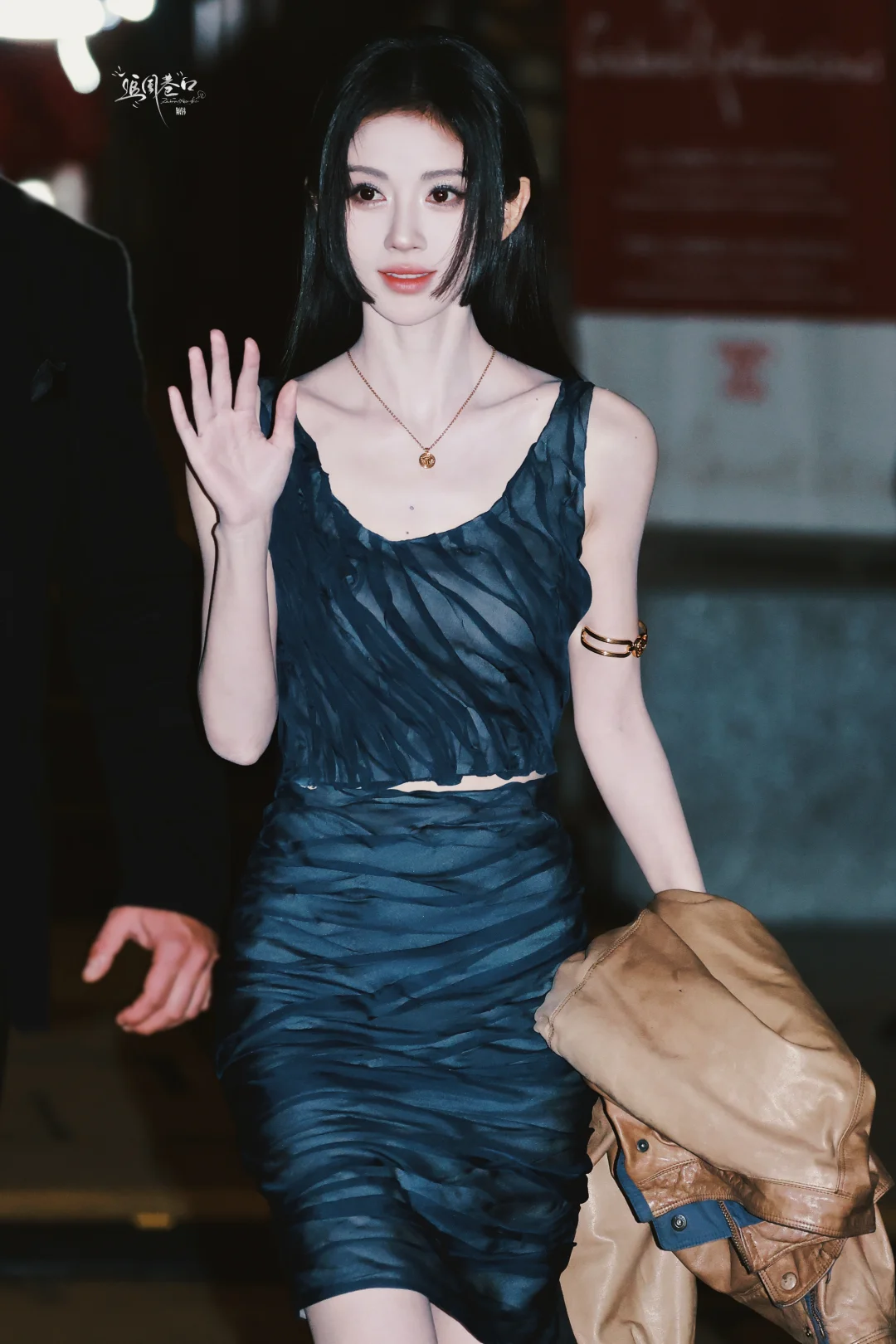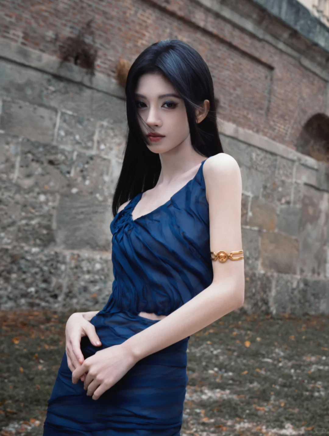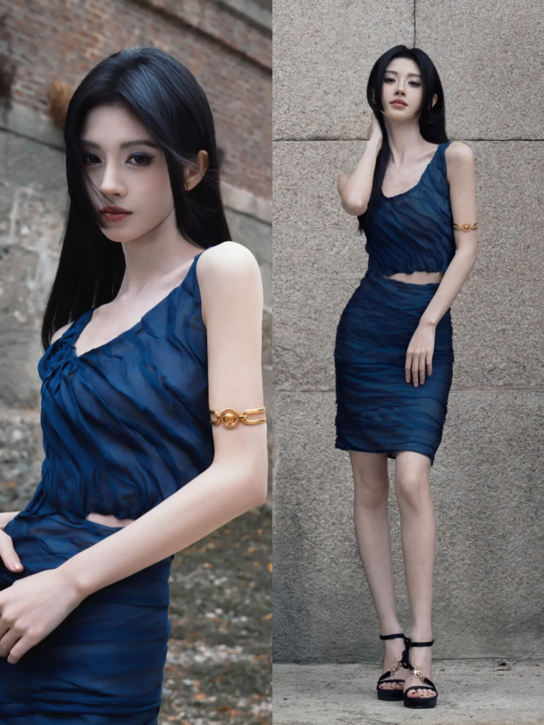 鞠婧祎亮相米兰时装周🔥\n身穿Versace未发布2026春夏系列深蓝薄纱褶皱裙气场全开~\n黑长直发深邃感十足,侧颜杀瞬间刷爆外网!\n走路带风slay全场,这才是东方美人正确打开方式叭🥰~\ncr:网络\n \n▶️Look解析\nAll in VERSACE\n \n#明星同款\n#明星穿搭\n#女明星同款\n#米兰时装周\n#RED明星热力风向标\n#鞠婧祎\n#鞠婧祎同款\n#玉足\n#美脚\n#RED明星热力风向标
