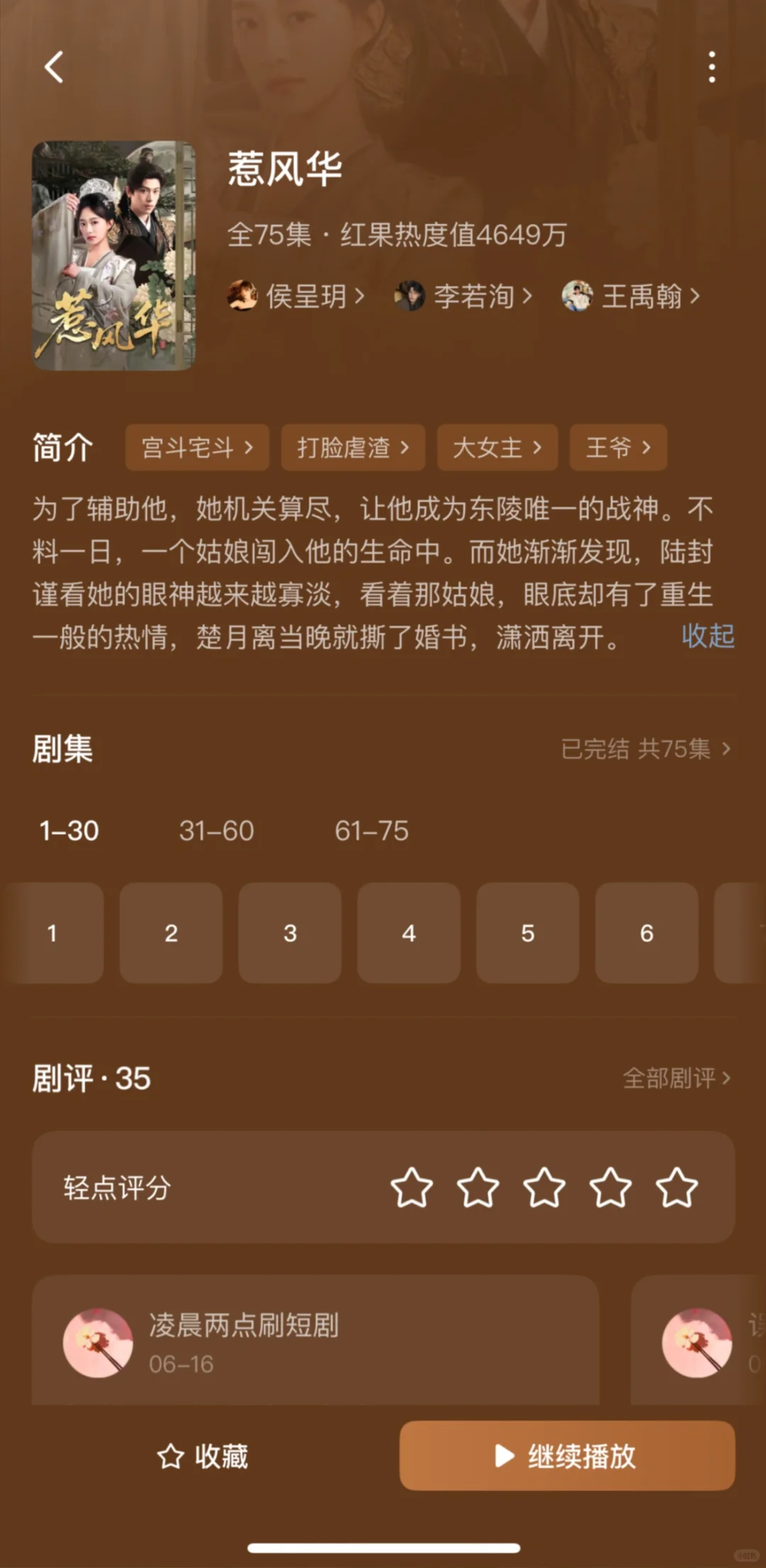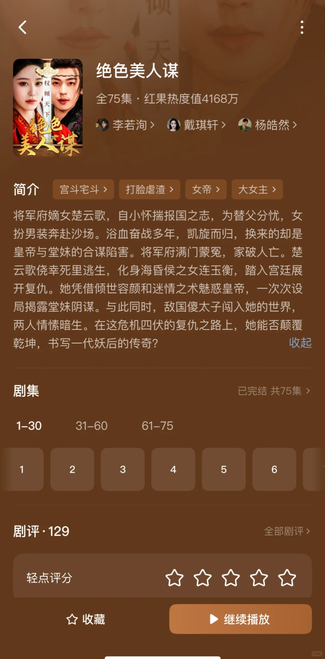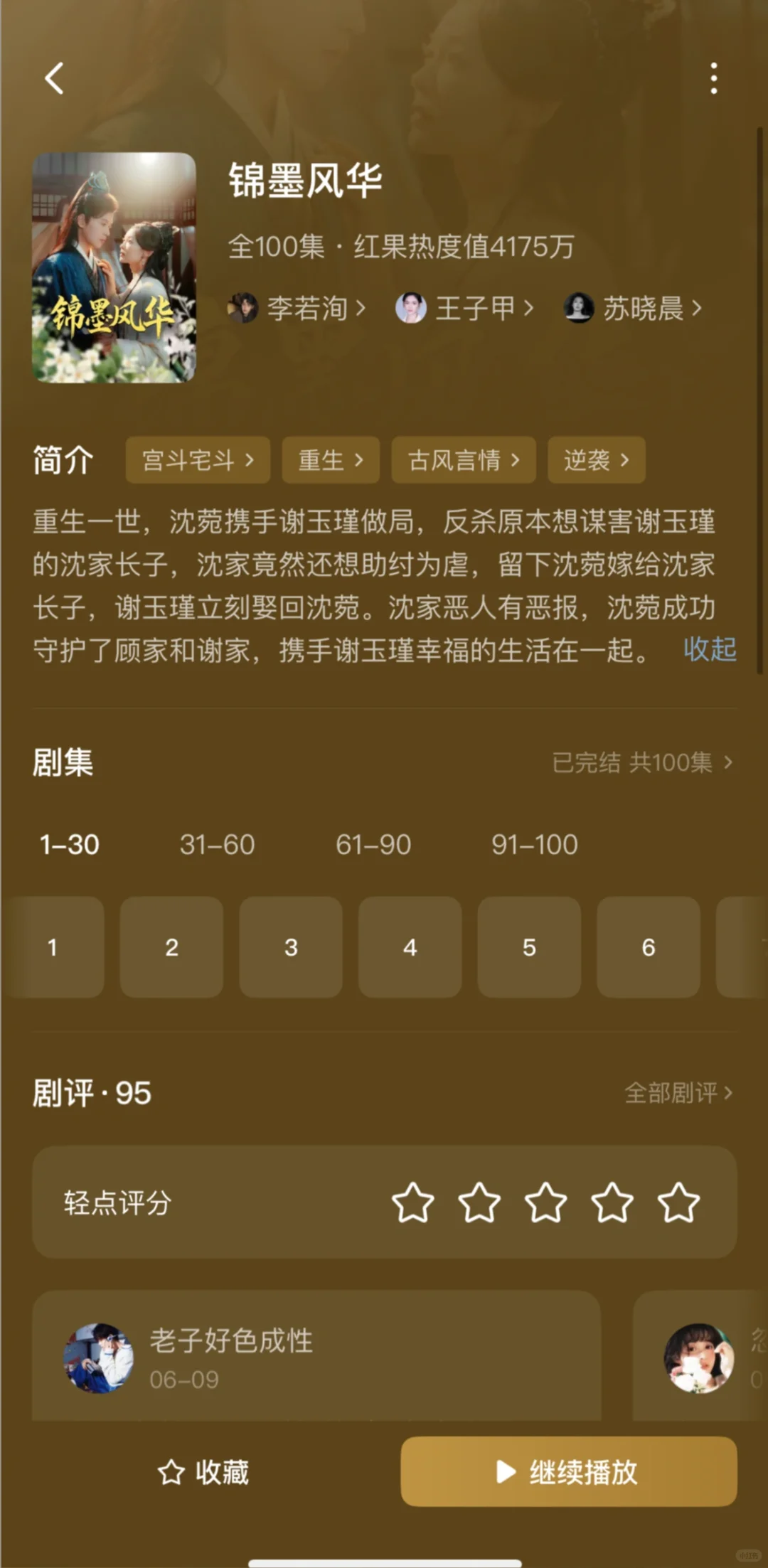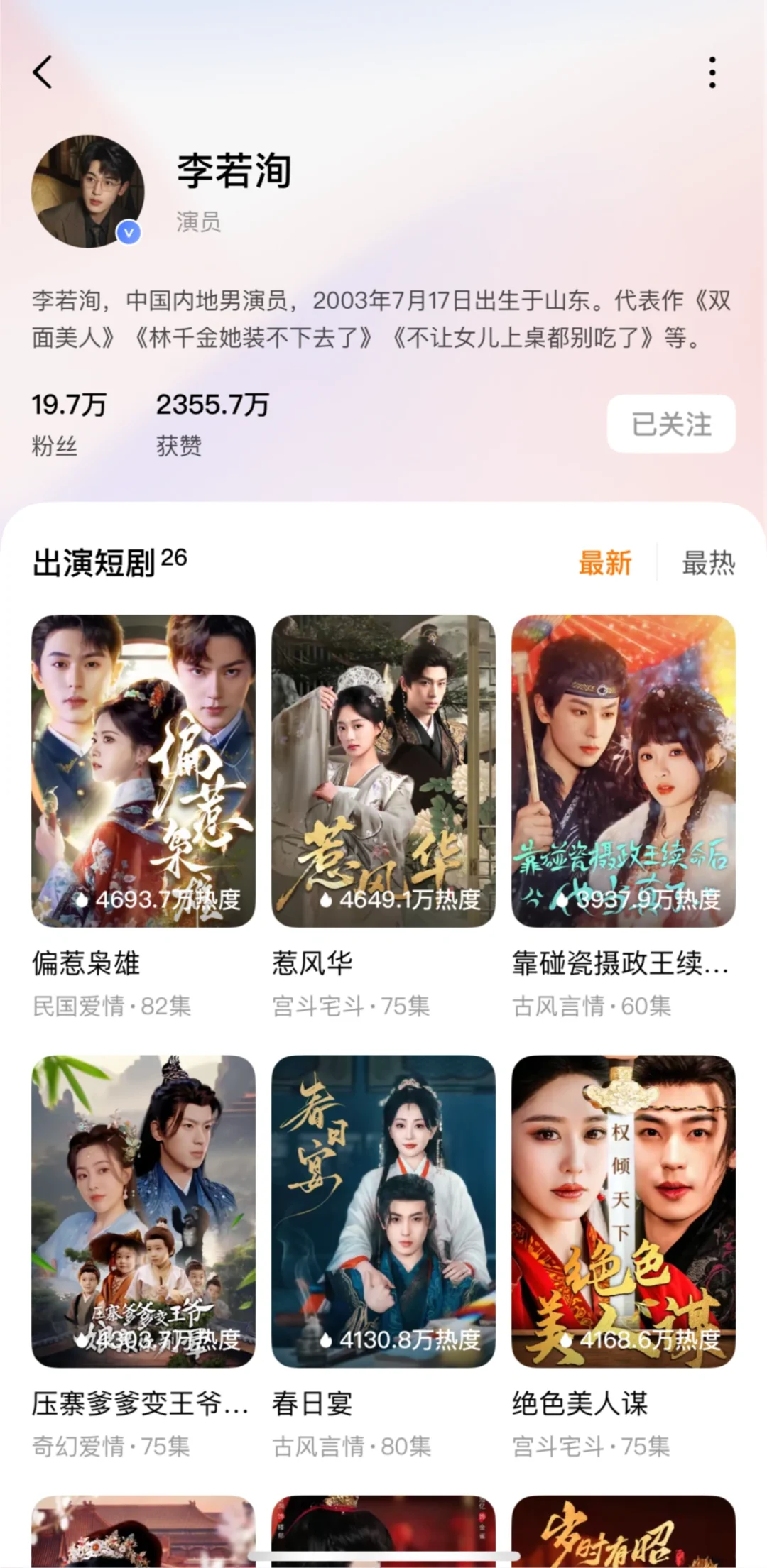 1️⃣偏惹枭雄\n推荐指数:⭐️⭐️⭐️⭐️⭐️\n这部戏真的很养眼,剧情很精彩,男主男配都是对女主生理性的喜欢,虽然有恶毒女配,但也活不过两集,马上被男主解决,演技都很好。\n2️⃣惹风华\n推荐指数:⭐️⭐️⭐️⭐️⭐️\n不是重生的大女主戏,男主一直暗恋女主,男二冒领男主的救命之恩,让女主对他死心塌地那么多年,女主很清醒实力很强,有个无脑的恶毒女配,全剧唯一的可惜:没有吻戏!\n3️⃣靠碰瓷摄政王续命后他当真了\n推荐指数:⭐️⭐️⭐️⭐️⭐️\n男帅女美,女主靠近男主发现能续命,不断靠近他,男主发现爱上女主也不断保护她,很甜,吻戏女主真的太青涩不会亲。\n4️⃣锦墨风华\n推荐指数:⭐️⭐️⭐️⭐️\n女主有效重生,安排6年,事事为男主考虑,让坏人吃瘪也很爽,感情戏感觉有点少,没有吻戏!\n5️⃣绝色美人谋\n推荐指数:⭐️⭐️⭐️⭐️\n大女主戏,挂件男主,整个戏有一种怪怪的滤镜,但是女主有勇有谋,为家报仇,步步为营,给皇帝下蛊,自己称帝,宫斗天花板,男主是敌国太子,装痴傻,女主是偏爱。\n6️⃣昭华乱\n推荐指数:⭐️⭐️⭐️⭐️⭐️\n这部戏如果冲男主可以不看,全剧最单纯皇帝,挂件男主,女主太强了很有头脑,把后宫皇帝太后全都耍的团团转,心思缜密,步步为营,岳演了好多这种戏。\n7️⃣压寨爹爹变王爷娘亲你别晕\n推荐指数:⭐️⭐️⭐️⭐️\n脑洞大开的剧本,例如女主穿越变200斤把男主当青楼小倌睡了,生了5个娃;女主把男主当压寨夫君一夜暴瘦;男主想要把孩子带走,一次只发现一个孩子,到最后才知道有5个娃,轻喜剧,无吻戏。\n8️⃣春日宴\n推荐指数:⭐️⭐️⭐️⭐️⭐️\n女主重生,两个小苦瓜走到了一起,没啥特狗血剧情,虽然结局美好但是遗憾,真正的坏人皇帝和太后没有得到报应,男主就应该反了,有吻戏。\n9️⃣今日离港有雪\n推荐指数:⭐️⭐️⭐️⭐️\n这部戏前几集有点狗血难看,但是第九集两人就睡一起了,男主一直都是坚定的选择女主,中间男主在背后和女主表白女主睡着了,还以为女主同意了实在有点搞笑。男主很有实力,女主也很努力上进,总体还是好看的\n🔟岁时有昭\n推荐指数:⭐️⭐️⭐️\n冲着男主的脸看下去的,其实剧情还行,女主重生,剧情不拖泥带水,集数也比较少,男女主相互信任,就是女主男配啥的长得不好看\n#实现短剧自由 #短剧 #短剧热播 #短剧推荐 #李若洵