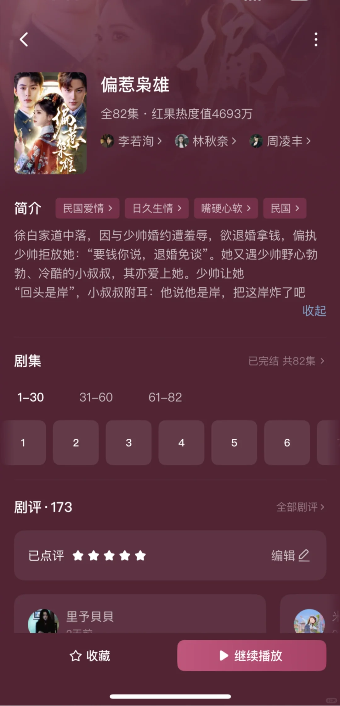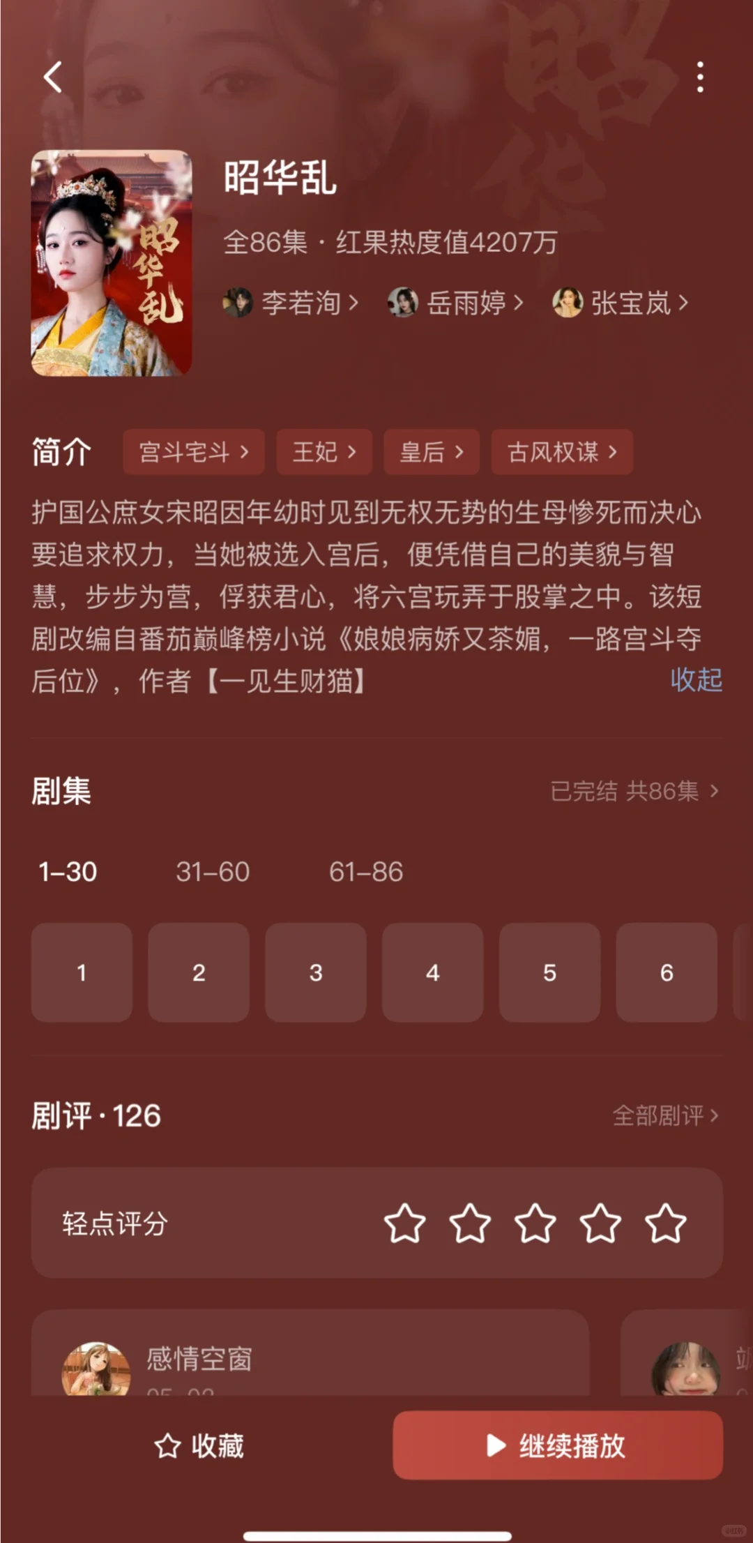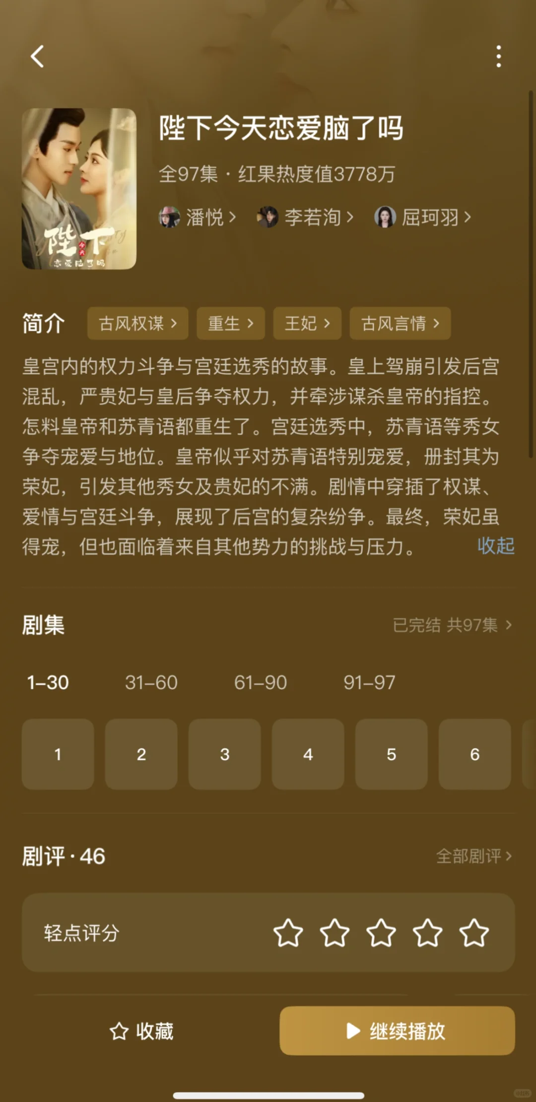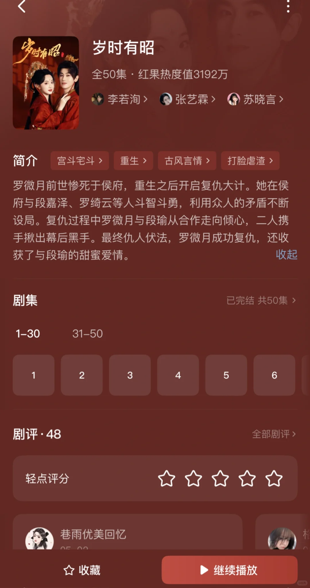 1️⃣偏惹枭雄\n推荐指数:⭐️⭐️⭐️⭐️⭐️\n这部戏真的很养眼,剧情很精彩,男主男配都是对女主生理性的喜欢,虽然有恶毒女配,但也活不过两集,马上被男主解决,演技都很好。\n2️⃣惹风华\n推荐指数:⭐️⭐️⭐️⭐️⭐️\n不是重生的大女主戏,男主一直暗恋女主,男二冒领男主的救命之恩,让女主对他死心塌地那么多年,女主很清醒实力很强,有个无脑的恶毒女配,全剧唯一的可惜:没有吻戏!\n3️⃣靠碰瓷摄政王续命后他当真了\n推荐指数:⭐️⭐️⭐️⭐️⭐️\n男帅女美,女主靠近男主发现能续命,不断靠近他,男主发现爱上女主也不断保护她,很甜,吻戏女主真的太青涩不会亲。\n4️⃣锦墨风华\n推荐指数:⭐️⭐️⭐️⭐️\n女主有效重生,安排6年,事事为男主考虑,让坏人吃瘪也很爽,感情戏感觉有点少,没有吻戏!\n5️⃣绝色美人谋\n推荐指数:⭐️⭐️⭐️⭐️\n大女主戏,挂件男主,整个戏有一种怪怪的滤镜,但是女主有勇有谋,为家报仇,步步为营,给皇帝下蛊,自己称帝,宫斗天花板,男主是敌国太子,装痴傻,女主是偏爱。\n6️⃣昭华乱\n推荐指数:⭐️⭐️⭐️⭐️⭐️\n这部戏如果冲男主可以不看,全剧最单纯皇帝,挂件男主,女主太强了很有头脑,把后宫皇帝太后全都耍的团团转,心思缜密,步步为营,岳演了好多这种戏。\n7️⃣压寨爹爹变王爷娘亲你别晕\n推荐指数:⭐️⭐️⭐️⭐️\n脑洞大开的剧本,例如女主穿越变200斤把男主当青楼小倌睡了,生了5个娃;女主把男主当压寨夫君一夜暴瘦;男主想要把孩子带走,一次只发现一个孩子,到最后才知道有5个娃,轻喜剧,无吻戏。\n8️⃣春日宴\n推荐指数:⭐️⭐️⭐️⭐️⭐️\n女主重生,两个小苦瓜走到了一起,没啥特狗血剧情,虽然结局美好但是遗憾,真正的坏人皇帝和太后没有得到报应,男主就应该反了,有吻戏。\n9️⃣今日离港有雪\n推荐指数:⭐️⭐️⭐️⭐️\n这部戏前几集有点狗血难看,但是第九集两人就睡一起了,男主一直都是坚定的选择女主,中间男主在背后和女主表白女主睡着了,还以为女主同意了实在有点搞笑。男主很有实力,女主也很努力上进,总体还是好看的\n🔟岁时有昭\n推荐指数:⭐️⭐️⭐️\n冲着男主的脸看下去的,其实剧情还行,女主重生,剧情不拖泥带水,集数也比较少,男女主相互信任,就是女主男配啥的长得不好看\n#实现短剧自由 #短剧 #短剧热播 #短剧推荐 #李若洵