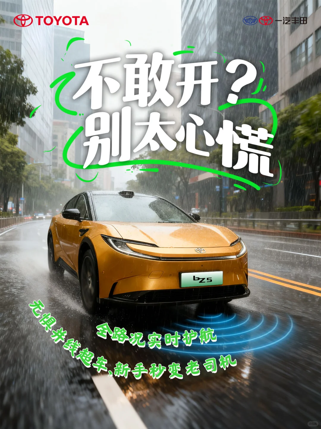 要惊艳街景,只为看清每一处可能。\n高清影像与预判,让“鬼探头”无处遁形;\n灯光与算法,把模糊留给夜色。\n安全,是她的底色;\n从容,是她的速度。\n \n————————————\n关注@一汽丰田新能源\n更多产品信息赶来中\n#一汽丰田bZ元气伙伴 #bZ5 #合资算力新高度bZ5到店体验 #bZ5到底是台啥车 #5限安全方程试 #GIVEME5 #一汽丰田bZ5 #合资纯电天花板 #安全兜底新高度开bZ5更安心 #15万级激光雷达安全标杆