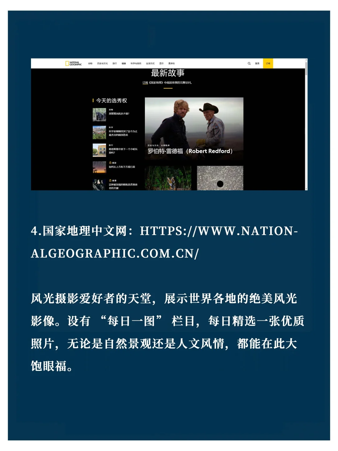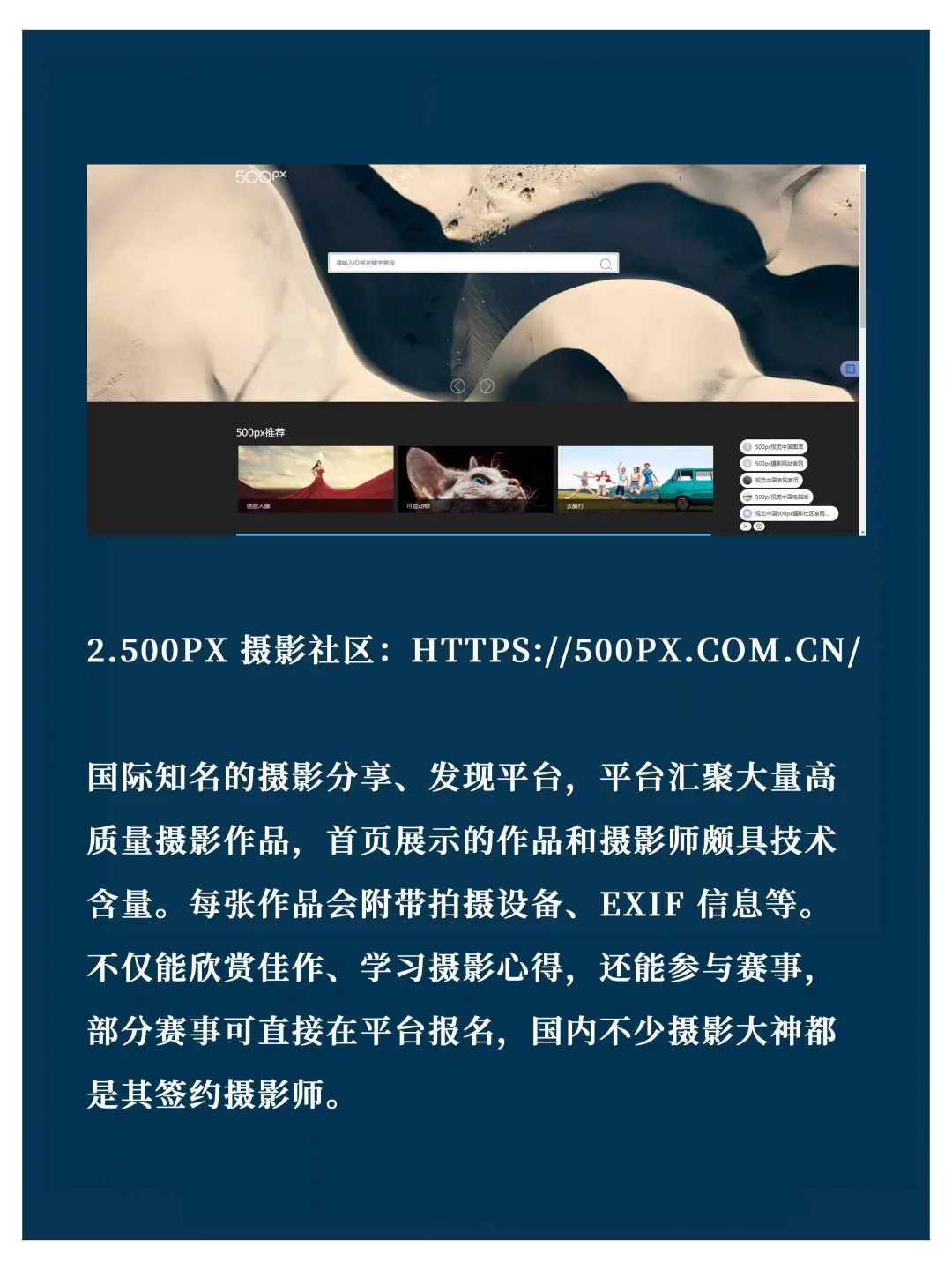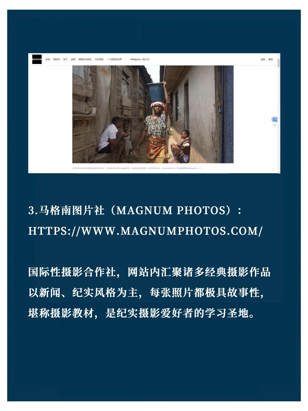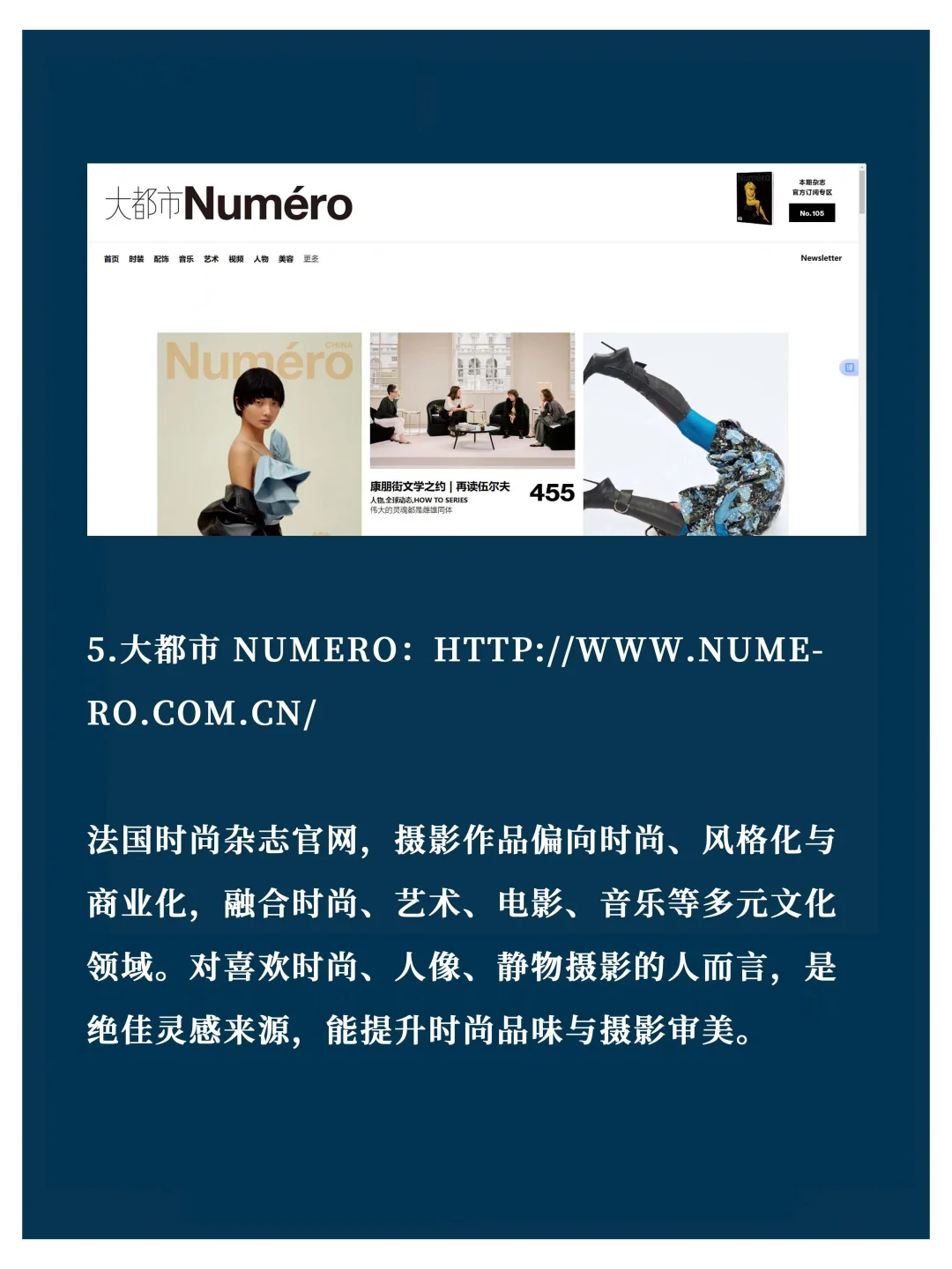 1️⃣CNU 视觉联盟:http://www.cnu.cc/\n国内一个极具风格的视觉艺术分享平台,每日都会推送优质摄影作品,涵盖人像、风光、时尚等。汇聚国内外众多摄影师佳作,还有不少精品胶片照片,适合各类型摄影爱好者。\n \n2️⃣500px 摄影社区:https://500px.com.cn/\n国际知名的摄影分享、发现平台,平台汇聚大量高质量摄影作品,首页展示的作品和摄影师颇具技术含量。每张作品会附带拍摄设备、EXIF 信息等。不仅能欣赏佳作、学习摄影心得,还能参与赛事,部分赛事可直接在平台报名,国内不少摄影大神都是其签约摄影师。\n \n3️⃣马格南图片社(Magnum Photos):https://www.magnumphotos.com/\n国际性摄影合作社,网站内汇聚诸多经典摄影作品,以新闻、纪实风格为主,每张照片都极具故事性,堪称摄影教材,是纪实摄影爱好者的学习圣地。\n \n4️⃣国家地理中文网:https://www.nationalgeographic.com.cn/\n风光摄影爱好者的天堂,展示世界各地的绝美风光影像。设有 “每日一图” 栏目,每日精选一张优质照片,无论是自然景观还是人文风情,都能在此大饱眼福。\n \n5️⃣大都市 Numero:http://www.numero.com.cn/\n法国时尚杂志官网,摄影作品偏向时尚、风格化与商业化,融合时尚、艺术、电影、音乐等多元文化领域。对喜欢时尚、人像、静物摄影的人而言,是绝佳灵感来源,能提升时尚品味与摄影审美。\n#摄影网站推荐 #审美提升 #摄影干货 #摄影入门 #摄影基础知识 #学习网站 #摄影与摄像艺术 #新手小白摄影