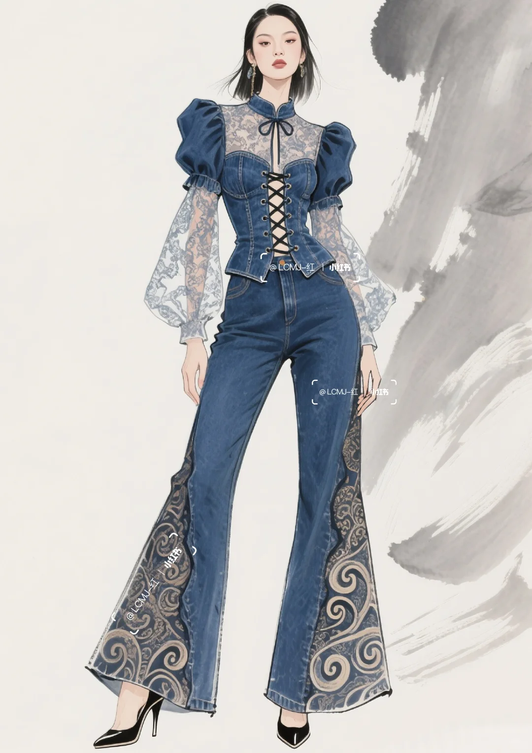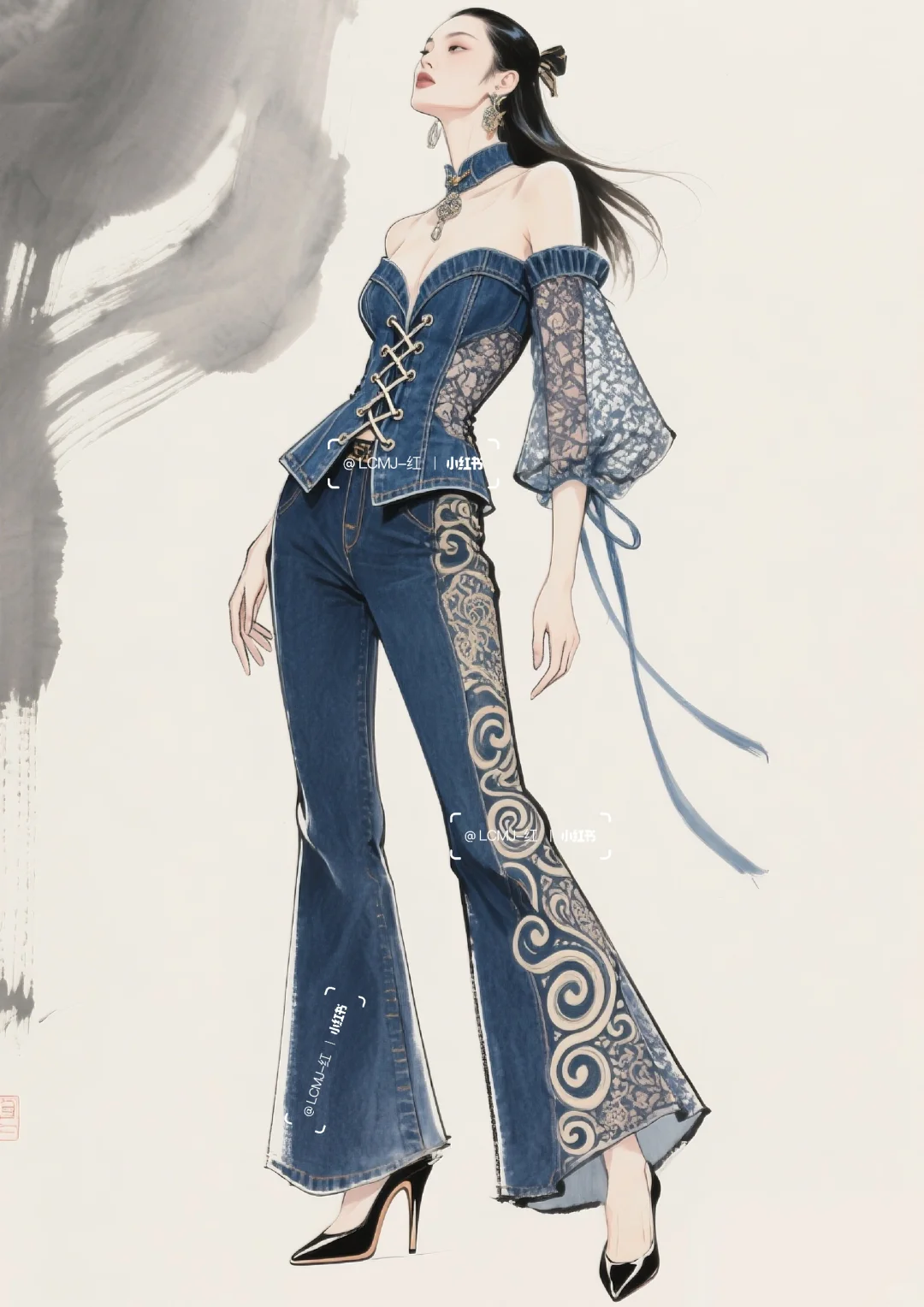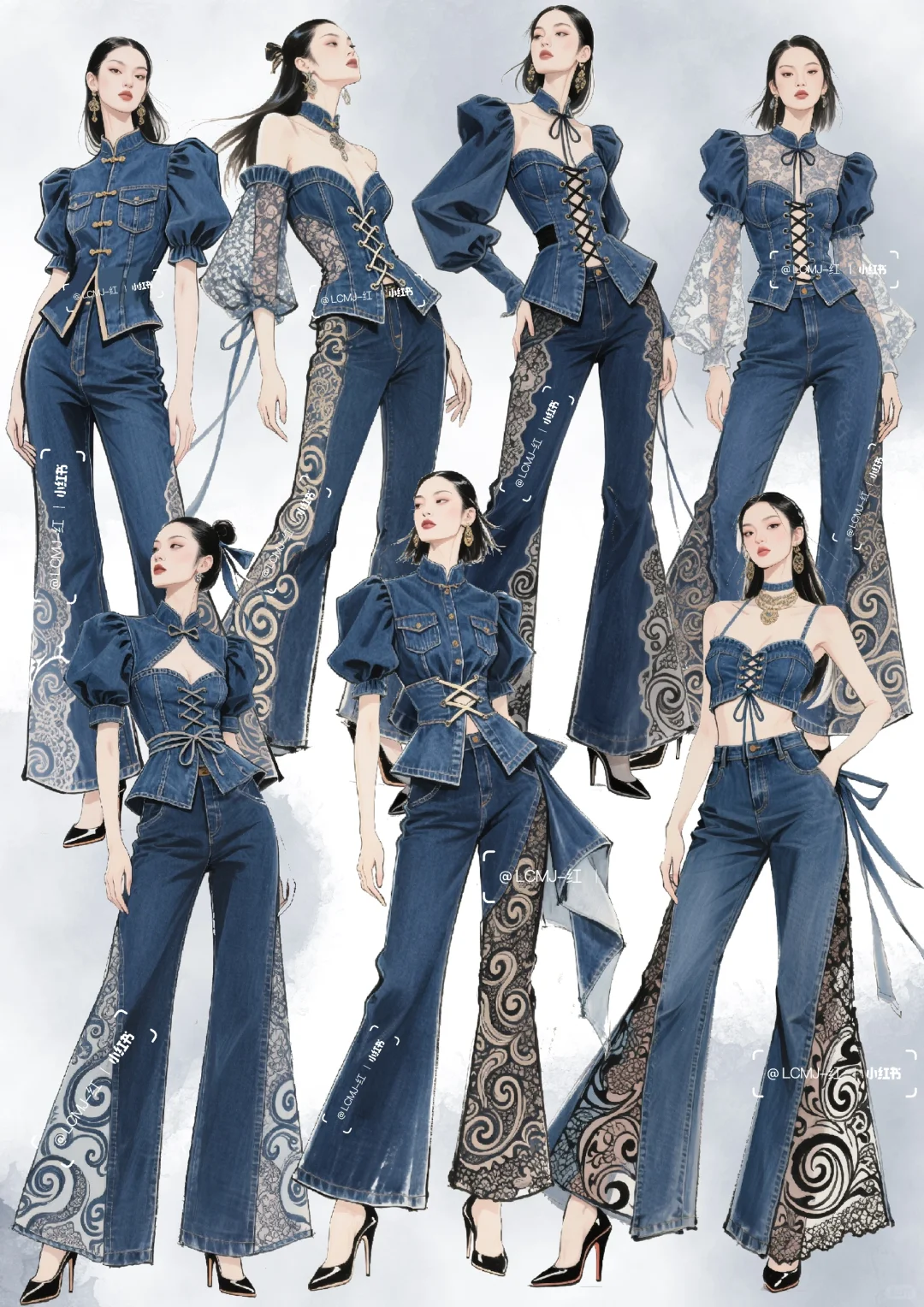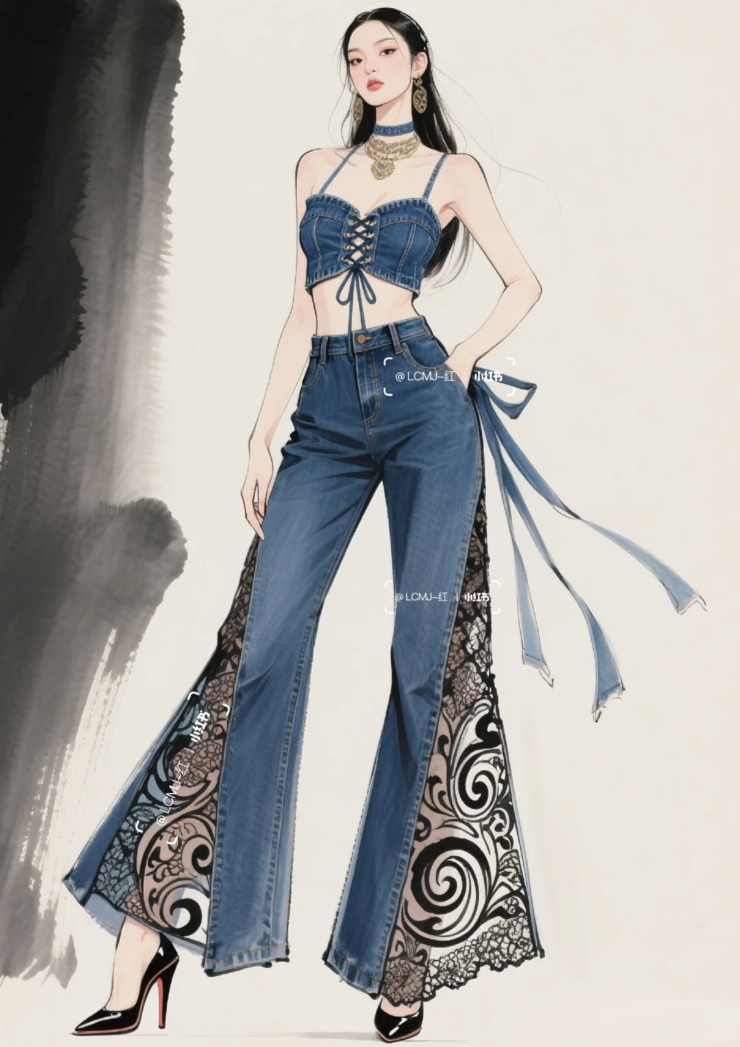 以 “打破边界,融合共生” 为核心设计理念,\n \n将丹宁的粗犷不羁与蕾丝的细腻进行创新碰撞,\n \n形成 “硬”与“软”、“刚”与“柔” 的视觉与触觉反差。\n \n整体风格既延续了丹宁的休闲不羁,\n \n又通过蕾丝升华出优雅风情,\n \n既可搭配高跟鞋出席派对,展现摩登气场;\n \n也可搭配休闲鞋漫步街头,演绎随性自在。\n \n让穿着者在优雅与不羁间自由切换,\n \n释放独特的时尚态度。\n \n#服装设计 #服装设计效果图 #丹宁 #古典与时尚的结合 #蕾丝 #个性魅力展现 #时尚新境界 #复古新风尚 #时尚与古典的碰撞 #复古与时尚的碰撞 #时尚与复古 #传统与时尚先锋的融合 #时尚与传统 #复古/宫廷 #牛仔裤改造 #牛仔裙 #古典与时尚 #牛仔 #牛仔裤 #牛仔裤女 #牛仔套装#牛仔穿搭 #街头风 #街头穿搭 #酷飒穿搭 #酷飒风 #酷帅风 #酷帅穿搭 #酷帅女孩 #个性 #个性穿搭 #时装设计 #女装设计