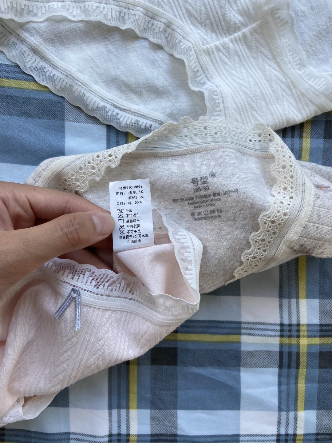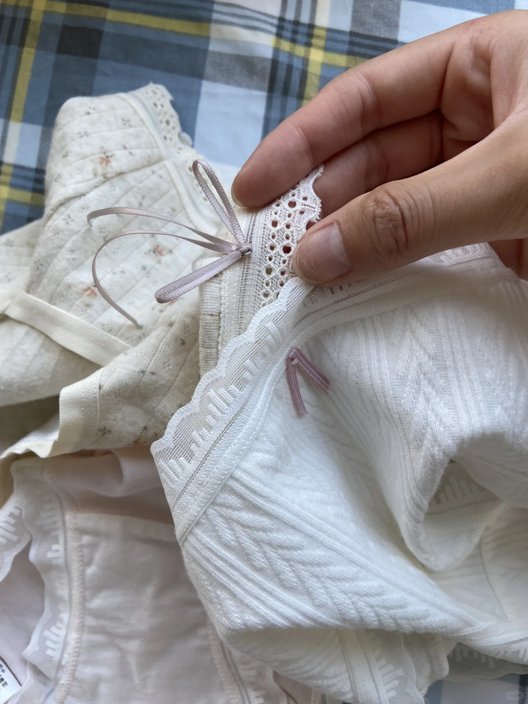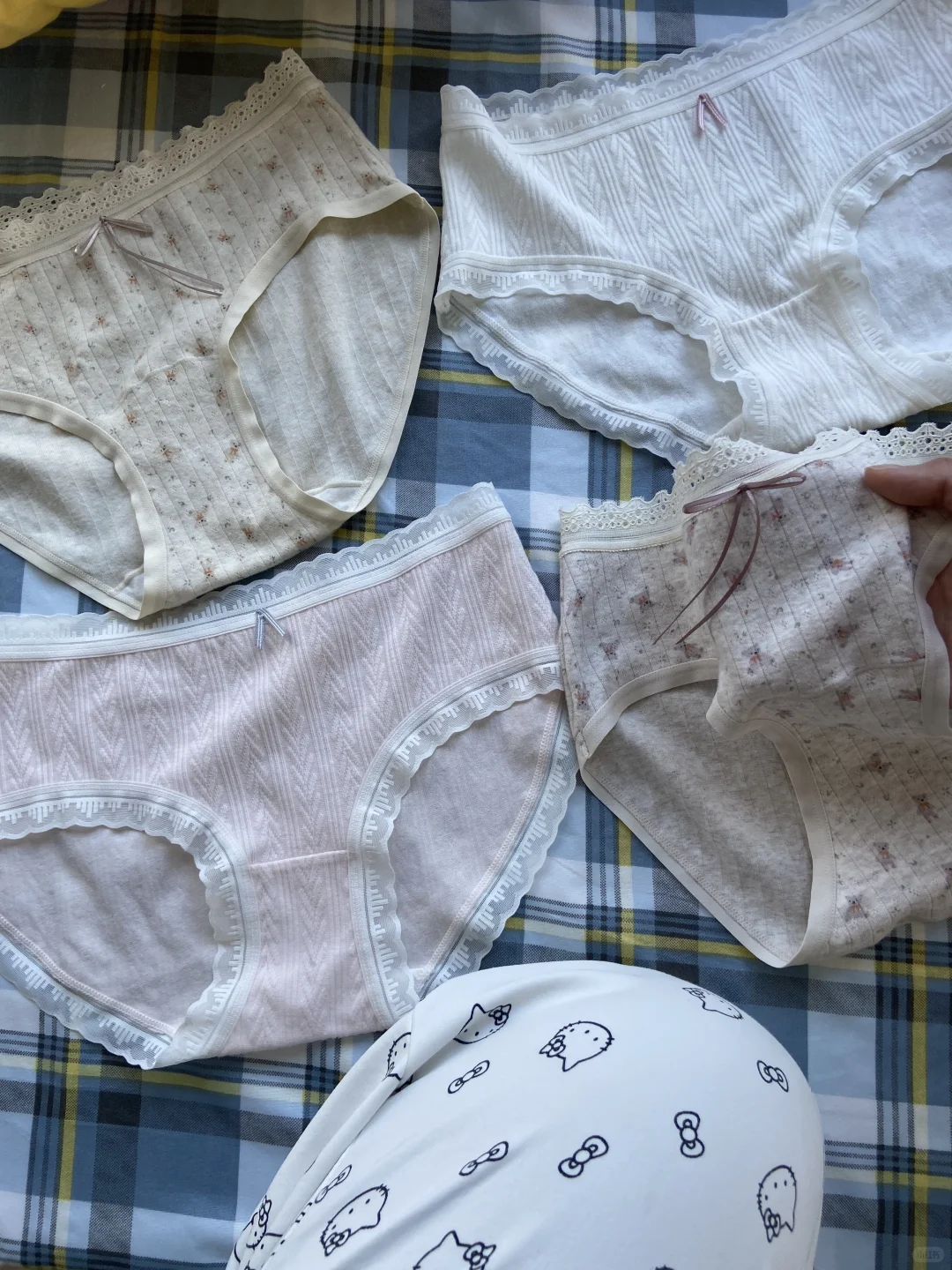 我印象中蕾丝内裤还是硬硬扎扎的那种,现在都变成这种软蕾丝边了,比较贴合皮肤,料子也绵绵软软的,很安心的那种棉质感,我比较喜欢碎花那两条,感觉有点田园风,挺好看的[亲一个R]\n#内裤 #内裤推荐 #内裤分享 #内裤女 #内裤推荐女 #舒适内裤 #纯棉内裤 #蕾丝内裤 #少女内裤