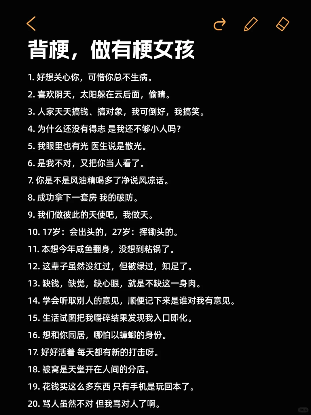 1.好想关心你,可惜你总不生病。\n2.喜欢阴天,太阳躲在云后面,偷晴。\n3.人家天天搞钱、搞对象,我可倒好,我搞笑。\n4.为什么还没有得志 是我还不够小人吗?\n5.我眼里也有光 医生说是散光。\n6.是我不对,又把你当人看了。\n7.你是不是风油精喝多了净说风凉话。\n8.成功拿下一套房 我的破防。\n9.我们做彼此的天使吧,我做天。\n10.17岁:会出头的,27岁:挥锄头的。\n11.本想今年咸鱼翻身,没想到粘锅了。\n12.这辈子虽然没红过,但被绿过,知足了。\n13.缺钱,缺觉,缺心眼,就是不缺这一身肉。\n14.学会听取别人的意见,顺便记下来是谁对我有意见。\n15.生活试图把我嚼碎结果发现我入口即化。\n16.想和你同居,哪怕以蟑螂的身份。\n17.好好活着 每天都有新的打击呀。\n18.被窝是天堂开在人间的分店。\n19.花钱买这么多东西 只有手机是玩回本了。\n20.骂人虽然不对 但我骂对人了啊。\n21.分享欲犯了收款码给你们。\n22.感觉人际关系比尸·体难处理。\n23.早点睡吧 别把身体玩坏了 我还要玩呢。\n24.今天也是痛苦满满的一天啊。\n25.你长的好像一个游戏 我的世界。\n26.好女人志在远方 心中有苦不声张。\n27.希望你的底色一直是善良和勇敢。\n28.年轻的时候真的很穷混了几年终于不再年轻了。\n29.整天和手机腻在一起 这像话吗。\n30.几块钱的香许几千万的愿。\n31.最近好吗 锅里的和碗里的都还好吧。\n32.情绪发挥得很稳定 每天都是烦死了。\n33.建议以后取消十二生肖,大家都属驴。\n34.我01年出生的 属吗喽。\n35.偷情吗 你偷偷替我上学我记这份恩情。\n36.都铁了心幸福姐铁了心孤单。\n37.很外向上班想坐老板位置。\n38.喜欢黑丝就不要招惹我们钢丝。\n39.世界上最容易坏的东西就是姐的心情。\n40.我无法客观评价他 因为我主观喜欢他。\n41.我上班不就图个下班吗 不然我图什么。\n42.我以前也热爱生活后来上班调理好了。\n43.夜深了聊点成年人的话题 明天你几点上班。\n44.上班发点疯很正常,情绪稳定是另外的价钱。\n#一起来玩梗 #抽象文案 #高情商聊天术 #有趣的灵魂 #网络热词 #运营人的精神状态 #有梗 #聊天技巧