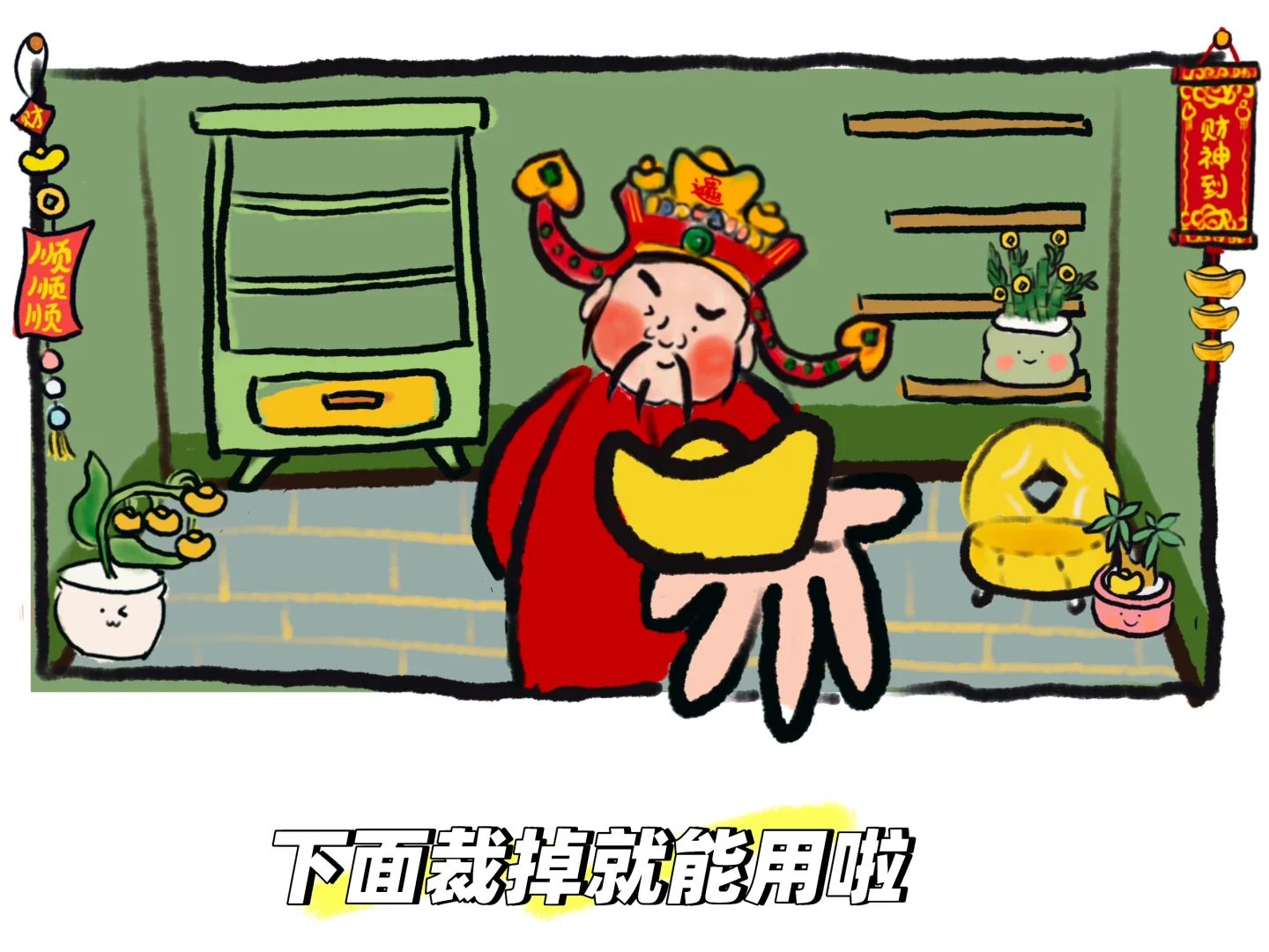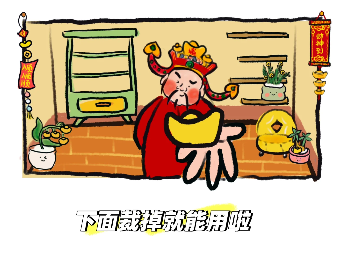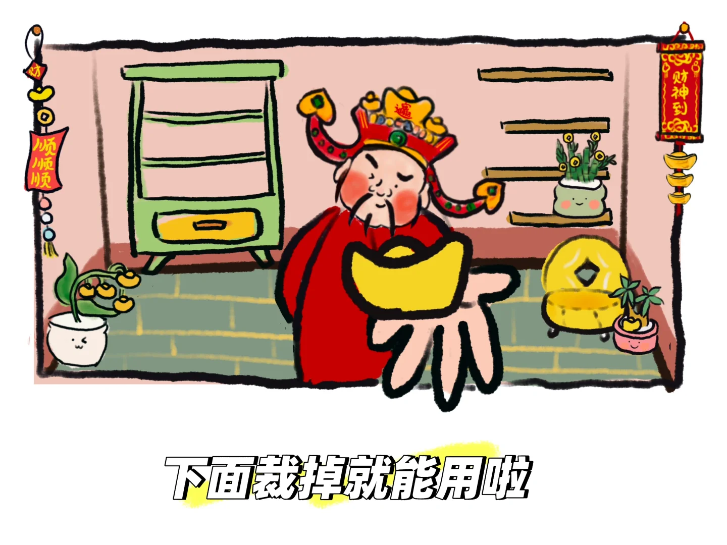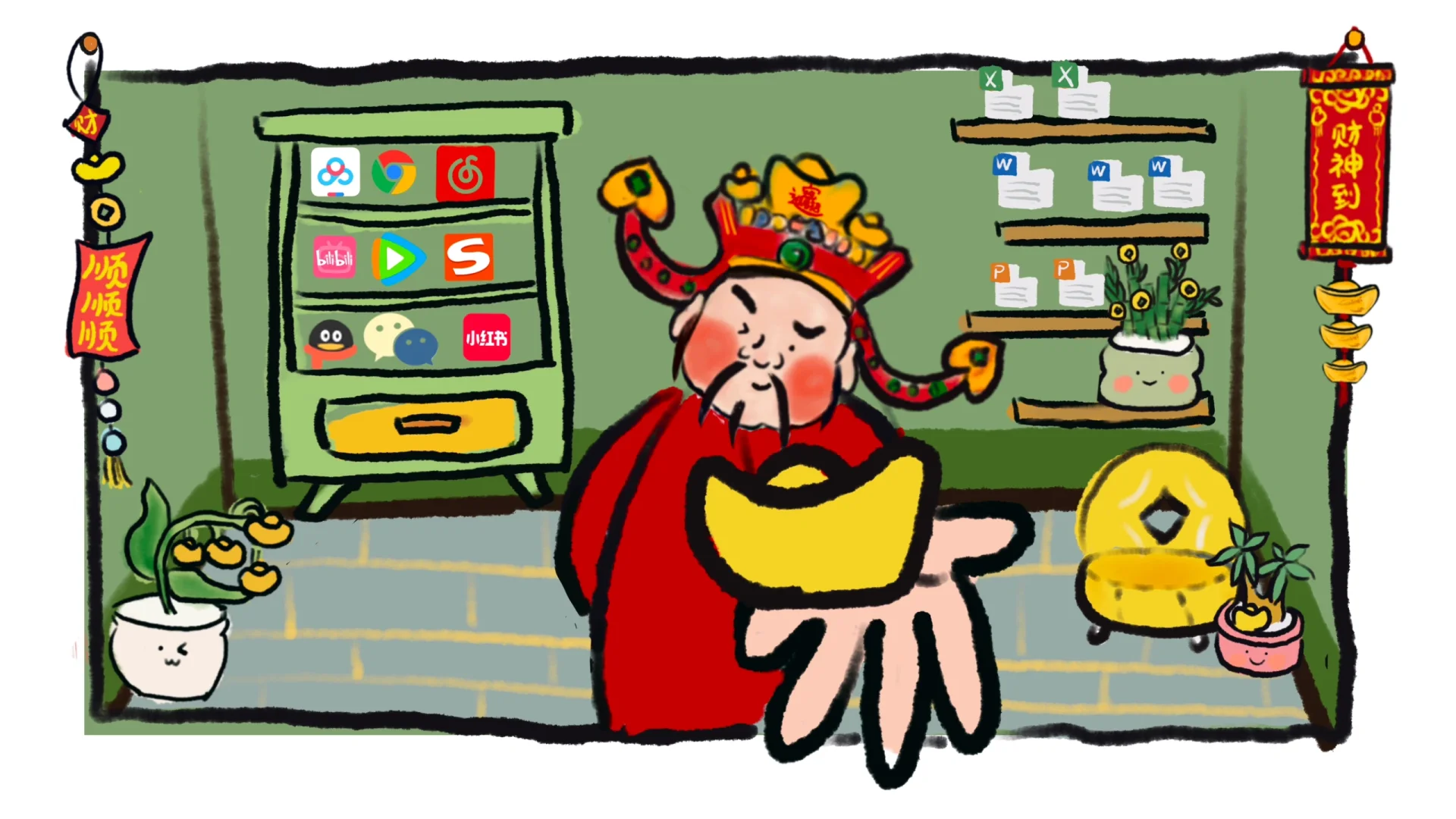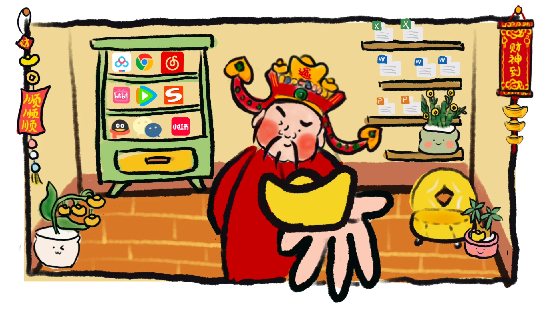 文件软件统统放在架子上\n还有这伸出屏幕的财神之手根本拒绝不了呀