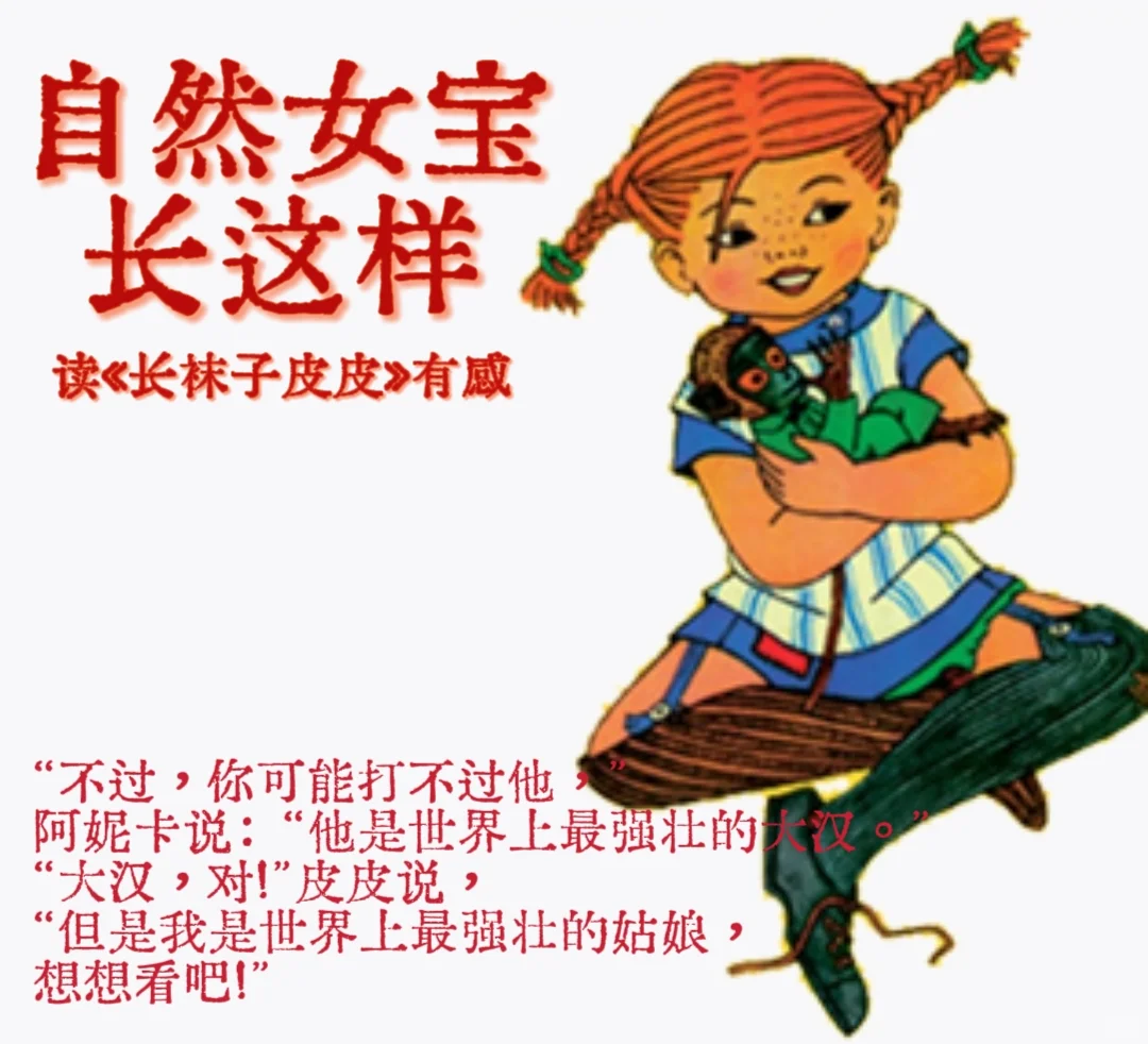 你好,这里是耀山。\n \n今天突然想看儿童文学,想看一些不循规蹈矩的快乐小孩儿的故事,然后我想到了长袜子皮皮。\n \n刚看开头我就知道皮皮无论对于小孩子还是大人(比如我)都毫无疑问是偶像,正如序言里所说:她一个人住在一栋小房子里,生活完全自理,富得像一位财神,壮得像一匹马。(可见P2插图)\n \n长袜子皮皮是个九岁的小女孩,她一头红发,不仅天生力气超群,也有着过人的头脑。这样的力量和智慧让她可以在任何情况下保护自己和其他人。当陌生的小男孩被其他五个小男孩打到地上时,她轻而易举地把坏小孩们都丢到树上、门柱上、花坛里,然后事了拂衣去,深藏功与名;家里进了小偷,她自然不慌不忙,甚至和小偷们愉快地跳起了舞;更不用说她随随便便就打倒了马戏团的大力士,赢得了满堂喝彩后又像个真正的小孩子一样沉沉睡了过去。\n \n皮皮自由自在,不受任何成人约束,却有着自己独特规律的生活方式。皮皮生活的第一天就吸引了隔壁循规蹈矩的小孩阿妮卡和杜米,她们和她相处的第一天就被皮皮吸引住了,皮皮会创造各种你想得到和想不到的玩法,她强大的动手能力和执行力又将同伴们共同规划的梦想旅行都变成现实,又悄悄提前在信箱里留下一张让妈妈爸爸放心的字条。她一个人睡觉的晚上也会给自己编故事听。家人留给皮皮的一袋子金币几乎足够把整个小镇买下来,她愿意换成糖果和玩具与所有镇上的小孩分享。皮皮是一个物质和精神都足够丰盛的人。\n \n读这本书时会觉得一直很有希望,好像什么事情都能妥善解决,好像又回到了小时候相信自己可以成为任何想成为的人,可能是探险家、海盗或者捡破烂的(我愿称之为淘金者)。感谢阿斯特丽德·林格伦女士为孩子们创造这样一个自由自在的小孩,她身强力壮、聪明伶俐、有着无穷无尽的创造力和生命力,任何人都无法规训她。有这么一个小女孩作为童年的偶像和榜样,小孩子会知道自己可以实现任何梦想。\n \n书中的皮皮不愿意长大,但是我知道她长到90岁还是会像9岁那样拥有一颗蓬勃的心。看到结尾处译者的后记中提到作者87岁的林格伦女士知道他手写翻译,给他寄去了一万克朗让他买台电脑。我想这也许就是现实中长大的皮皮之一。\n \n有一点我认为是时代局限的内容:文中给阿妮卡准备的礼物都是项链、戒指一样的装饰品或者小碟小碗这里似乎预示着家庭主妇的物品,而给杜米(男)准备的是小刀、笔本、水彩笔等展现更多样技能的物品。#夏娃之女 #女性成长 #长袜子皮皮 #女孩子拯救世界
