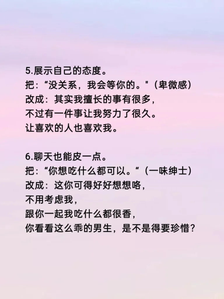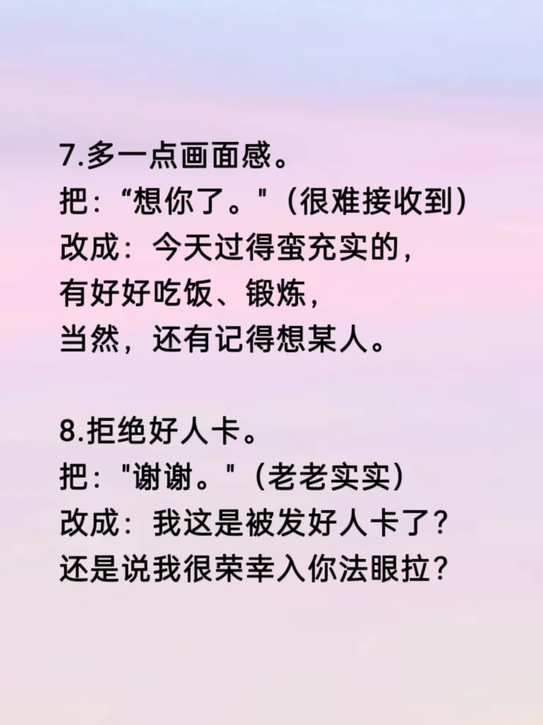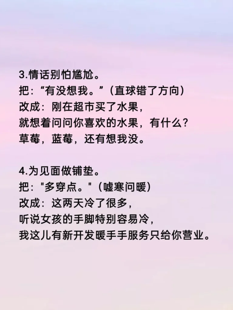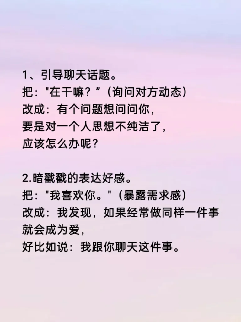 1、引导聊天话题。\n把:\"在干嘛?”(询问对方动态)\n改成:有个问题想问问你,要是对一个人思想不纯洁了,应该怎么办呢?\n \n2.暗戳戳的表达好感。\n把:\"我喜欢你。\"(暴露需求感)\n改成:我发现,如果经常做同样一件事,就会成为爱好比如说:我跟你聊天这件事。\n \n3.情话别怕尴尬。\n把:“有没想我。”(直球错了方向)\n改成:刚在超市买了水果,就想着问问你喜欢的水果,有什么?草莓,蓝莓,还有想我没。\n \n4.为见面做铺垫。\n把:\"多穿点。\"(嘘寒问暖)\n改成:这两天冷了很多,听说女孩的手脚特别容易冷,我这儿有新开发暖手手服务只给你营业。\n \n5.展示自己的态度。\n把:“没关系,我会等你的。\"(卑微感)\n改成:其实我擅长的事有很多,不过有一件事让我努力了很久。让喜欢的人也喜欢我。\n \n6.聊天也能皮一点。\n把:“你想吃什么都可以。“(一味绅士)\n改成:这你可得好好想想咯,不用考虑我,跟你一起我吃什么都很香,你看看这么乖的男生,是不是得要珍惜?\n \n7.多一点画面感。\n把:“想你了。\"(很难接收到)\n改成:今天过得蛮充实的,有好好吃饭、锻炼,当然,还有记得想某人。\n \n8.拒绝好人卡。\n把:\"谢谢。\"(老老实实)\n改成:我这是被发好人卡了?还是说我很荣幸入你法眼拉?\n#女性觉醒 #女性智慧 #情感共鸣 #撩人情话 #让男生偷偷喜欢上你 #高情商话术 #表达爱意 #高情商聊天技巧 #让男生上头 #聊天话题