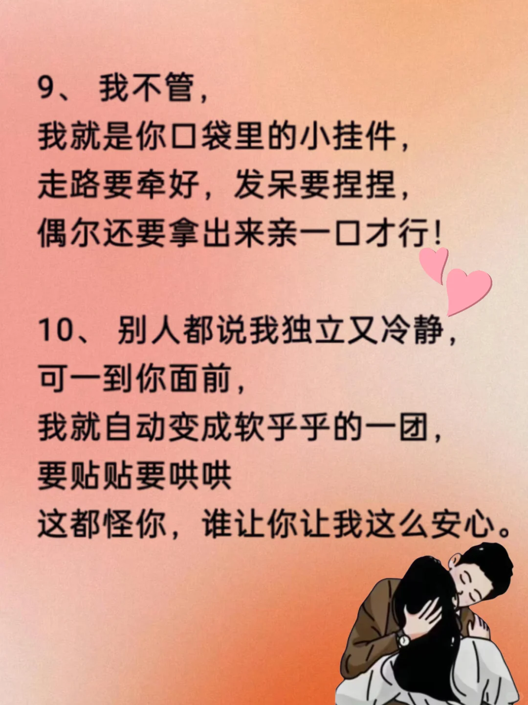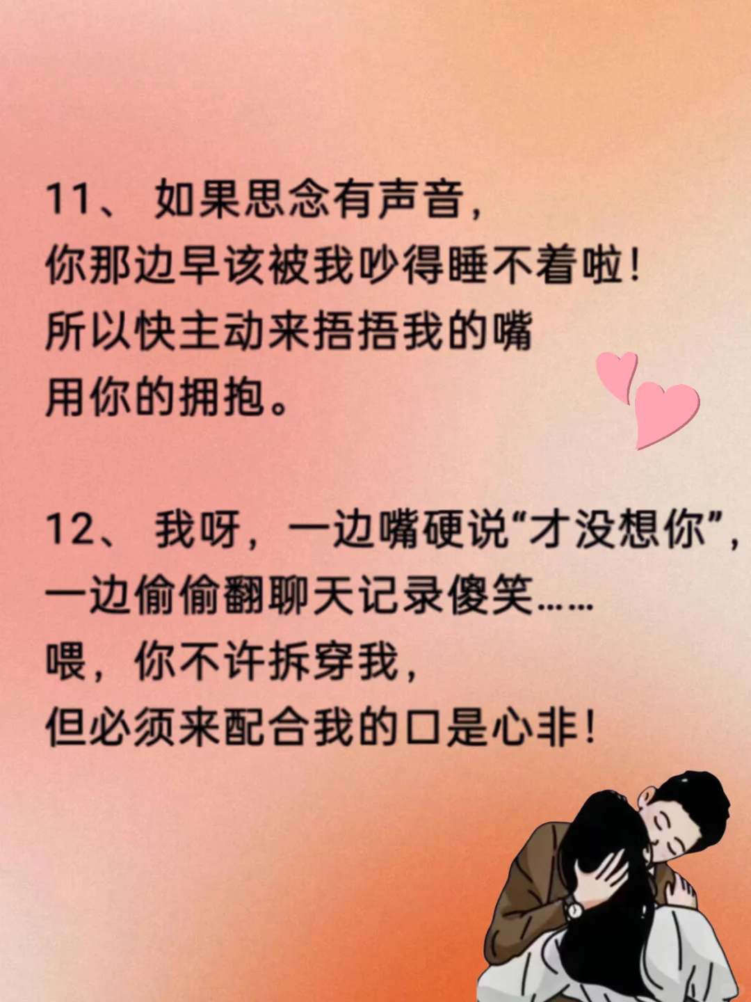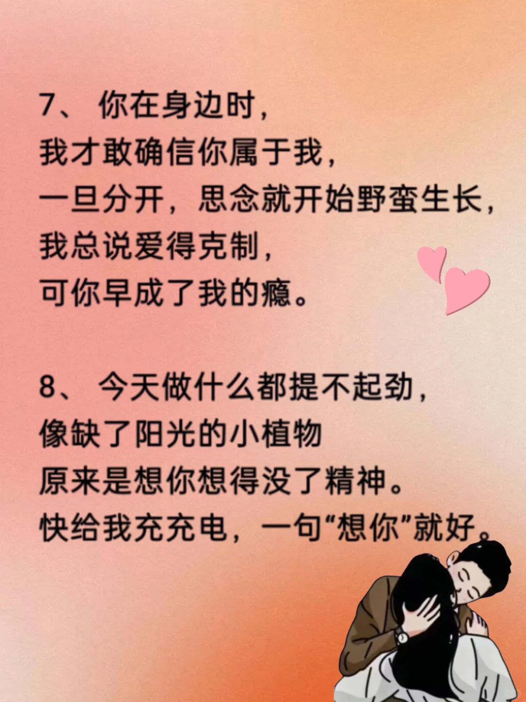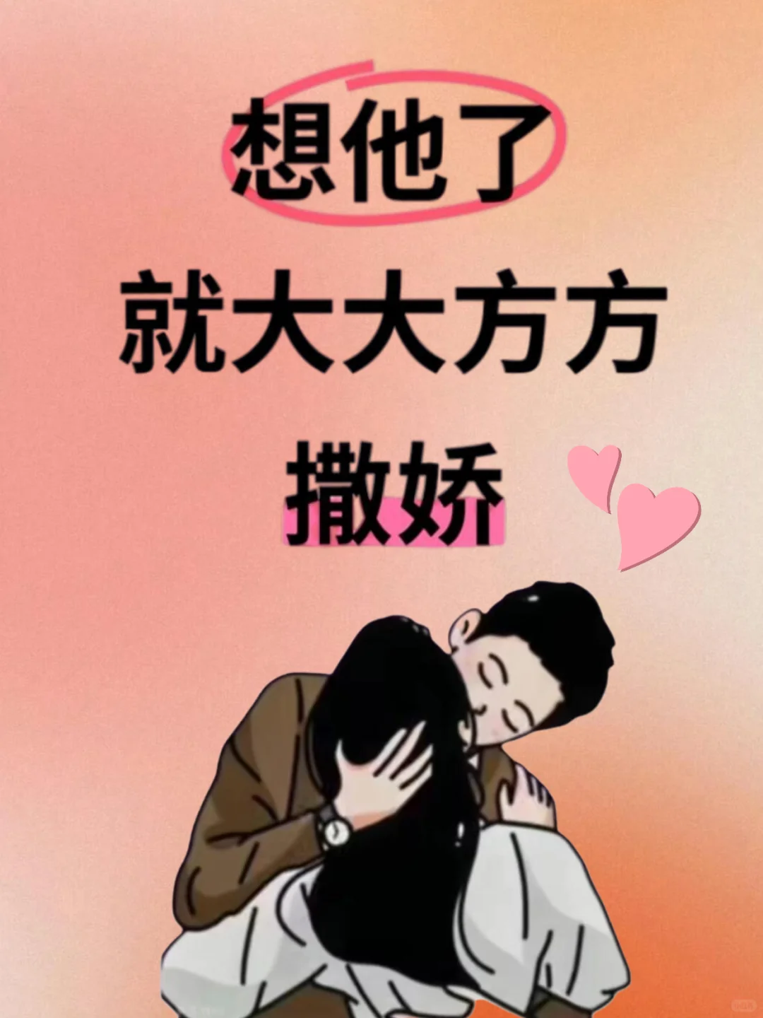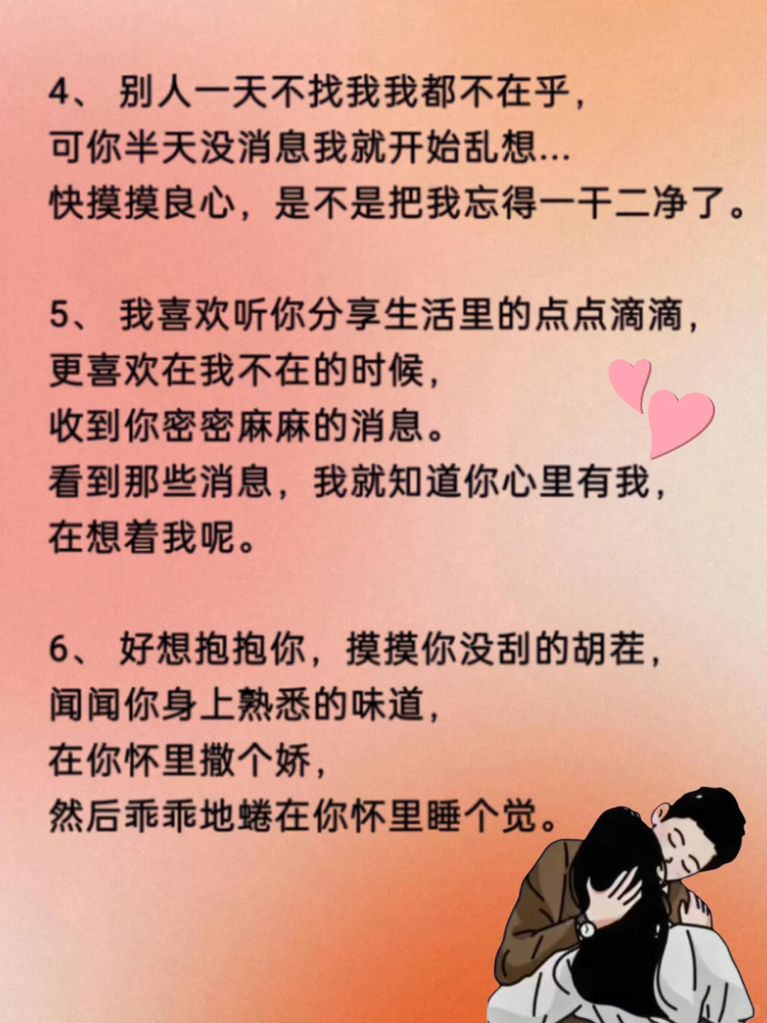 想他了,就大大方方撒娇\n1、 好想钻进你怀里,蹭蹭你的味道,像小孩一样赖着你。没什么,就是想你了,特别特别想。\n \n2、 我就是很黏人啊,就想时时刻刻缠着你,要撒娇、要亲亲、要抱抱~你不理我我就委屈...但既然你接手了,可不许退货哦!\n \n3、 见不到你,连视频和聊天都那么难...所以有空时,一定要多对我说些甜言蜜语,这样我才有继续等下去的勇气。\n \n4、 别人一天不找我我都不在乎,可你半天没消息我就开始乱想...快摸摸良心,是不是把我忘得一干二净了。\n \n5、 我喜欢听你分享生活里的点点滴滴,更喜欢在我不在的时候,收到你密密麻麻的消息。看到那些消息,我就知道你心里有我,在想着我呢。\n \n6、 好想抱抱你,摸摸你没刮的胡茬,闻闻你身上熟悉的味道,在你怀里撒个娇,然后乖乖地蜷在你怀里睡个觉。\n \n7、 你在身边时,我才敢确信你属于我,一旦分开,思念就开始野蛮生长,我总说爱得克制,可你早成了我的瘾。\n#女性觉醒 #女性智慧 #情感共鸣 #撩人情话 #高情商话术 #撒娇 #情感树洞 #情话 #爱情语录 #浪漫情话