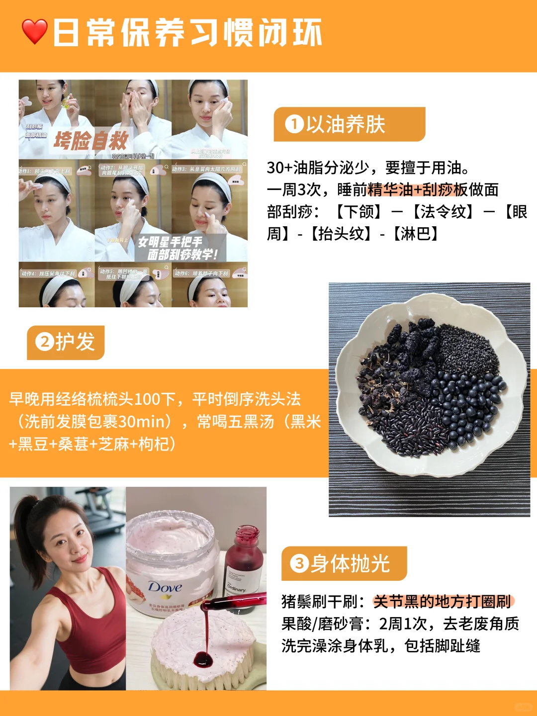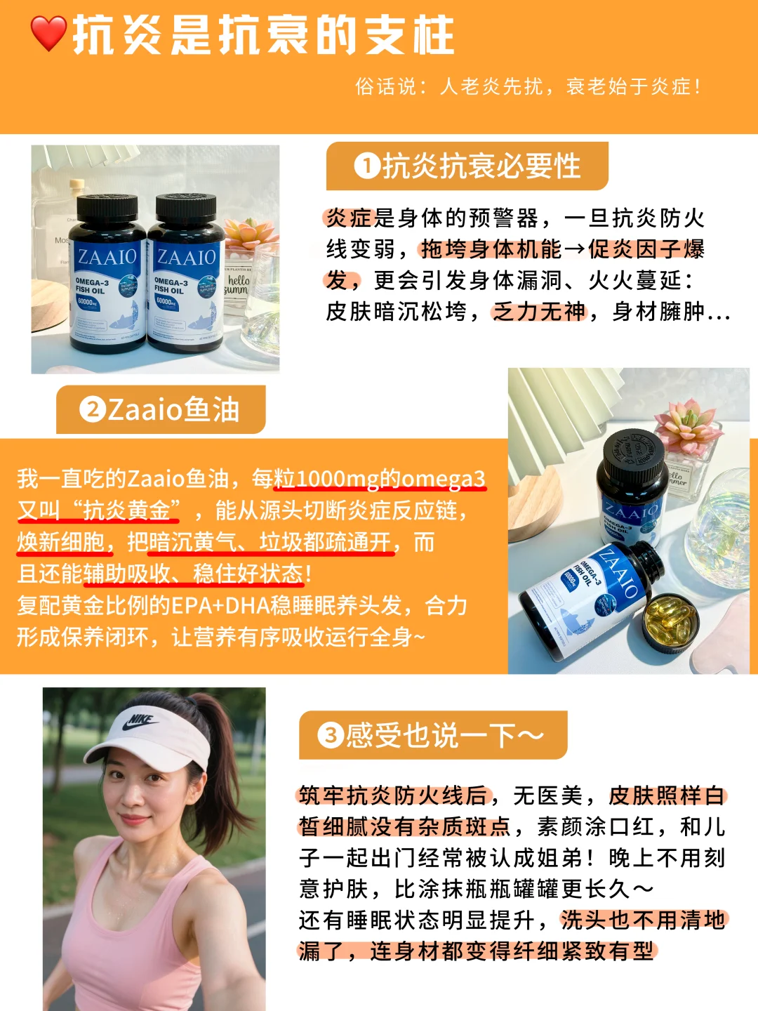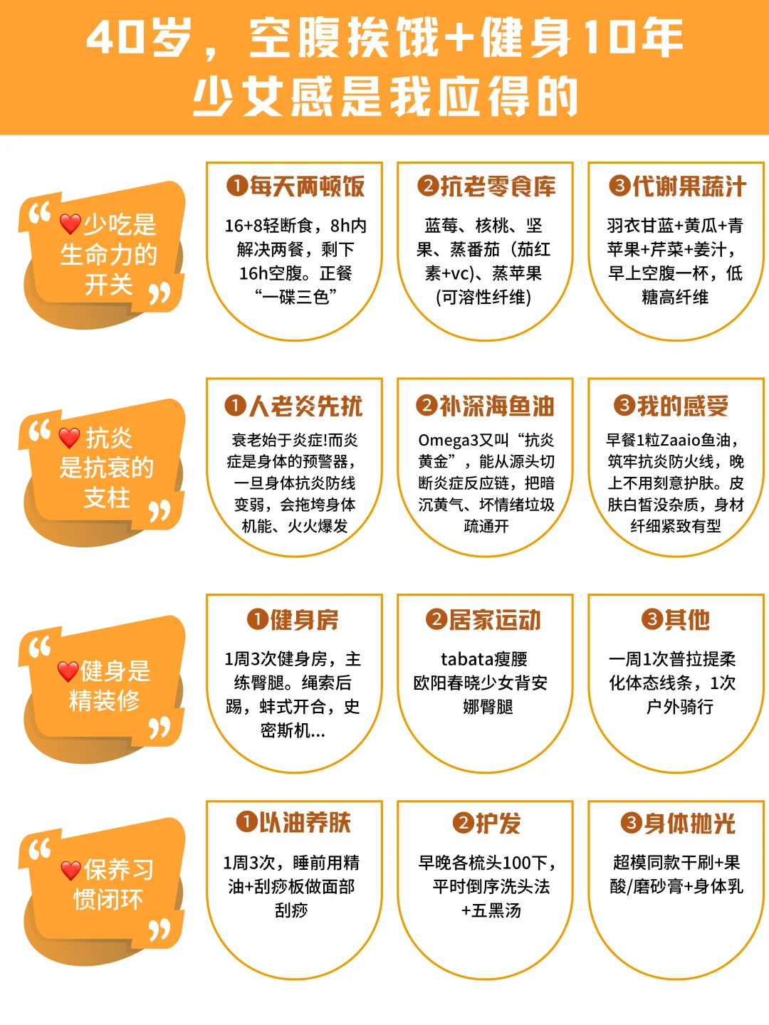 女人理想的状态:年龄成谜,身材无敌!\n-\n都说女性35+就开始走下坡路,脸黄暗沉长斑,身材走样发福,“断崖式衰老”将成为代名词…但我偏要推翻刻板印象。用10年时间、皮肤干净有弹性的逆生长辣妈!把自己雕刻成全身没有赘肉、身材凹凸有型,现在不仅身材皮肤越来越好,心态气场也直线提升!\n真的特别感谢坚持的自己,用实际行动证明了:只要肯花心思保养自己,就不必为年龄焦虑!\n-\nshare我的方法:\n🚩少吃是生命力的开关\n少吃不是傻饿,而是营养均衡、有节制规律的吃,节食反而伤代谢\n❶每天两顿饭\n16+8轻断食,8h内解决两餐,剩下16h空腹\n◽早饭:玉米/燕麦碗+鸡蛋+黑咖啡,饱腹感强不浮囊\n◽午晚饭:一碟三色,1份蛋白质(鱼虾/肉蛋)、1份粗粮、2份蔬菜。先吃菜,对体重和血糖友好\n❷抗老零食库\n蓝莓、核桃、坚果、蒸番茄(茄红素+vc)、蒸苹果(可溶性纤维)\n❸代谢果蔬汁\n羽衣甘蓝+黄瓜+青苹果+芹菜+姜汁,早上空腹一杯,低糖高纤维\n-\n🚩抗炎是抗衰的支柱\n俗话说:人老炎先扰,衰老始于炎症!而炎症是身体的预警器,一旦炎抗炎防火线变弱,拖垮身体机能→促炎因子爆发,更会引发身体漏洞、火火蔓延→皮肤暗沉松垮,乏力无神,身材臃肿...所以我把抗炎抗衰当作保养的重点!\n我一直吃的Zaaio鱼油,每粒1000mg的omega3又叫“抗炎黄金”,能从源头切断炎症反应链,焕新细胞,把暗沉黄气、垃圾都疏通开,而且还能辅助吸收、稳住好状态!复配黄金比例的EPA+DHA稳睡眠养头发,合力形成保养闭环,让营养有序吸收运行全身~\n-\n感受也说一下~筑牢抗炎防火线后,无医美,皮肤照样白皙细腻没有杂质斑点,素颜涂口红,和儿子一起出门经常被认成姐弟!晚上不用刻意护肤,比涂抹瓶瓶罐罐更长久~还有睡眠状态明显提升,洗头也不用清地漏了,连身材都变得纤细紧致有型\n-\n🚩健身是精装修\n一周3次健身房:主臀腿,具体看图\n居家:tabata瘦腰+欧阳春晓少女背+安娜塑形\n一周1次普拉提,1次骑行\n-\n🚩保养习惯闭环\n以油养肤:一周3次,睡前精油+面部刮痧\n护发:早晚梳头100下,平时倒序洗头法+五黑汤\n身体抛光:干刷+果酸/磨砂膏+身体乳\n#保养 #护肤 #zaaio鱼油 #深海鱼油 #抗炎
